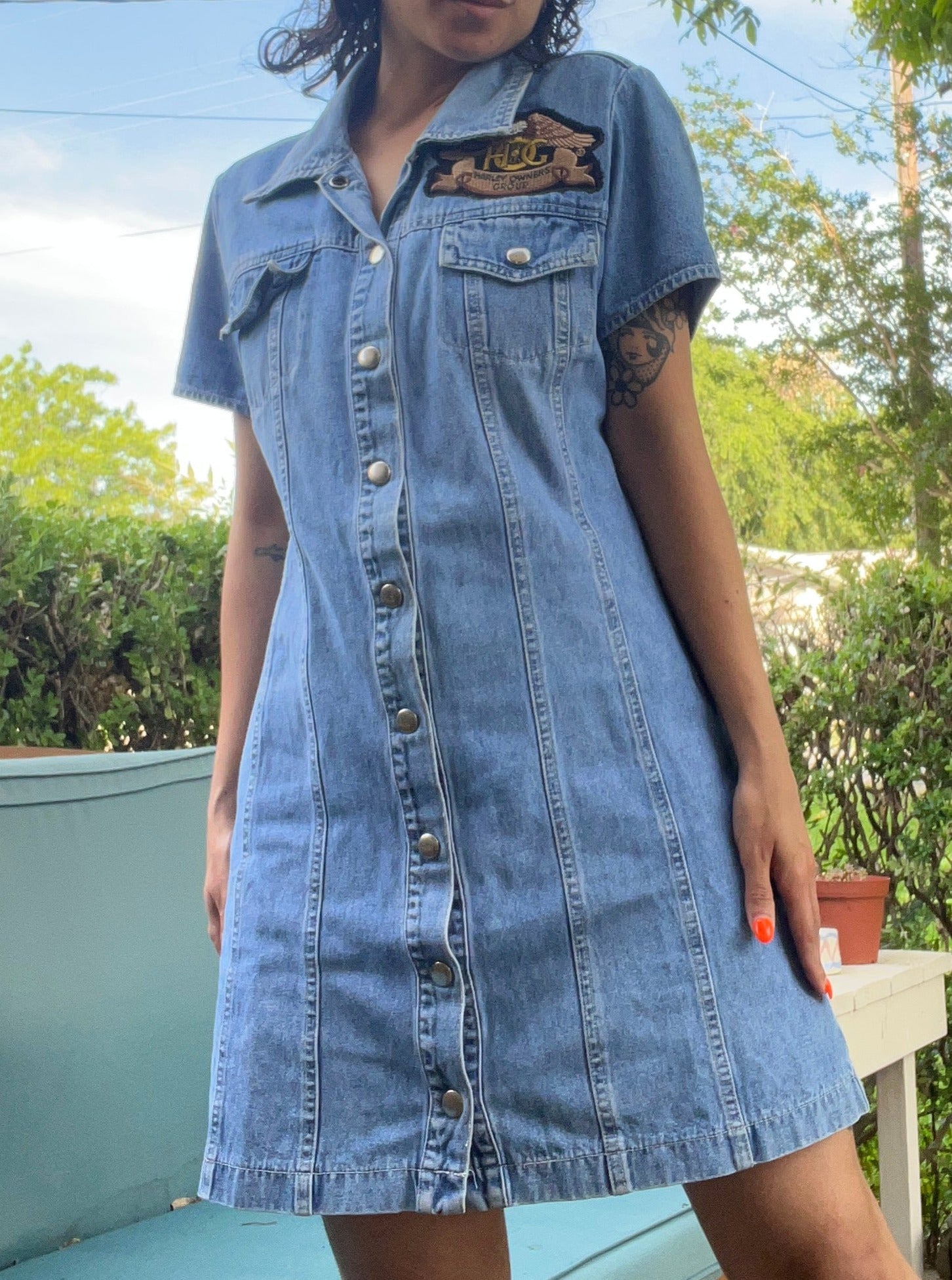 Vintage 90s denim mini dress with silver snap buttons and a Harley patch added by us. Bound to be your new summer staple! Has a lil buckle on the back to cinch the waist. By 5.7.5. Tag size 5, 100% Cotton. Best fits a S/M. Seen on Justina (fit was loose).