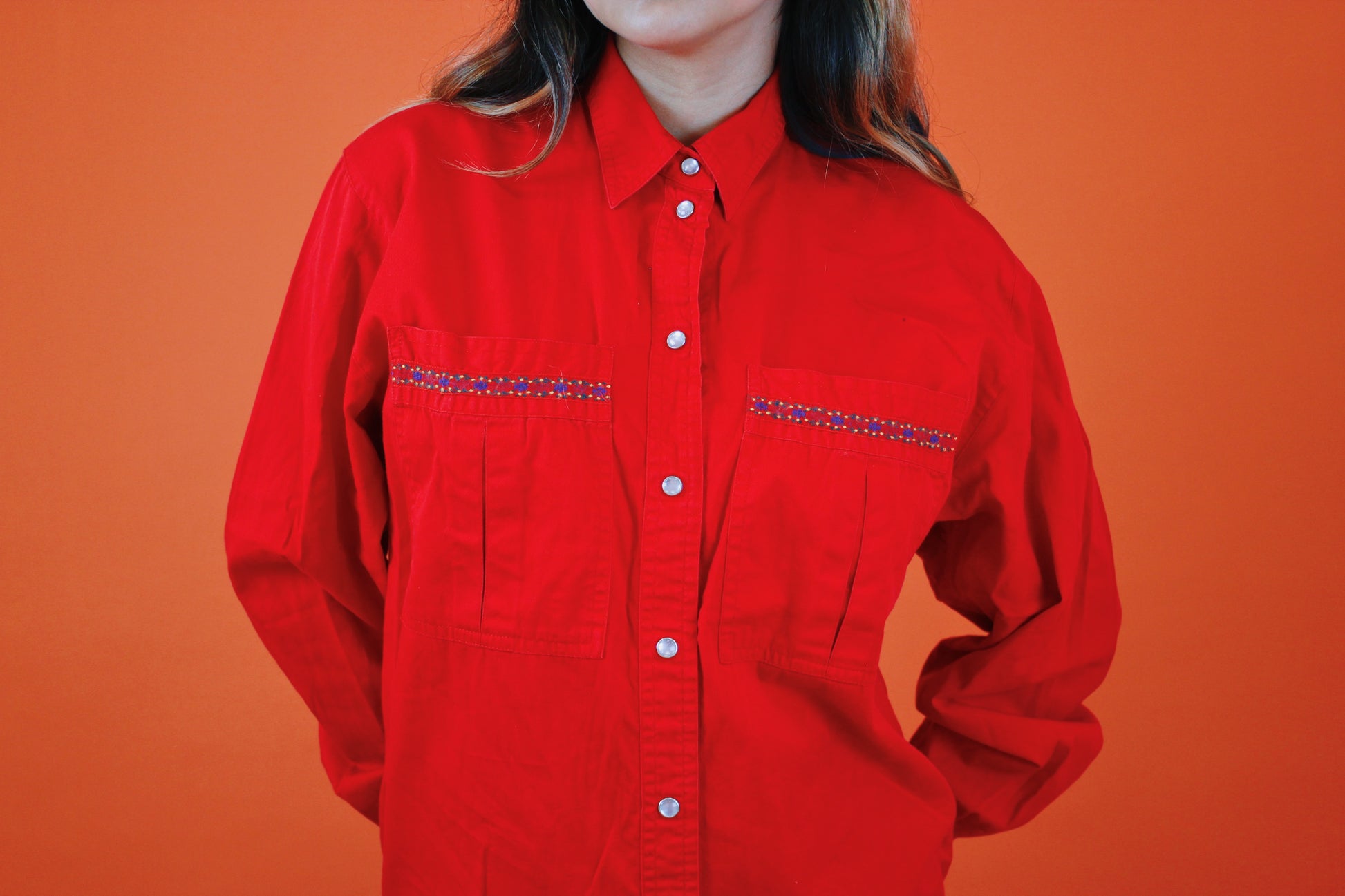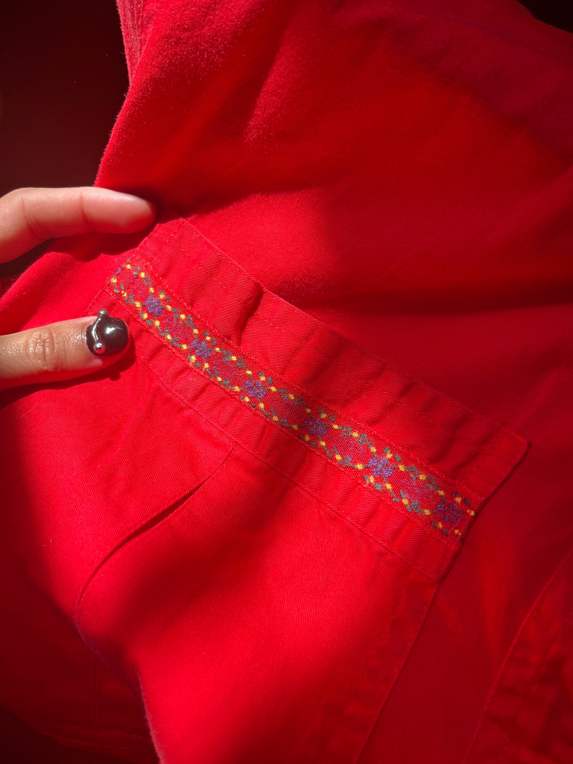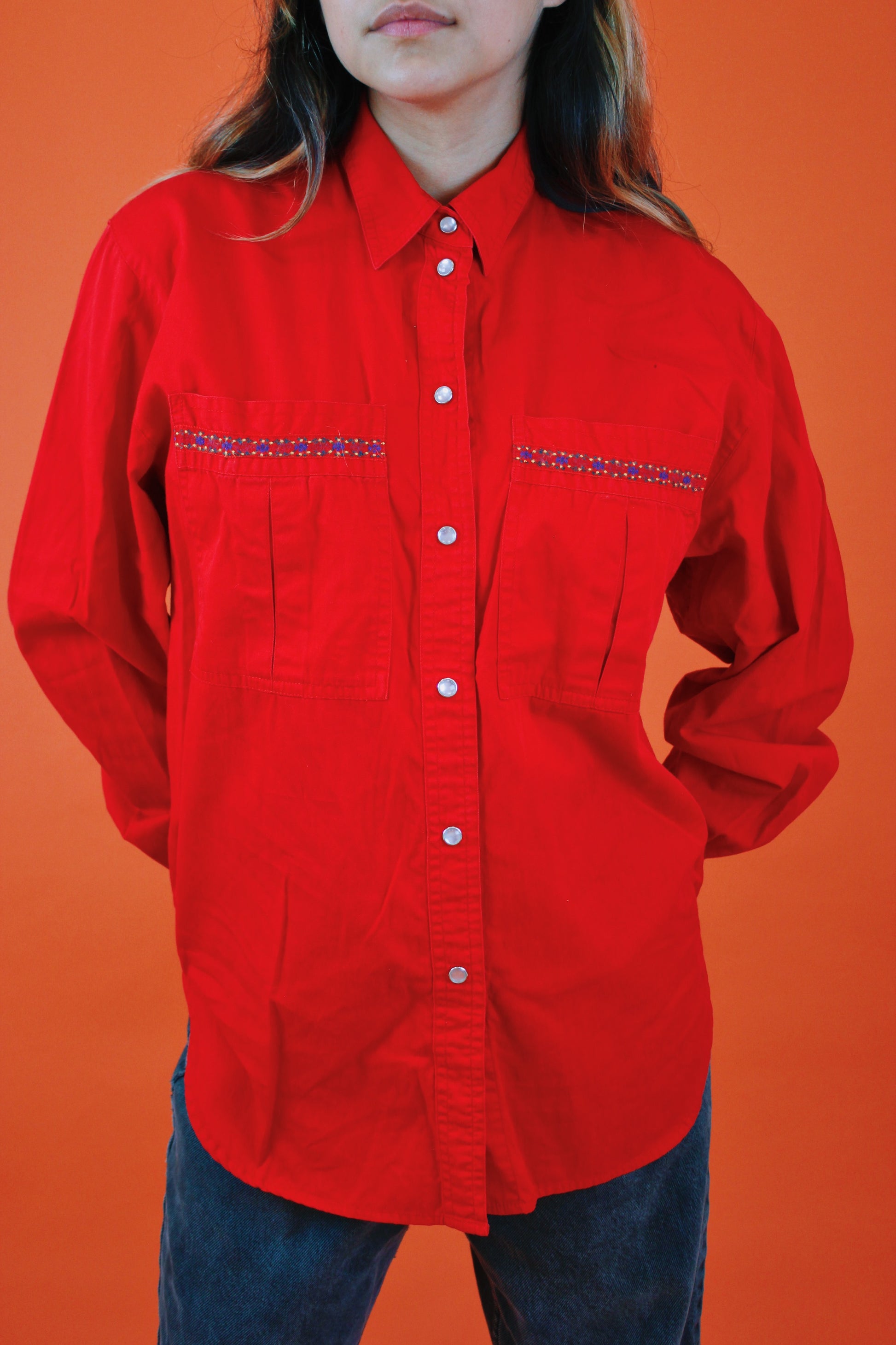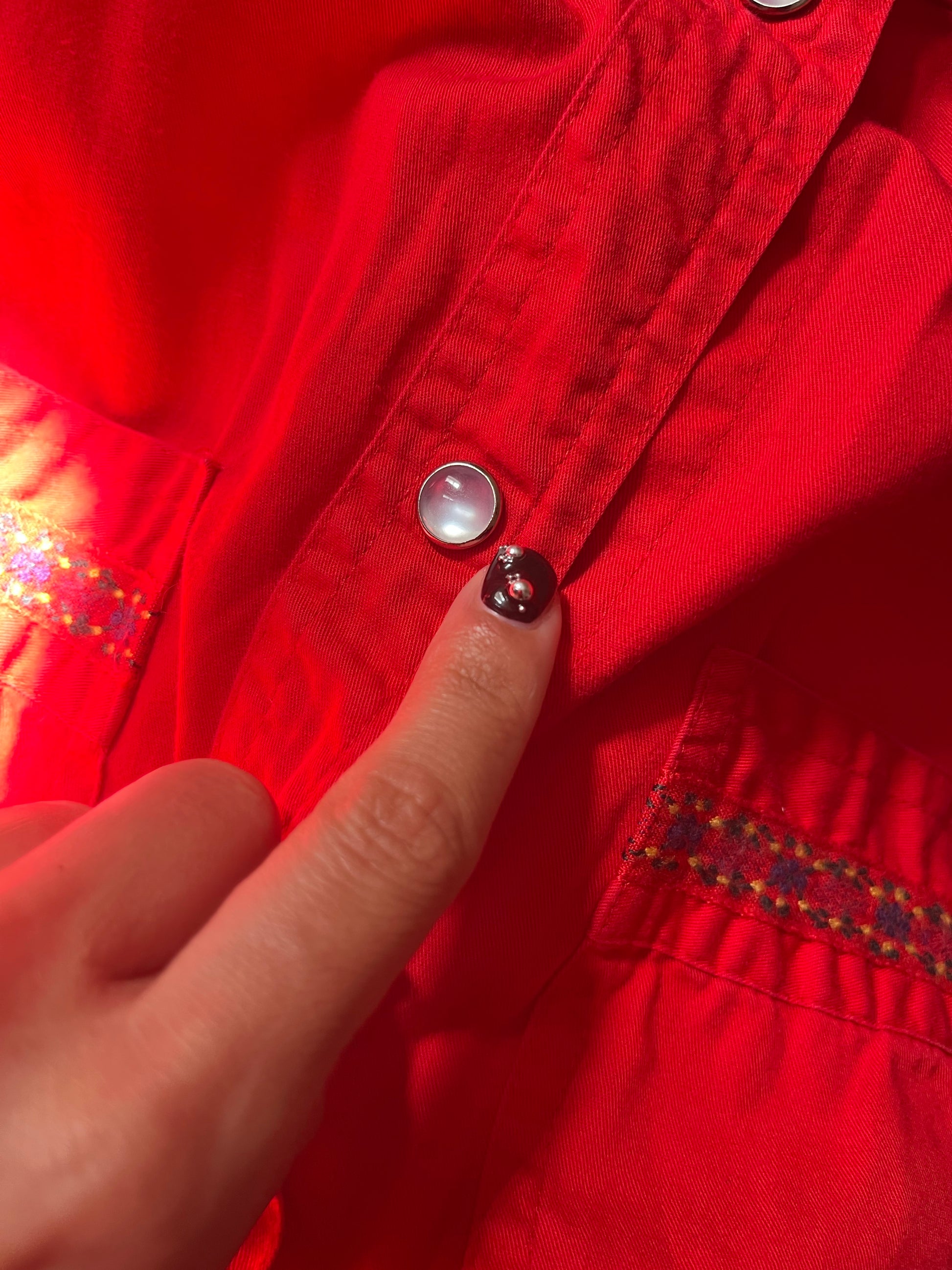Vintage 90s bright cherry red pearl snap with embroidered details along the pockets. Love the moonstone snaps. By Lizsport. Tag size M, 100% Cotton. Best fits a M-L. Seen on Erika (fit was baggy).
