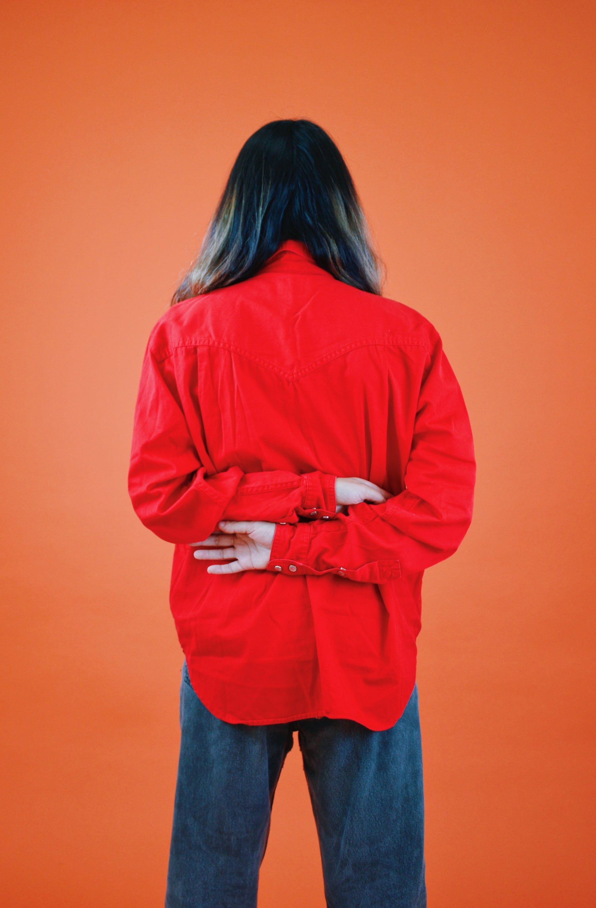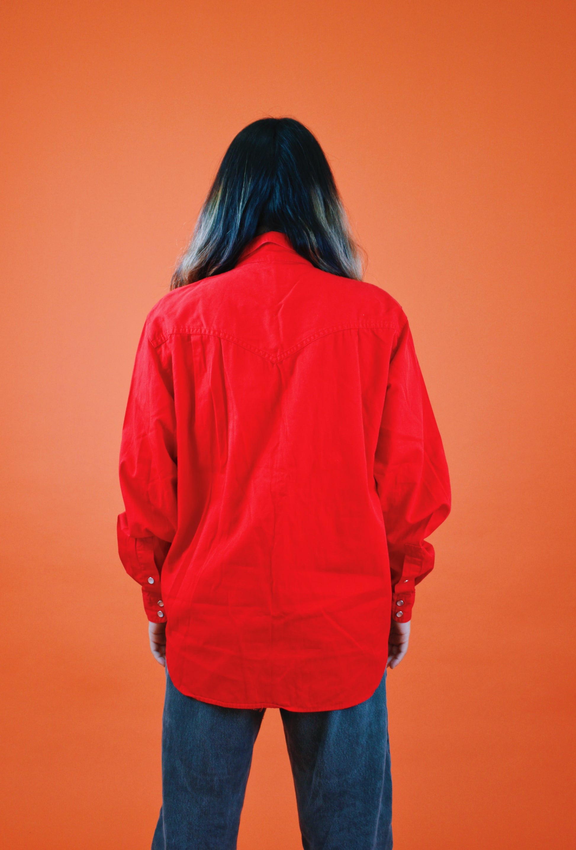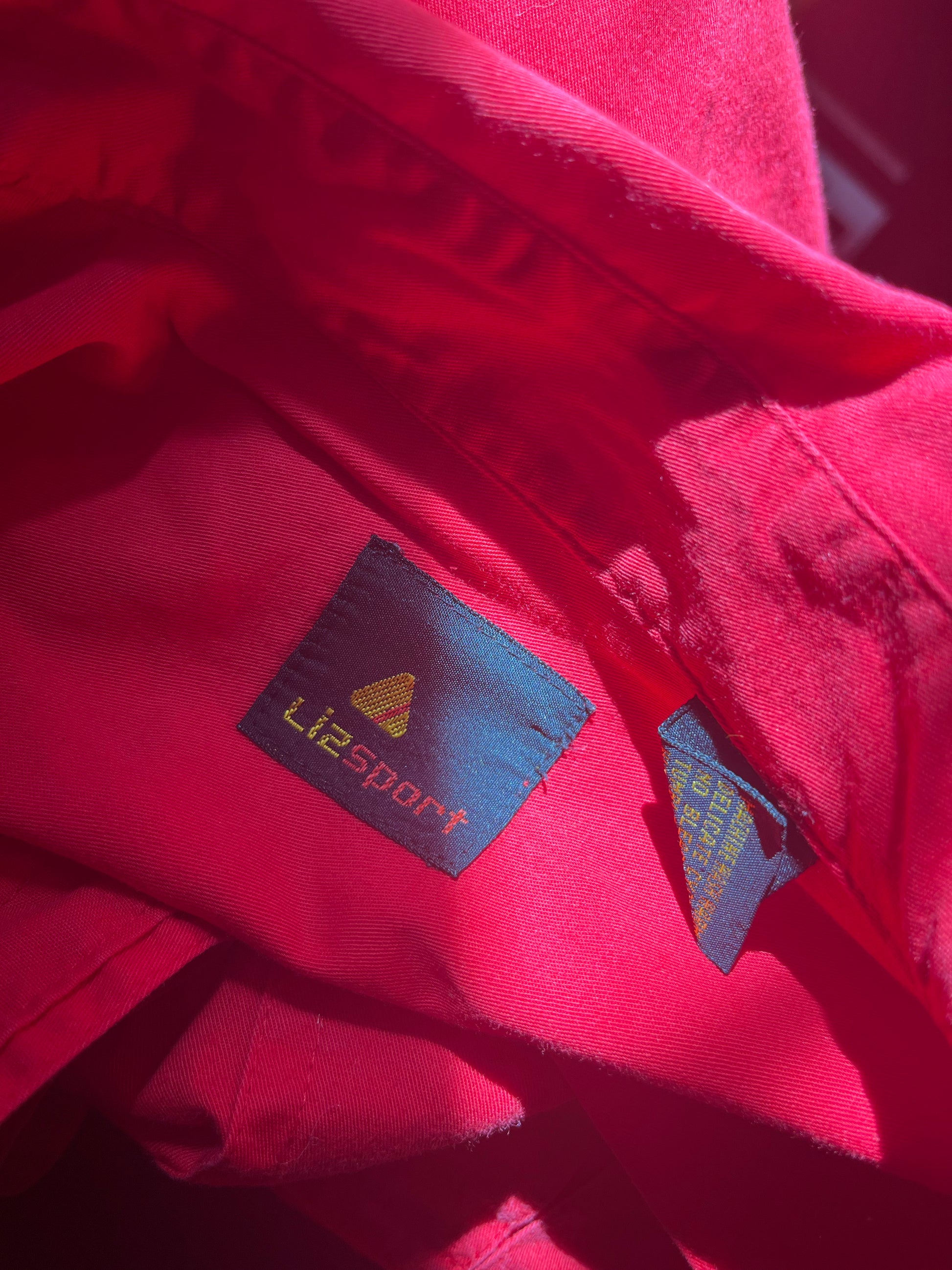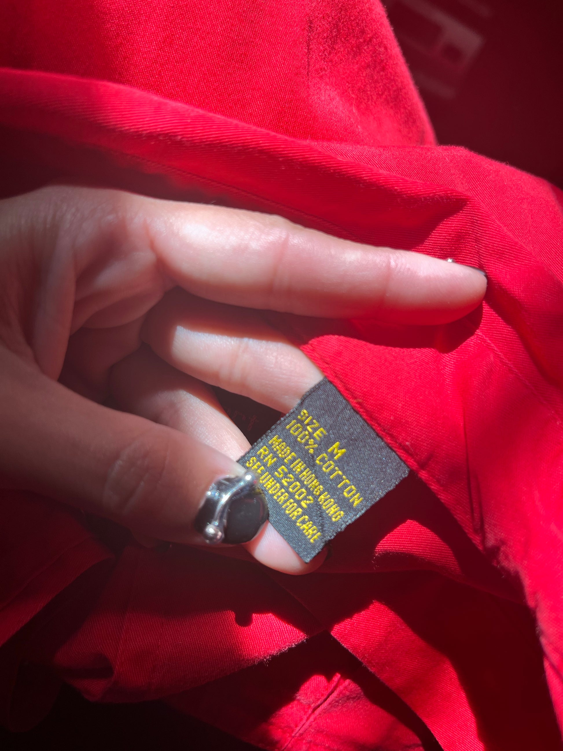 Vintage 90s bright cherry red pearl snap with embroidered details along the pockets. Love the moonstone snaps. By Lizsport. Tag size M, 100% Cotton. Best fits a M-L. Seen on Erika (fit was baggy).