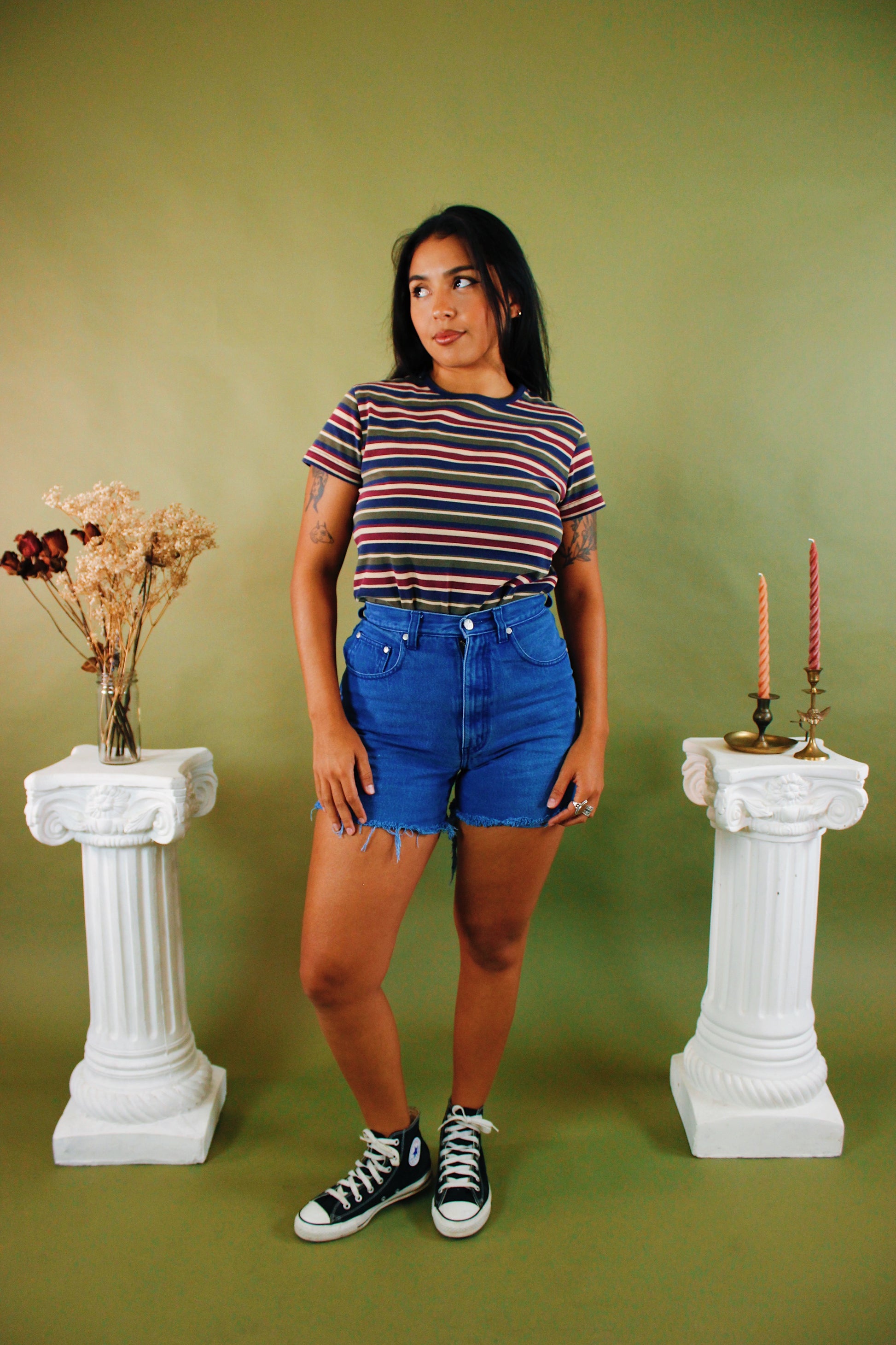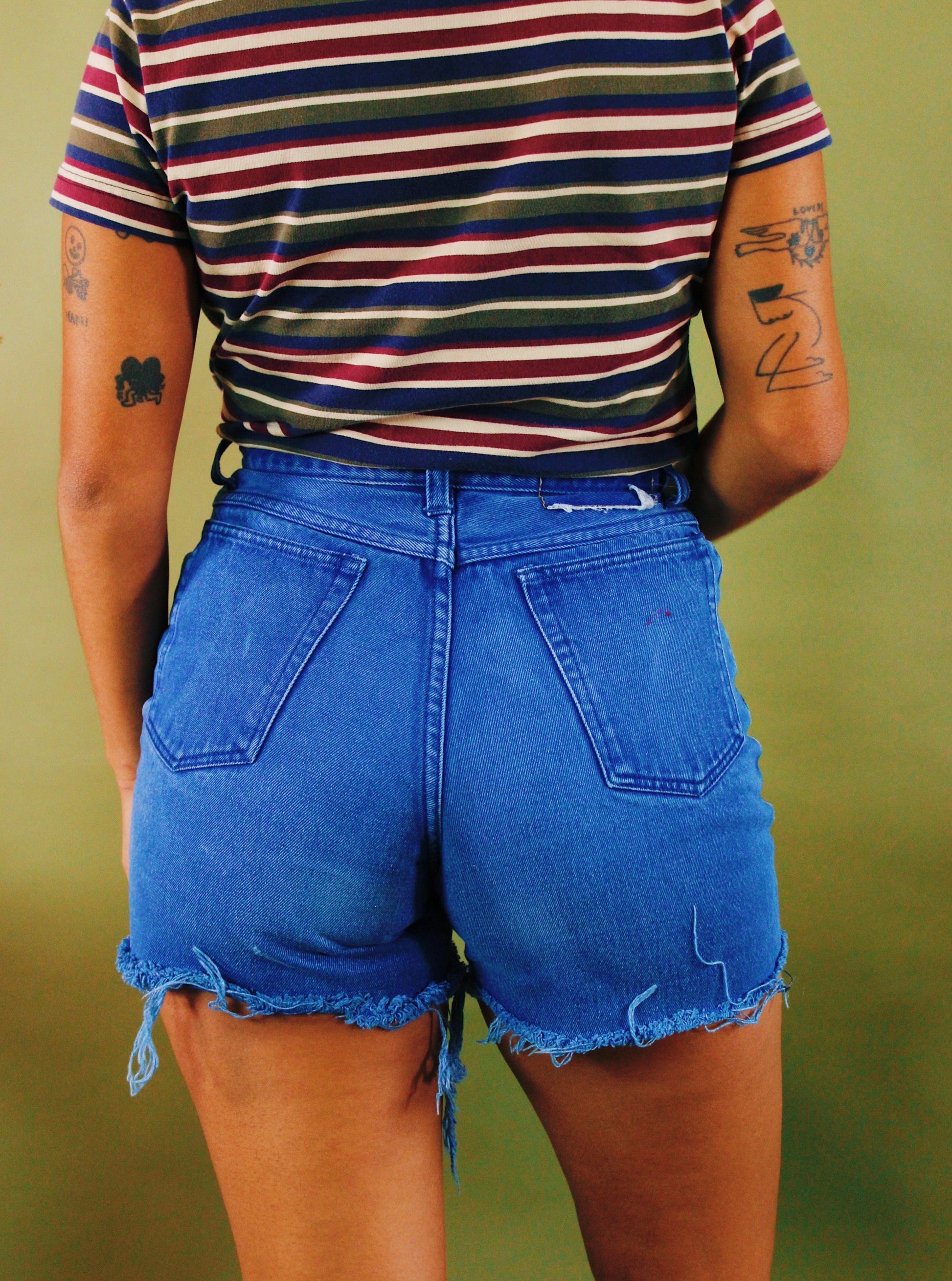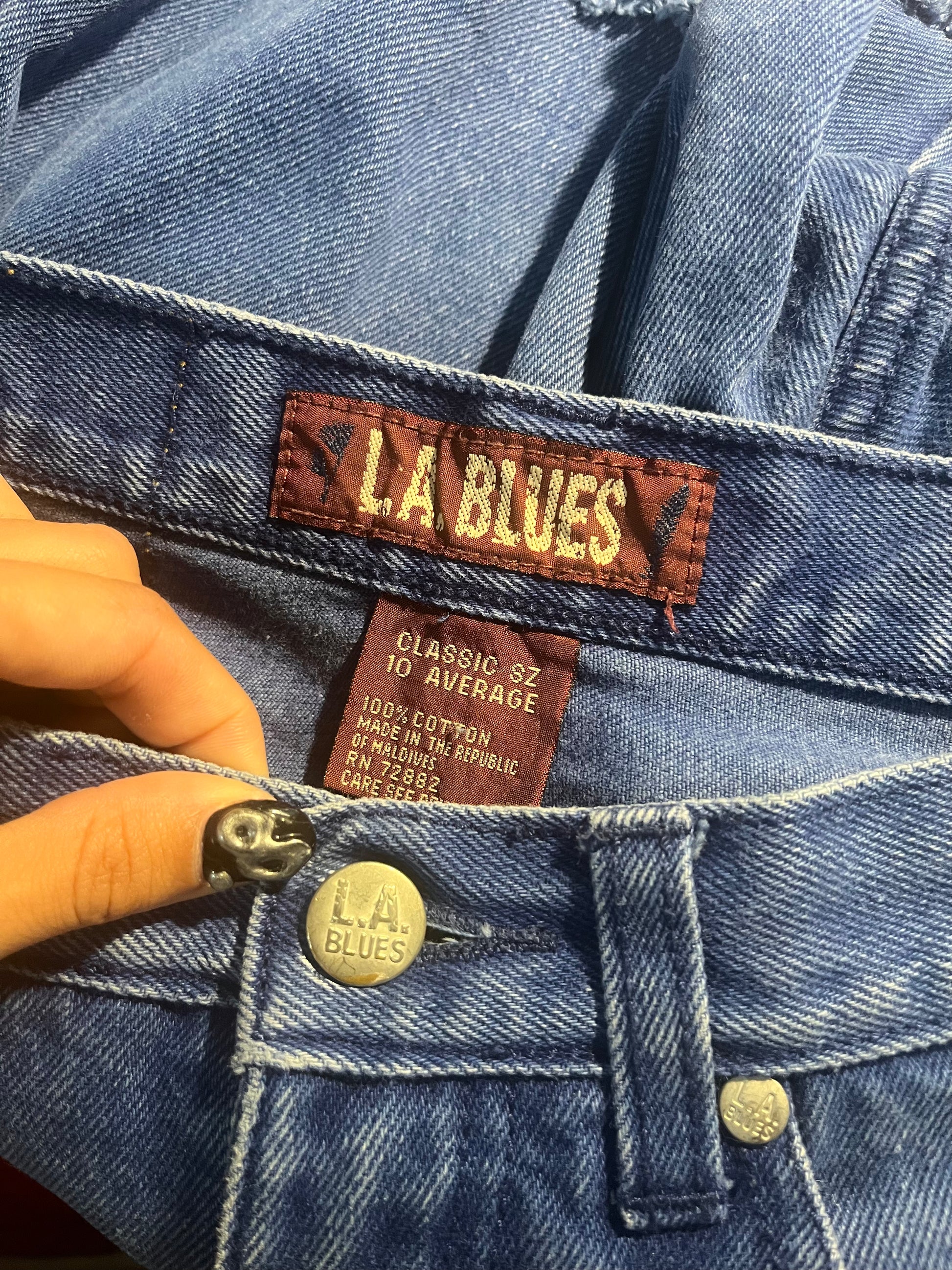 Vintage 90s washed blue denim cutoff shorts. Lovely blue color with the perfect high waisted fit! By L.A. Blues. Tag size 10, 100% Cotton. Best fits a S-M. Seen on Sam.