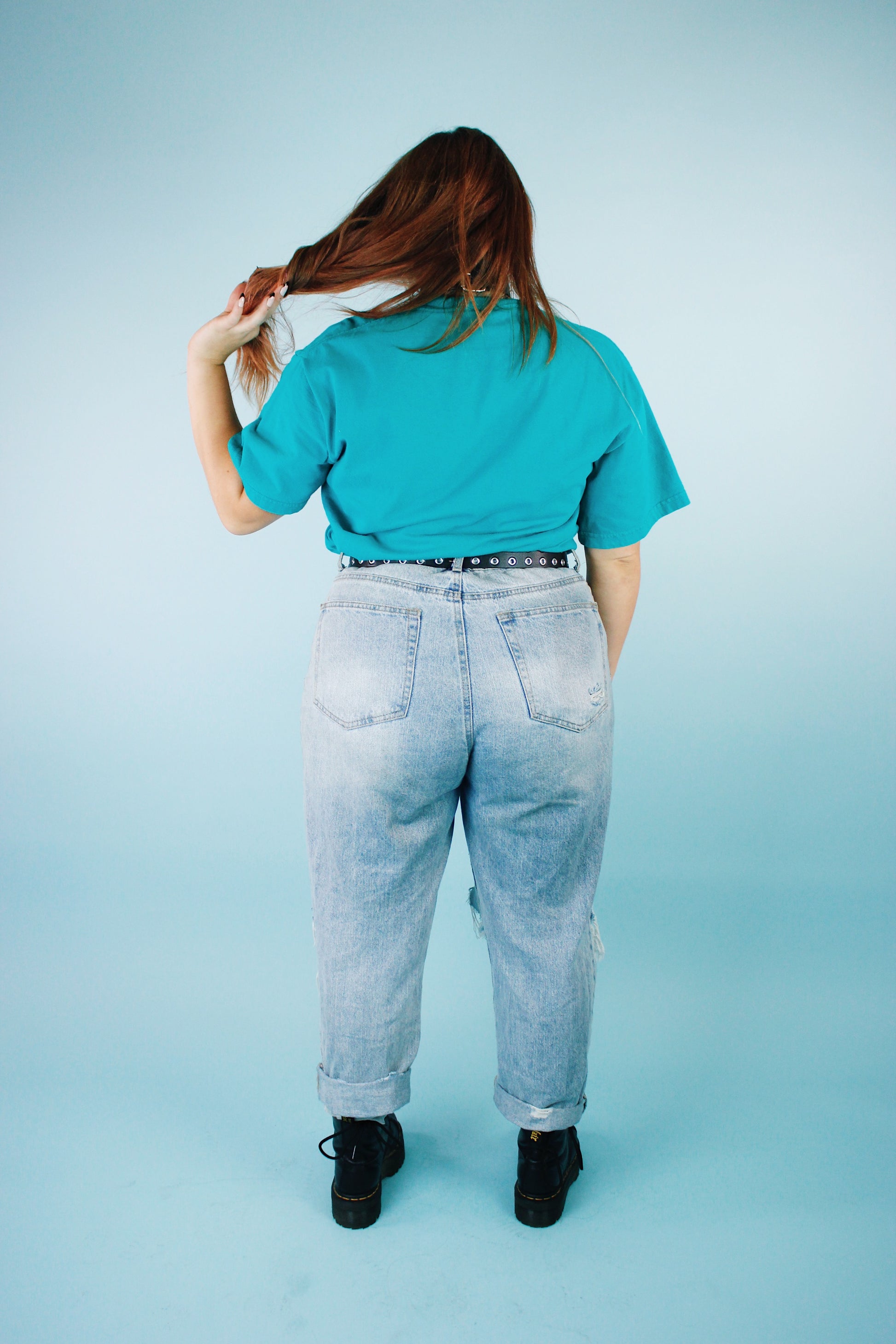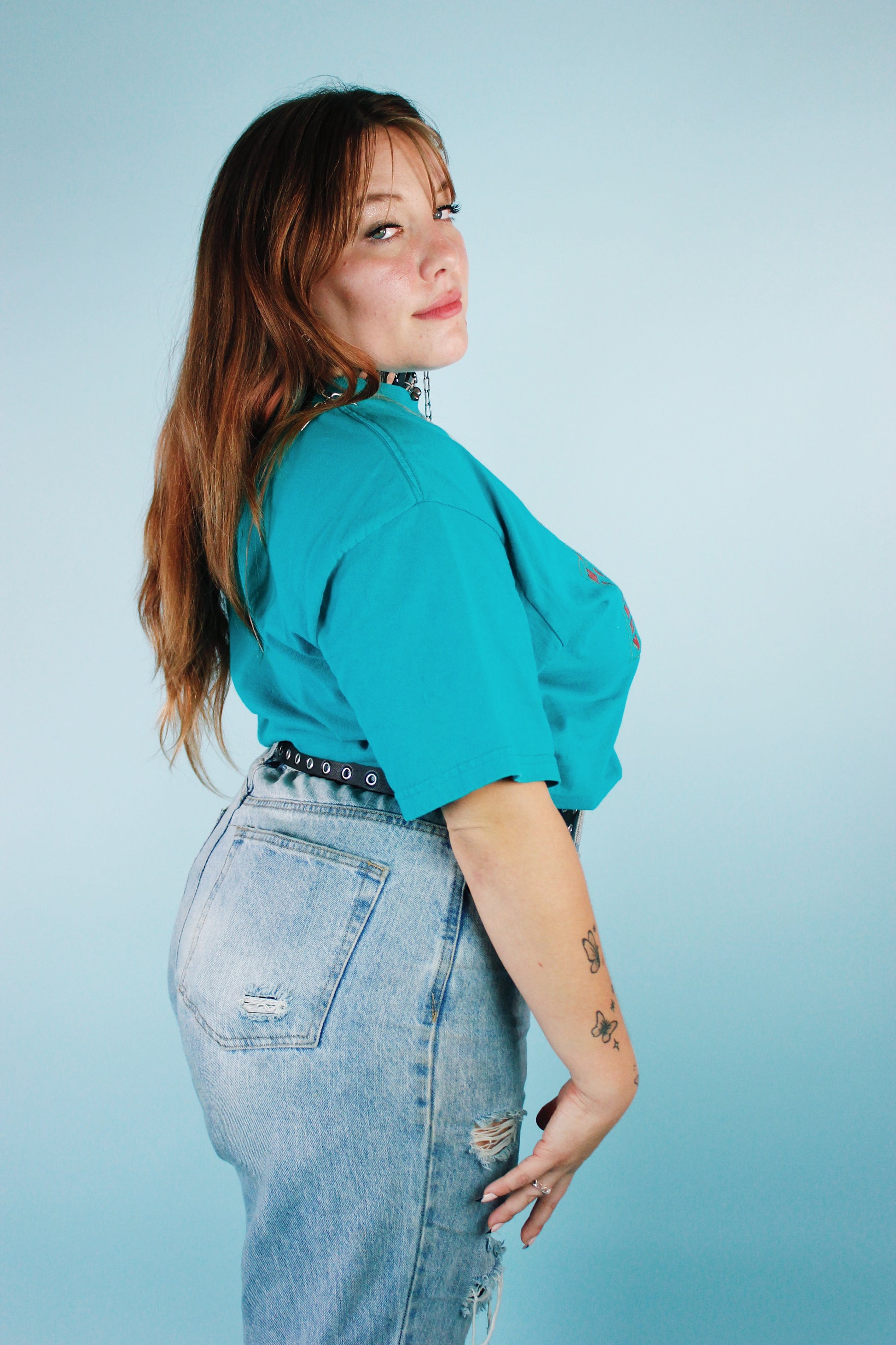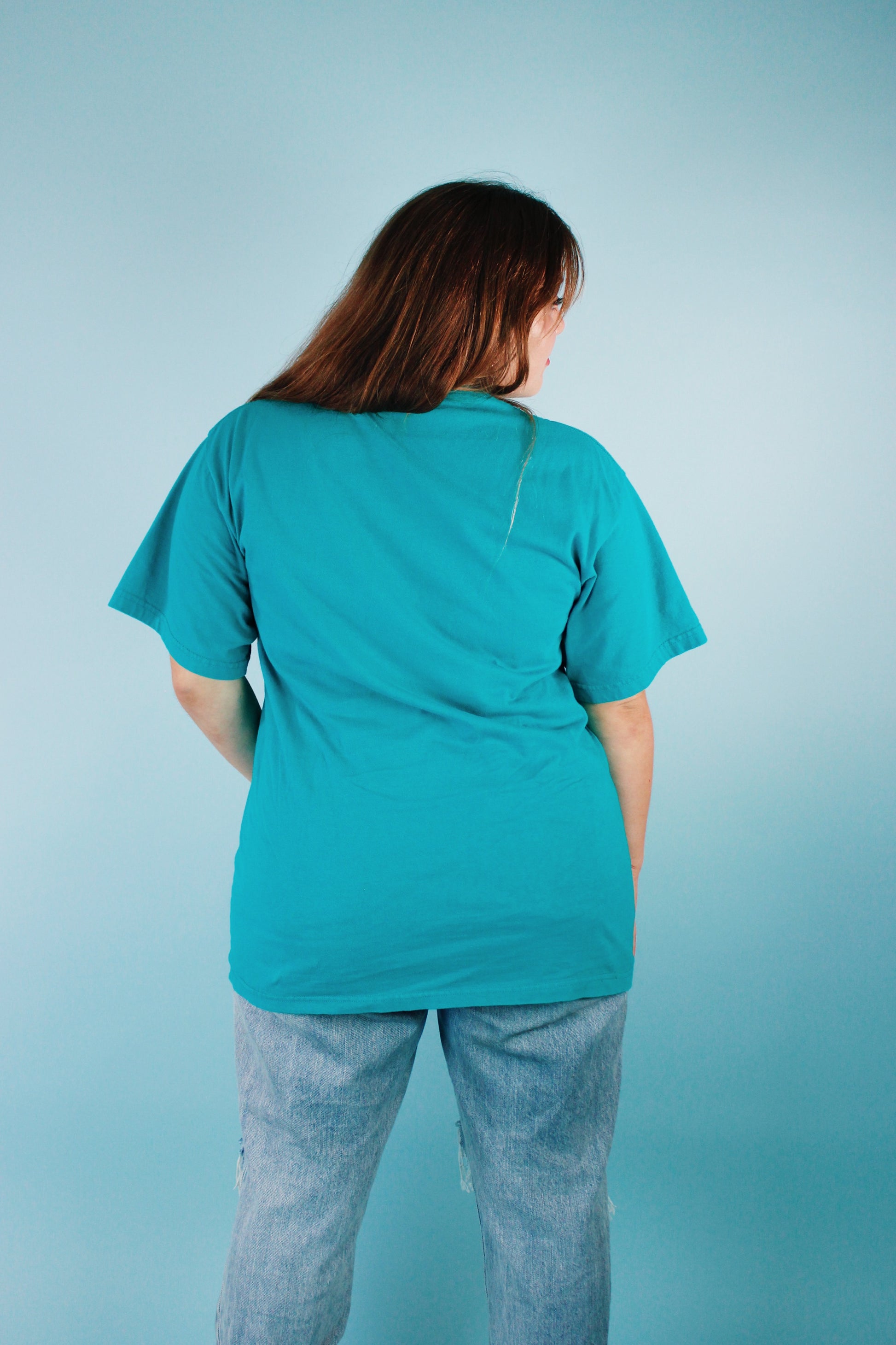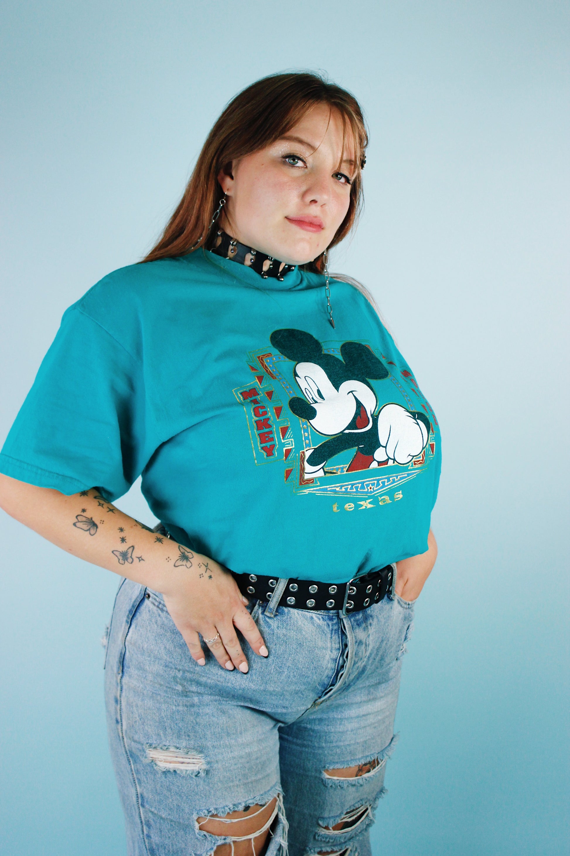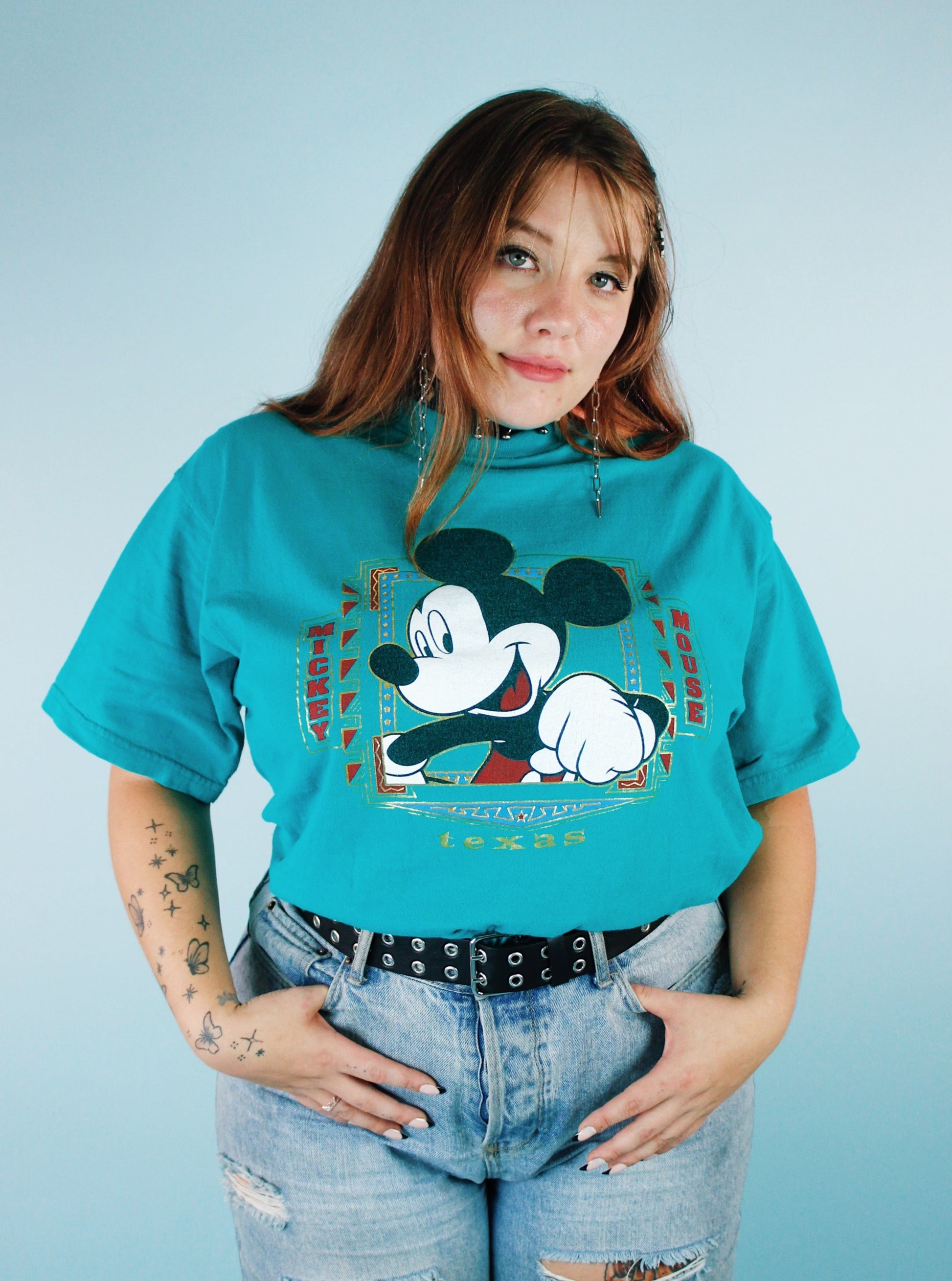 Vintage 90s teal mickey mouse "texas" graphic tee with a foil gold frame. Printed on a Tultex tee. Tag size XL, 100% Cotton. Best fits an XL. Seen on Amira.