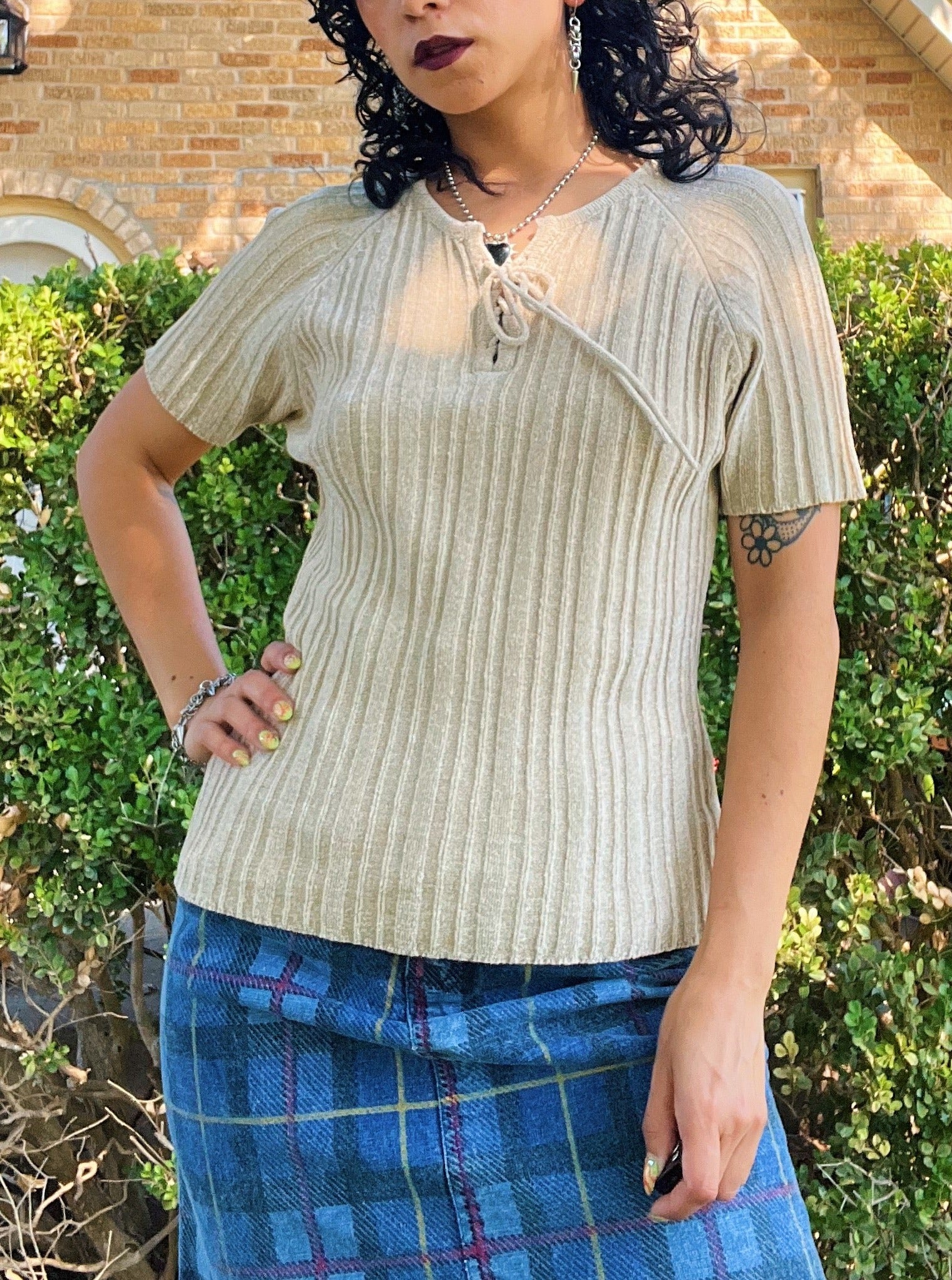 Vintage 90s ribbed neutral oatmeal top with a lace front chest. Has a super soft, plush feel. Lots of stretch to accomodate different sizing. By No Boundaries. Tag size S (3/5), 60% Acrylic 35% Rayon 5% Spandex. Made in Korea. Best fits a S-L. Seen on Justina (fit was loose on the chest).