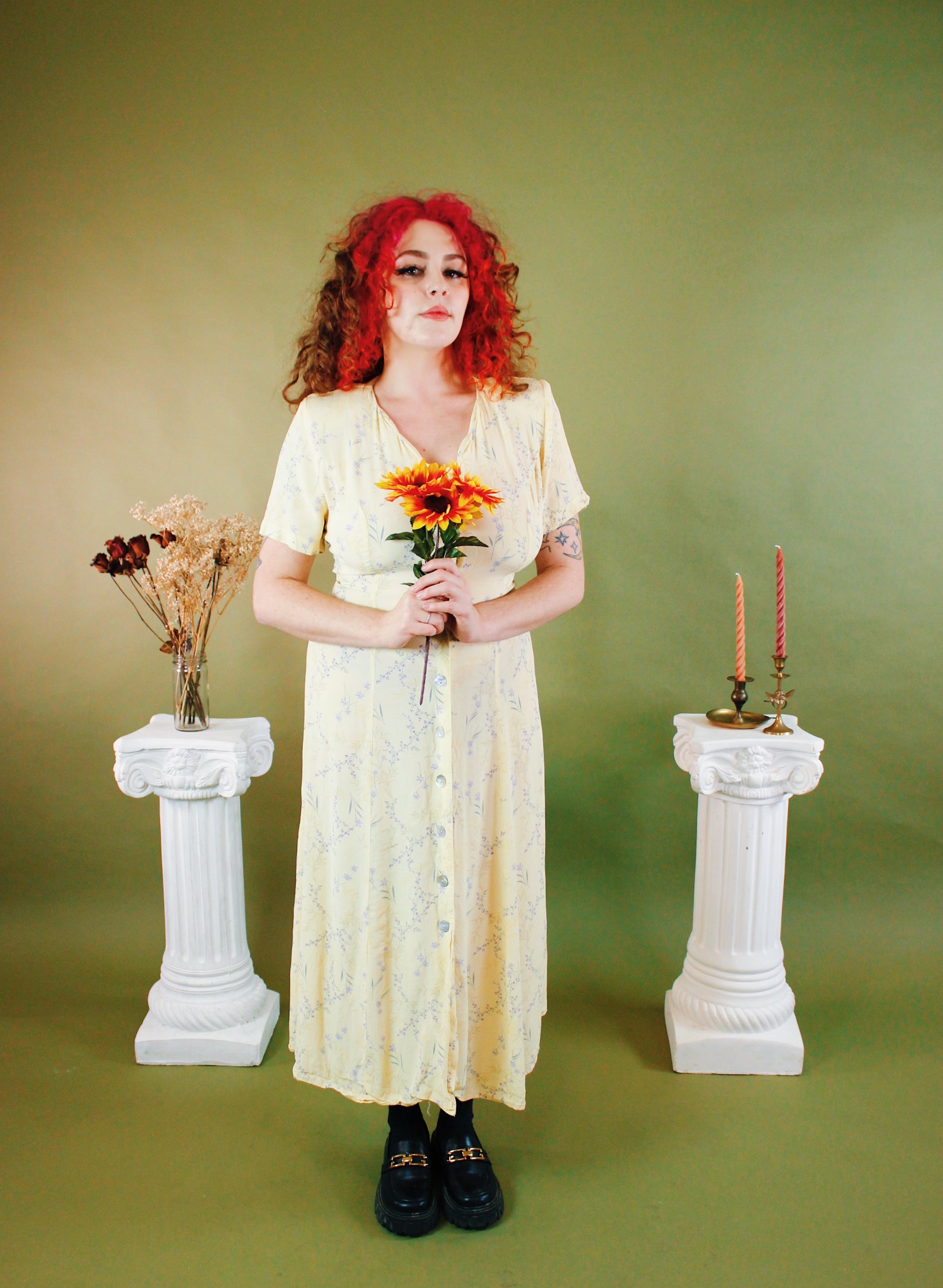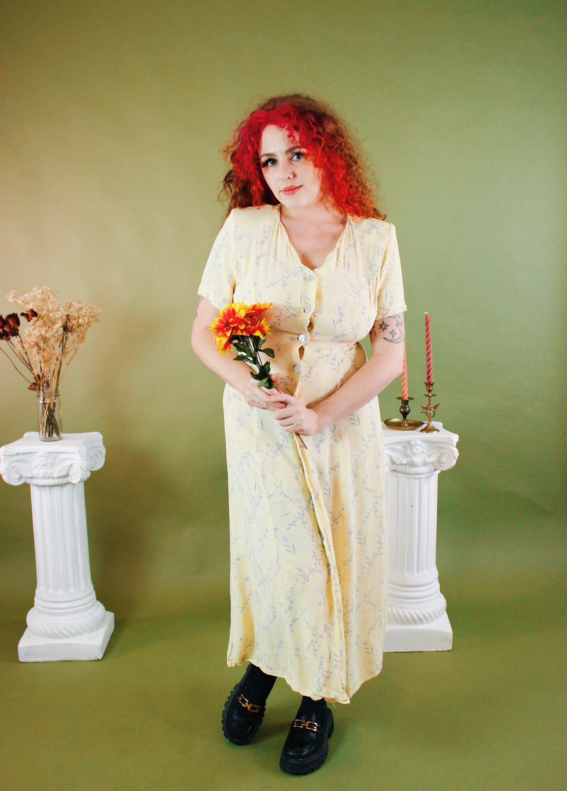 Vintage 90s baby yellow floral print maxi dress. Classic button up front and corseted tie back. By Dress Barn. Tag size 10, 100% Rayon. Best fits a M. Seen on Bailey.