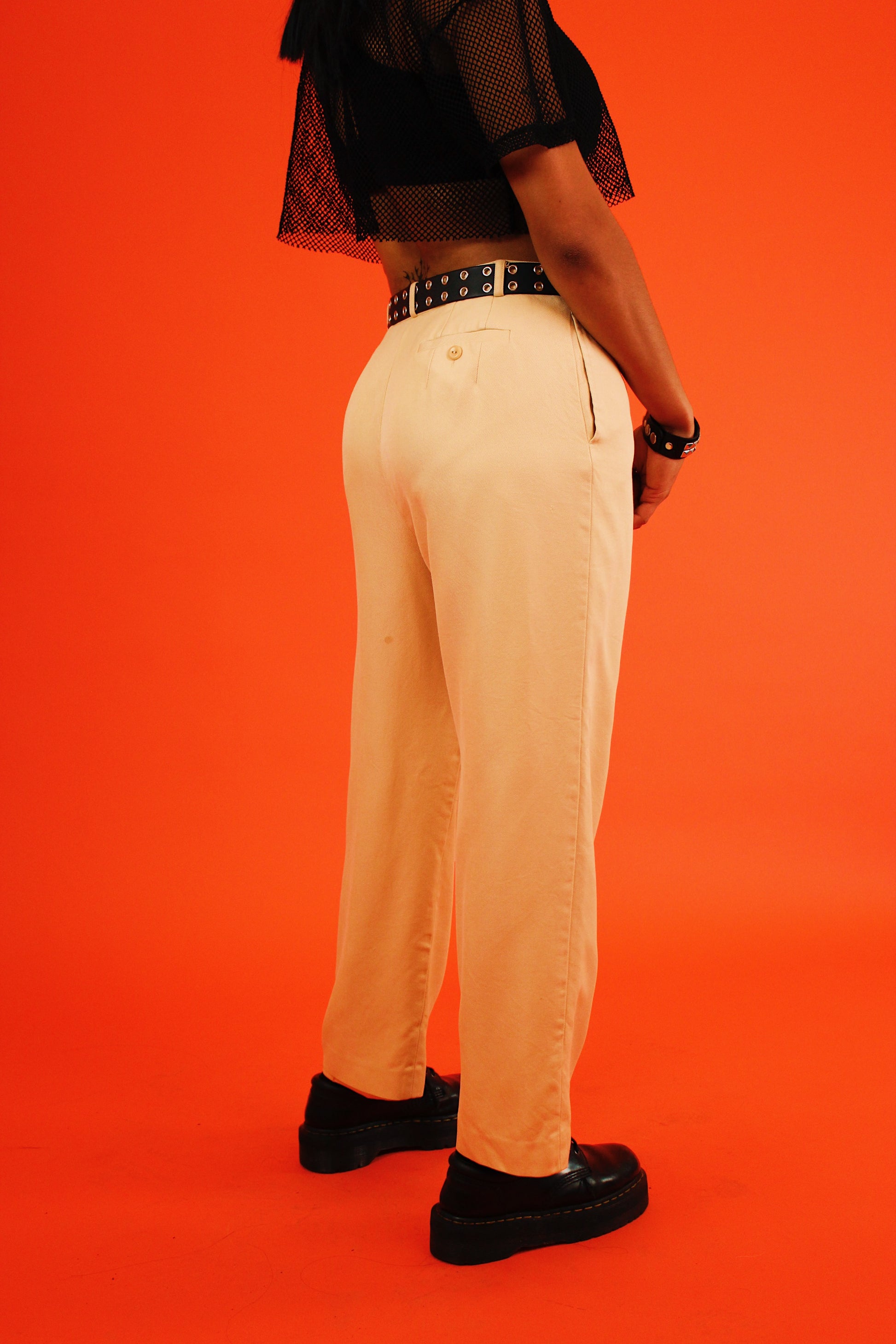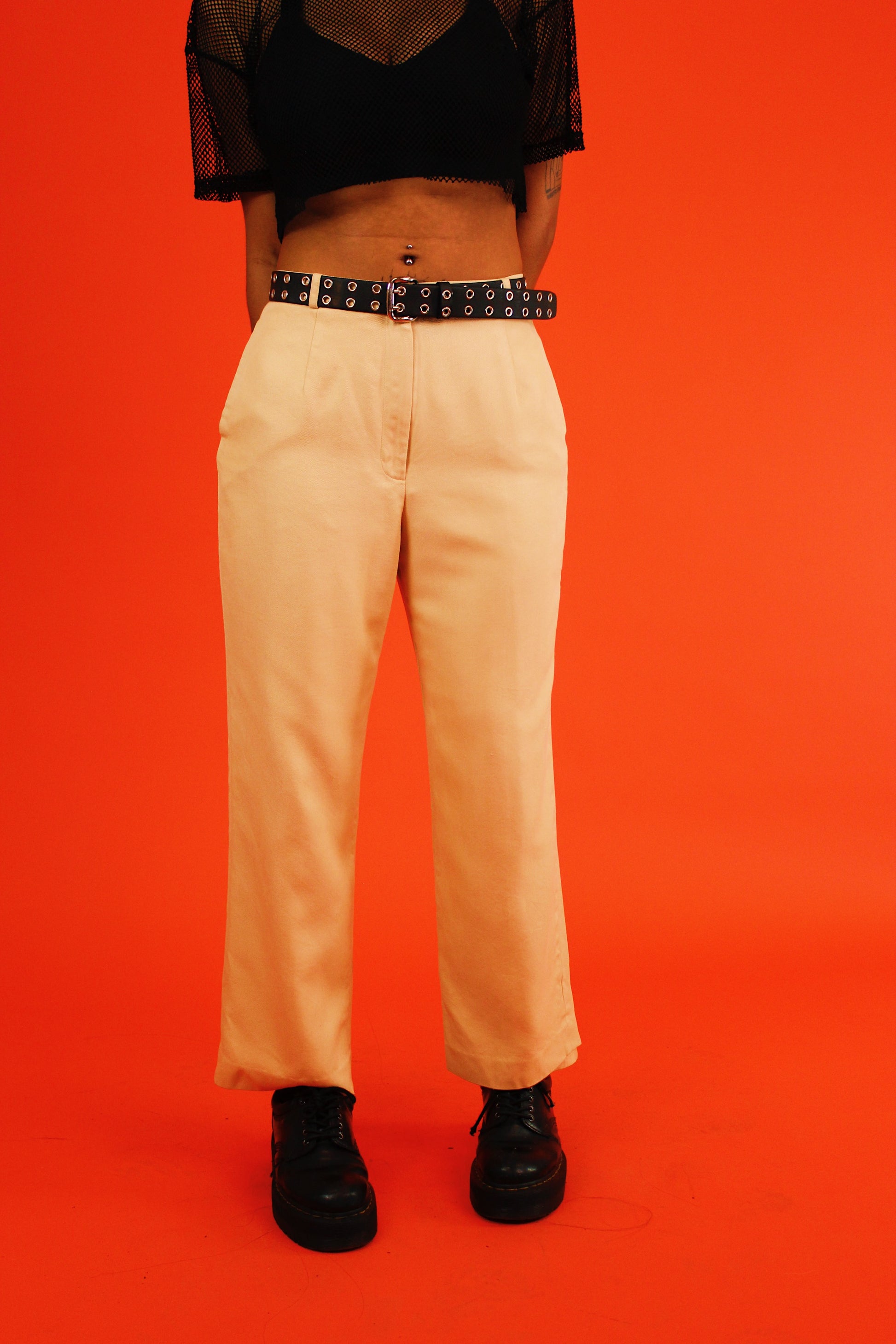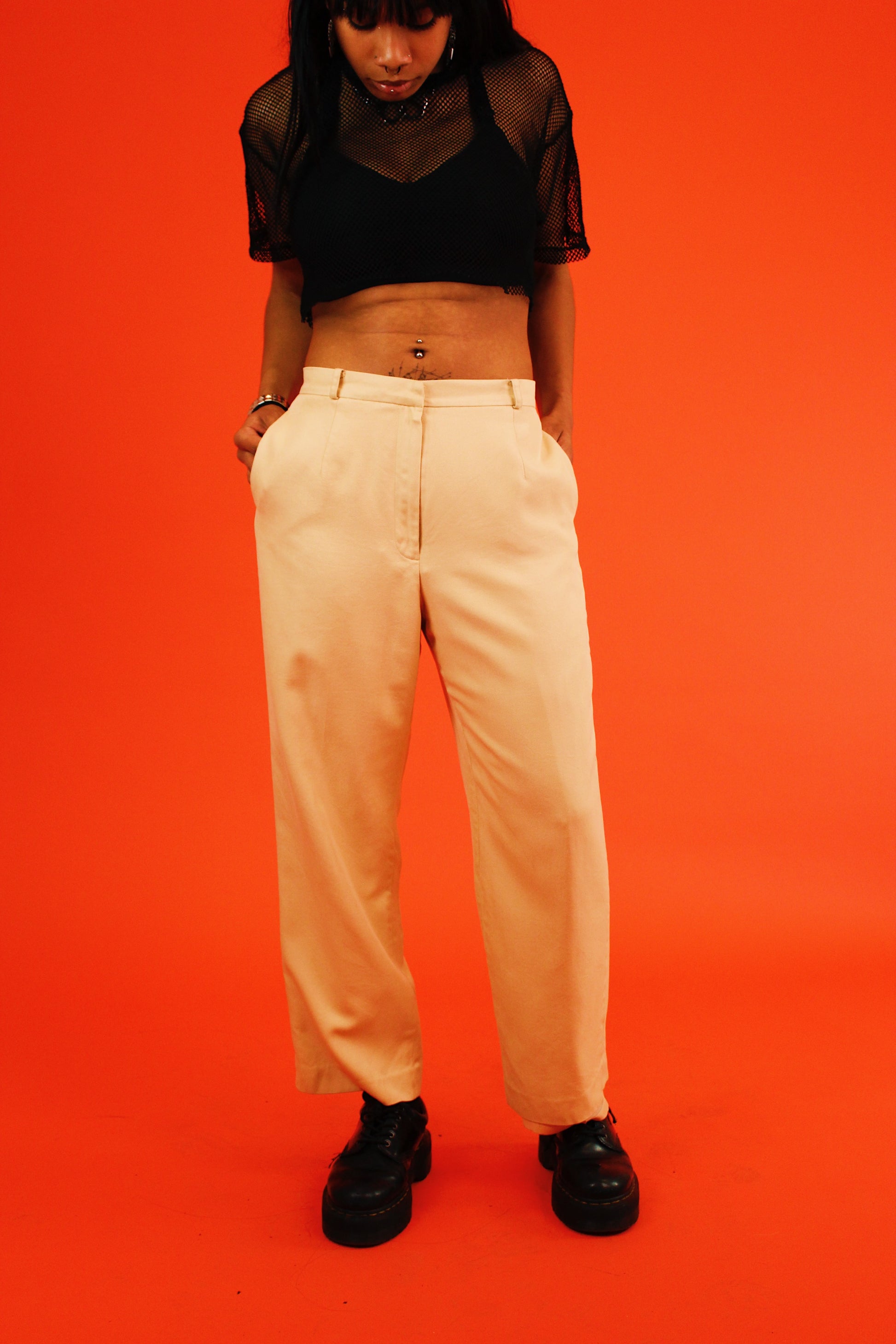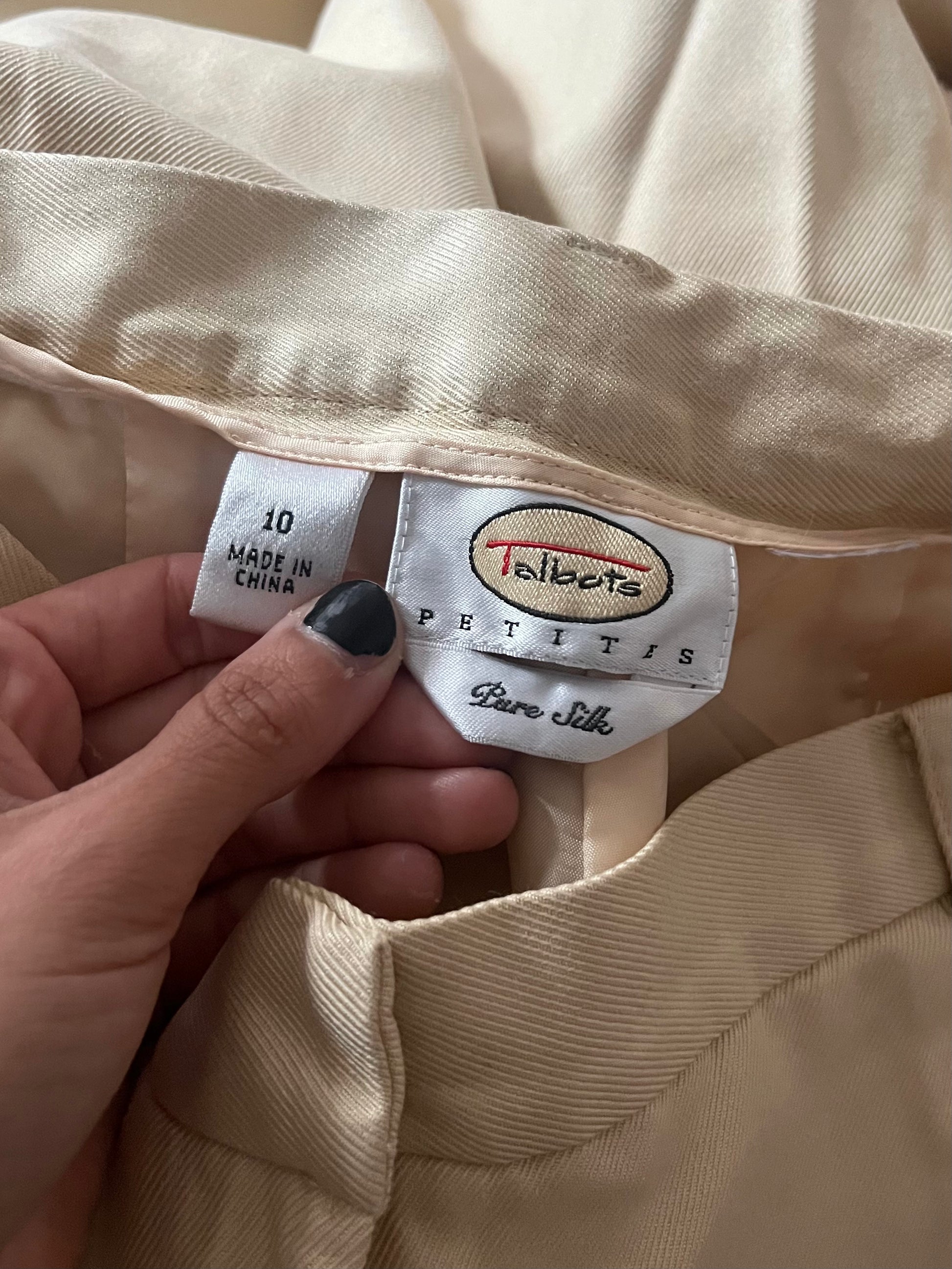 Vintage 90s neutral silk trousers with a pleated waistband, discreet pockets, and single pocket in the back. Has a very nice texture. By Talbots Petite. Tag size 10, Pure Silk. Best fits a S/M. Seen on Kayla.