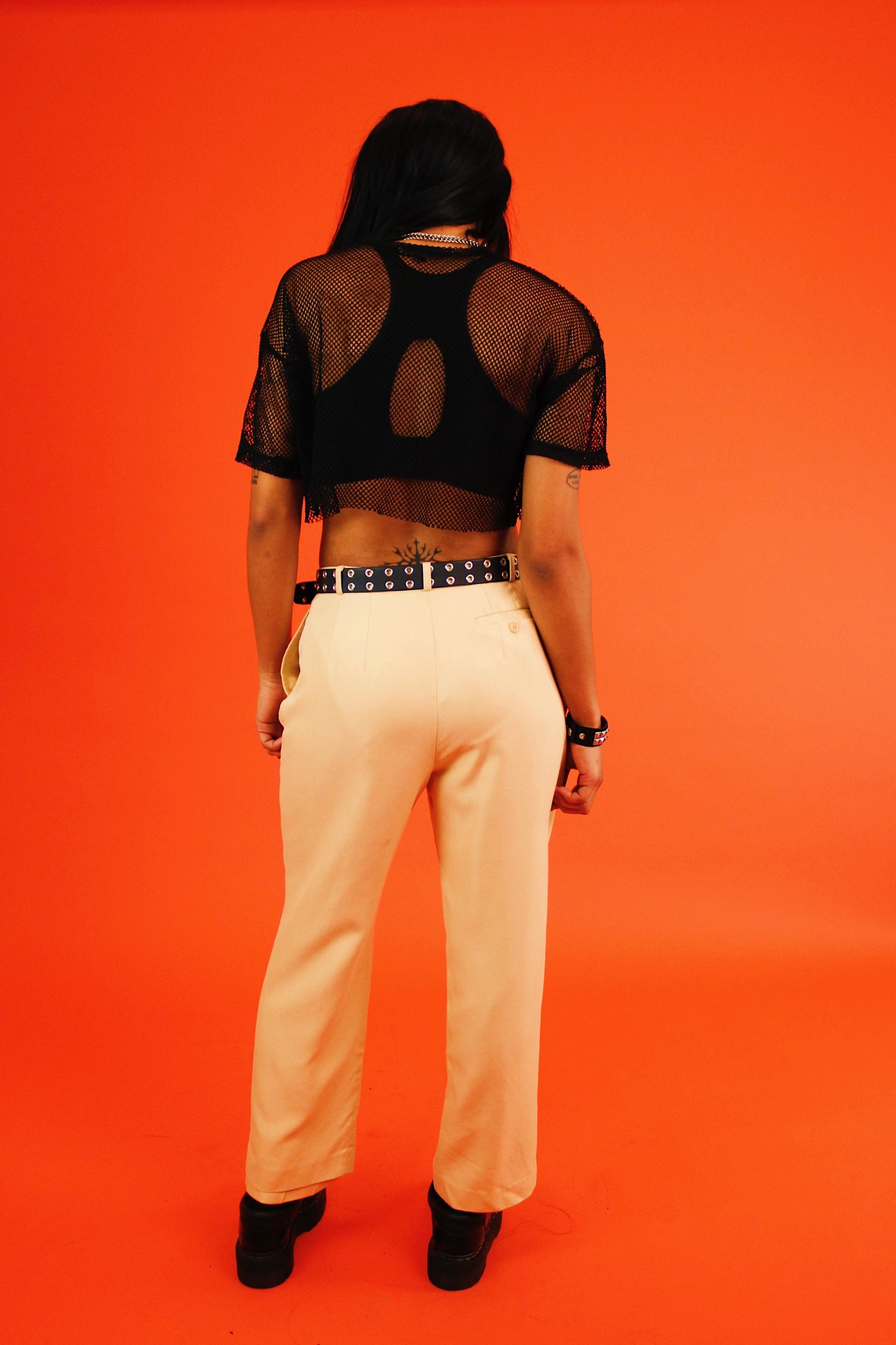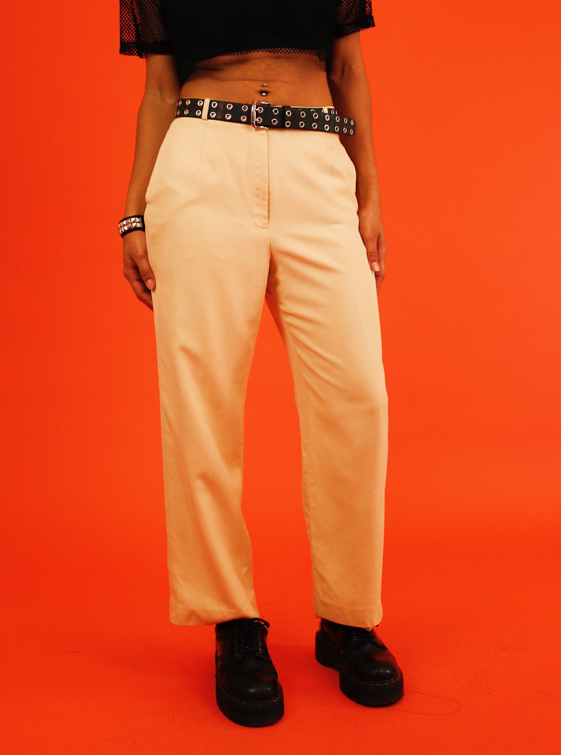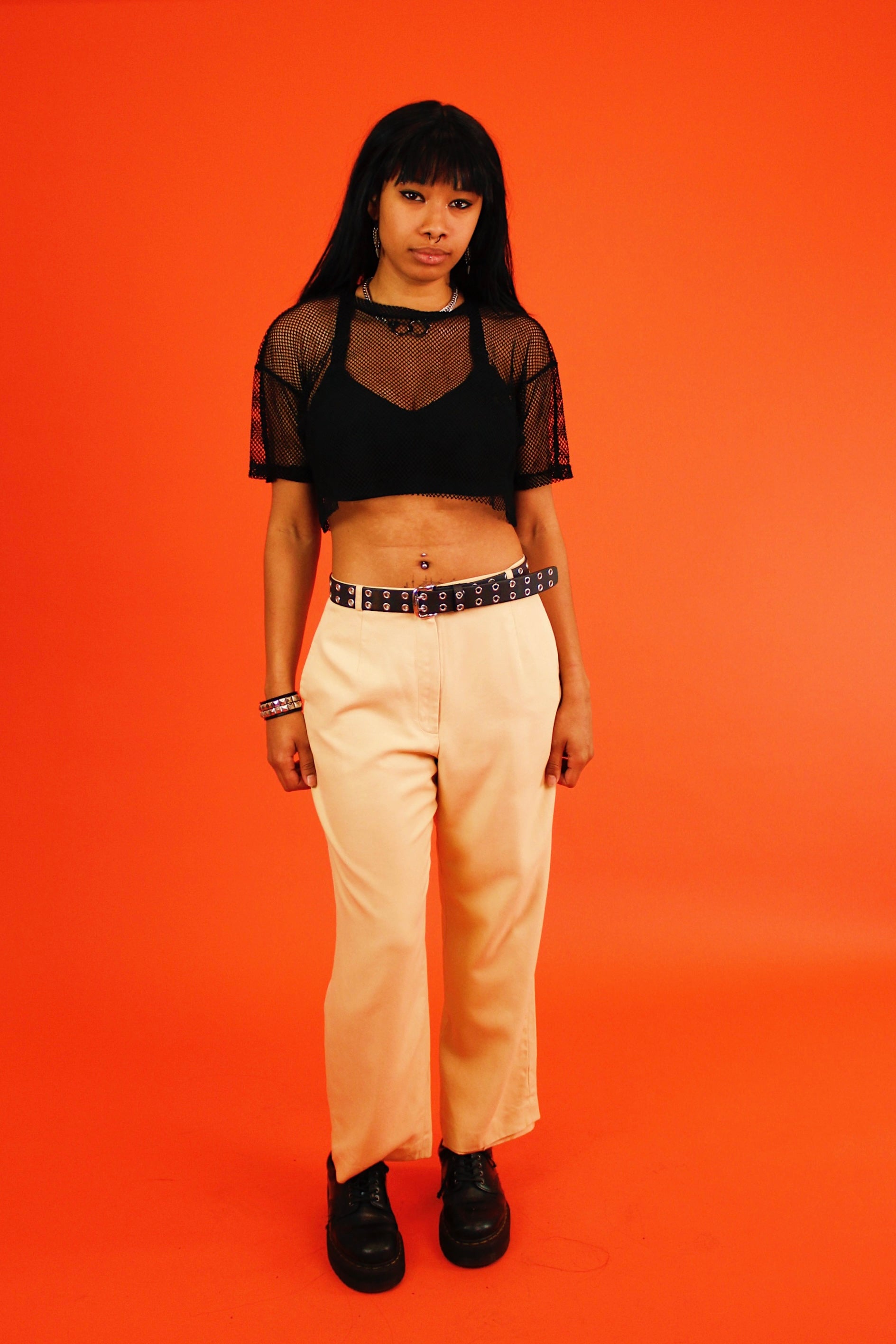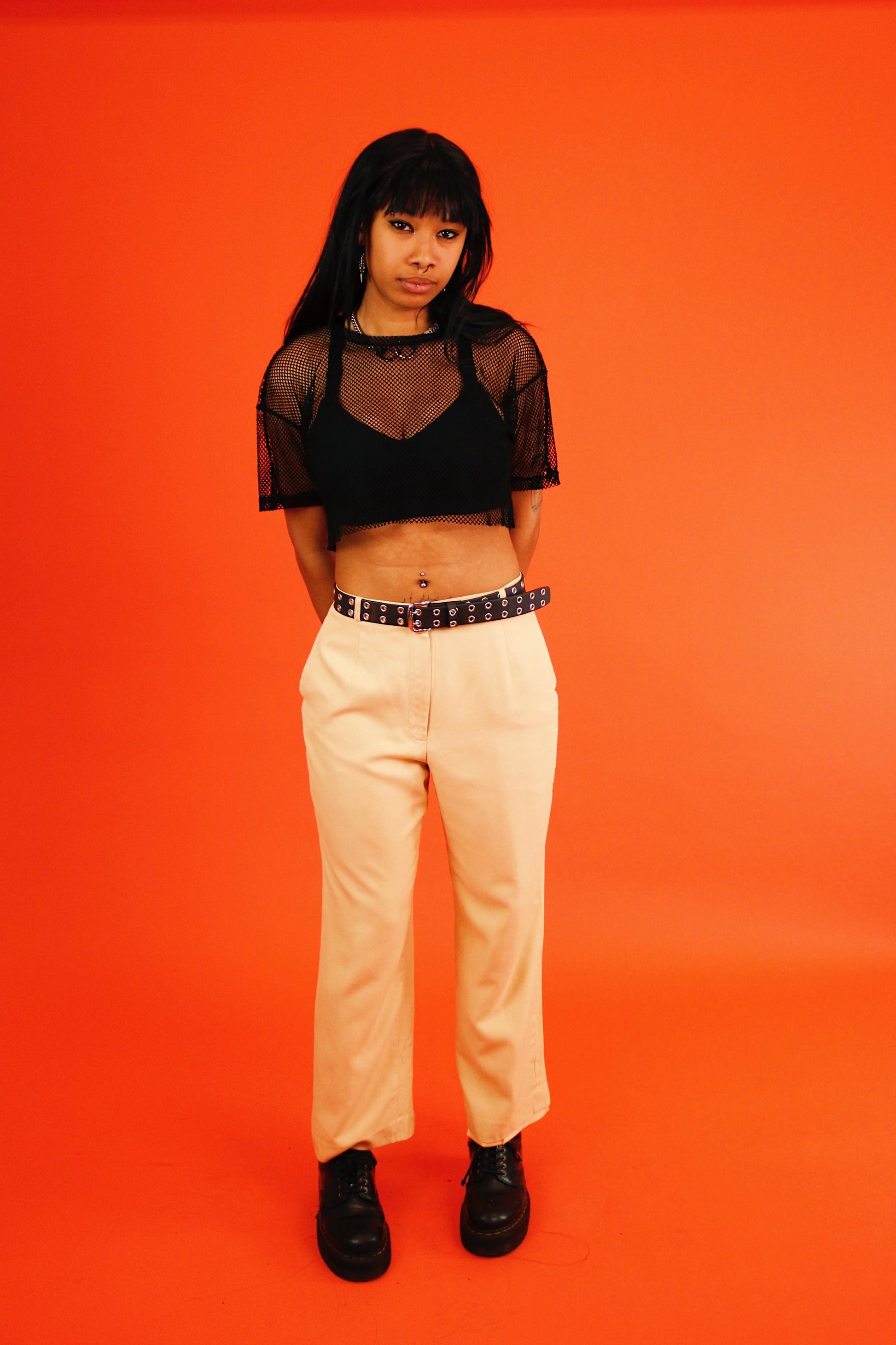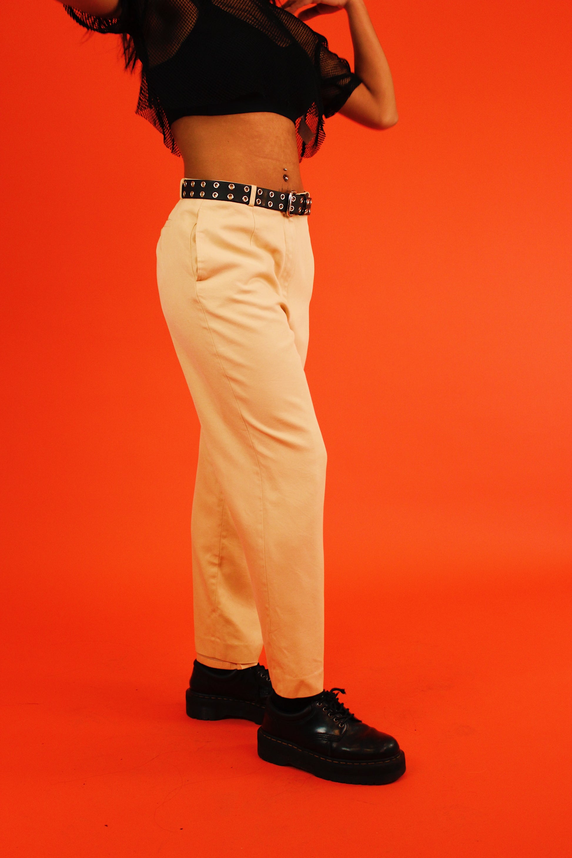 Vintage 90s neutral silk trousers with a pleated waistband, discreet pockets, and single pocket in the back. Has a very nice texture. By Talbots Petite. Tag size 10, Pure Silk. Best fits a S/M. Seen on Kayla.