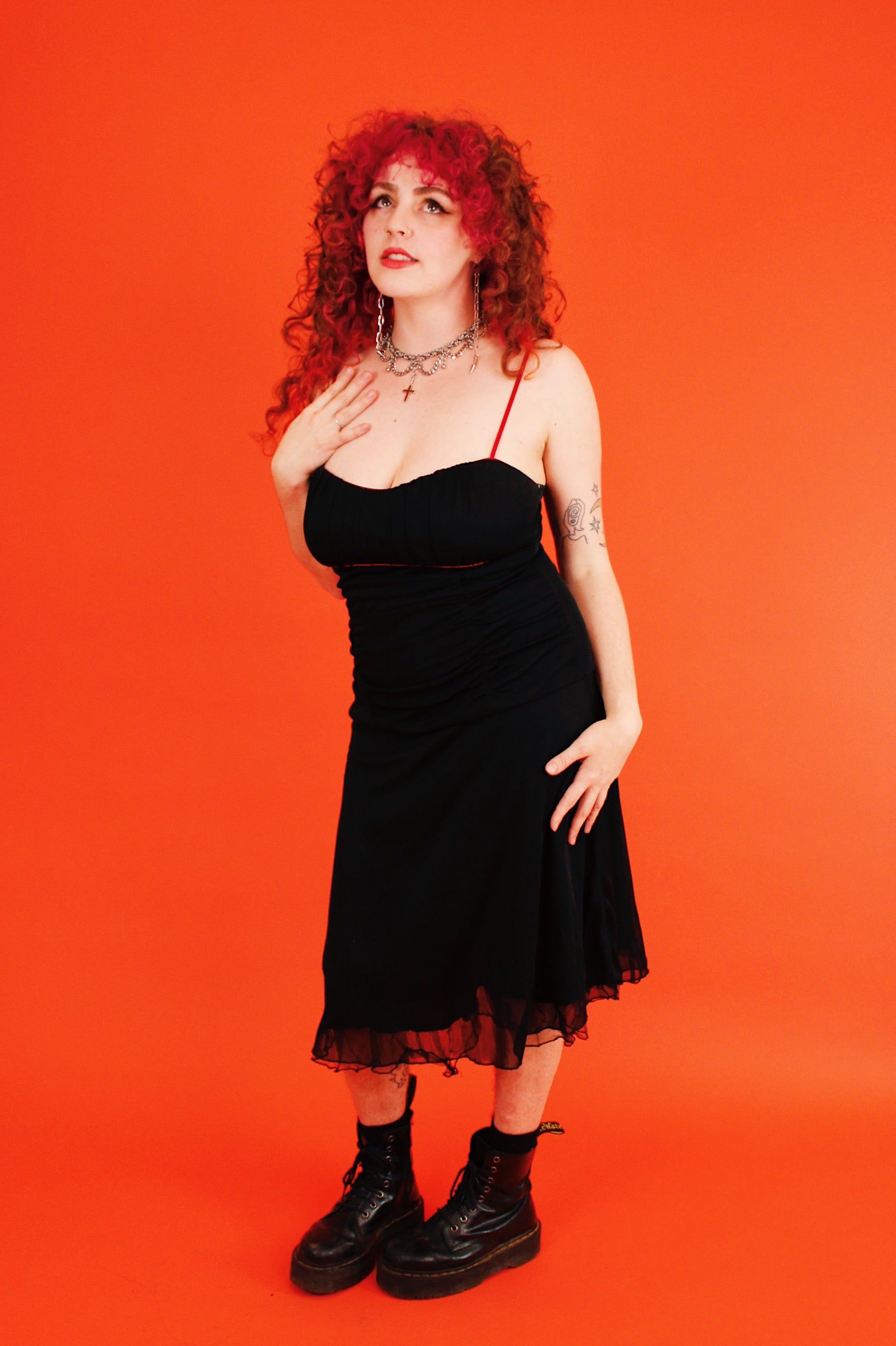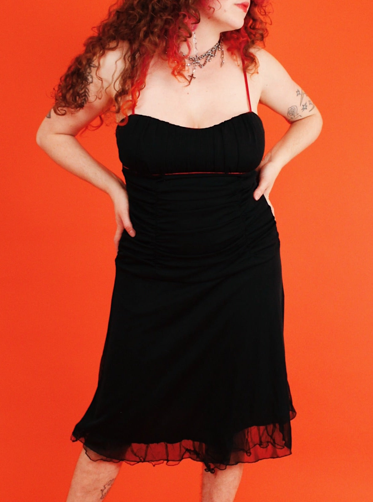 Vintage 90s/y2k ruched black dress with cherry red piping and adjustable straps. Has a layered mesh skirt with tulle along the hem. By Three Pink Hearts. Tag size XL, 100% Polyester. Best fits a M-XL. Seen on Bailey.