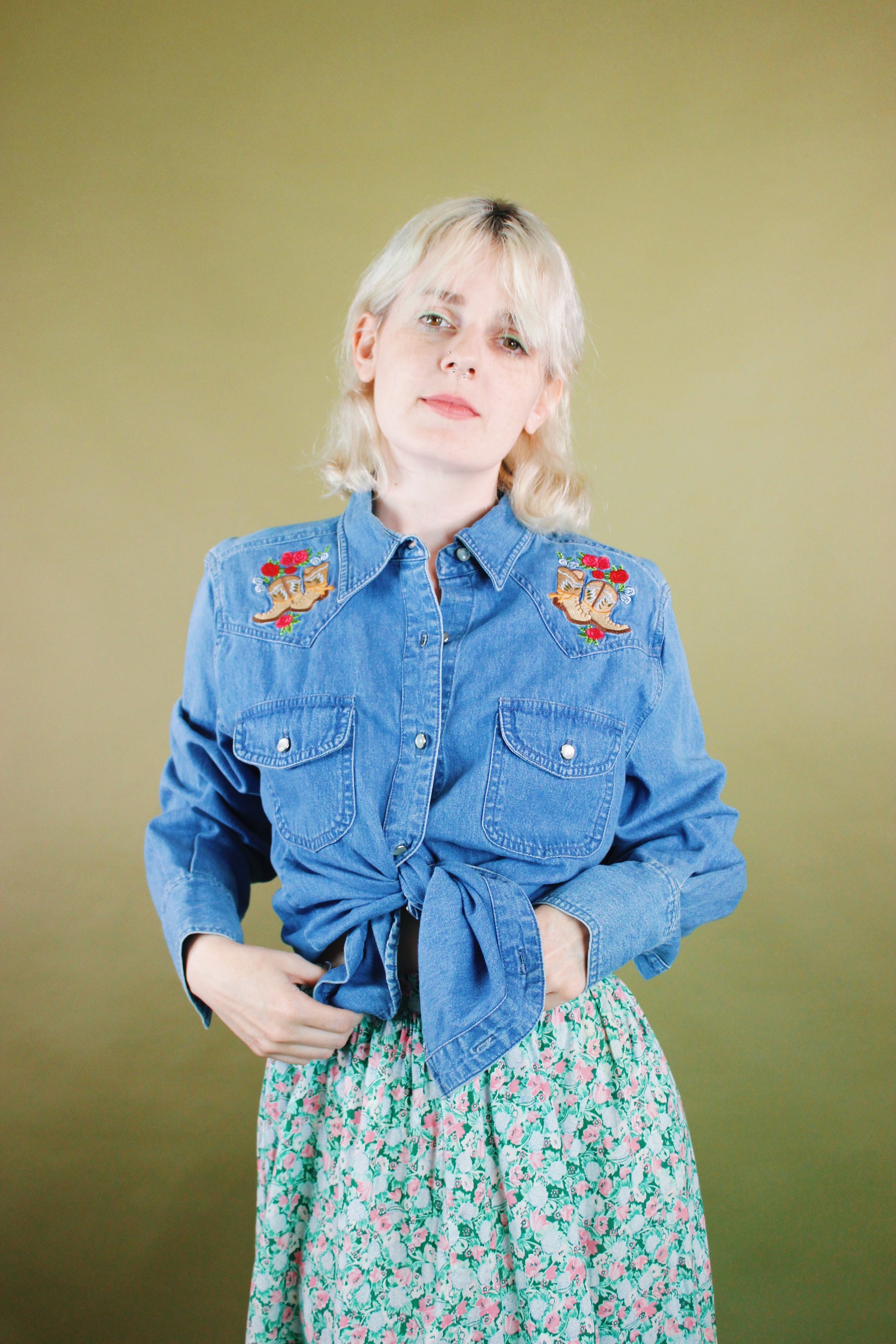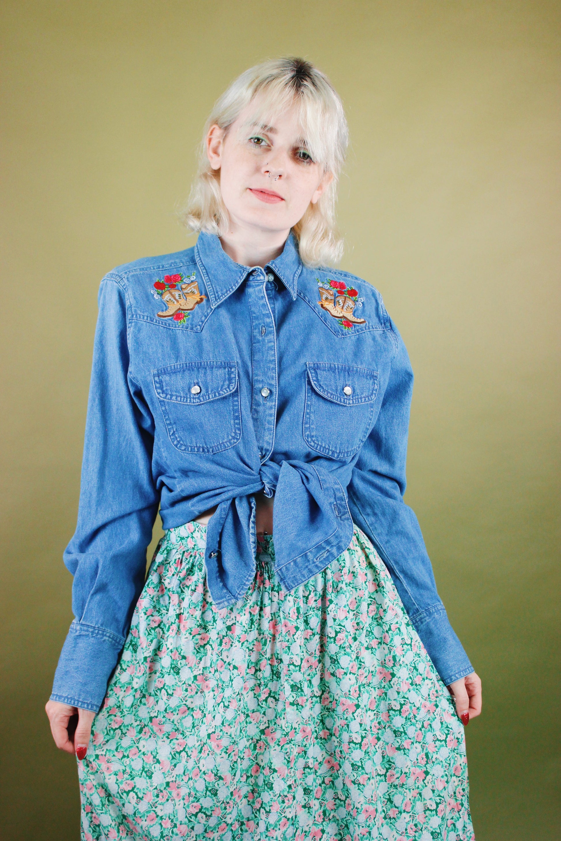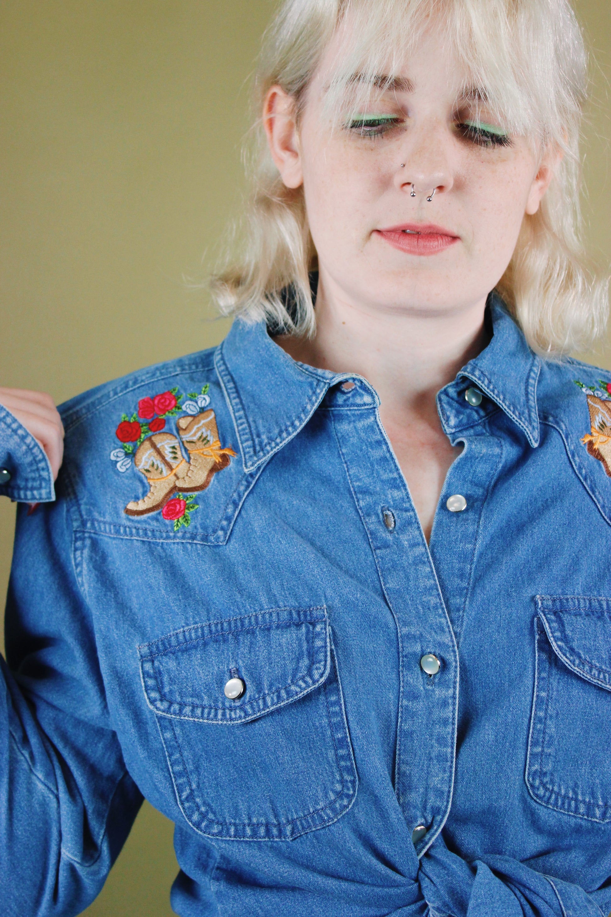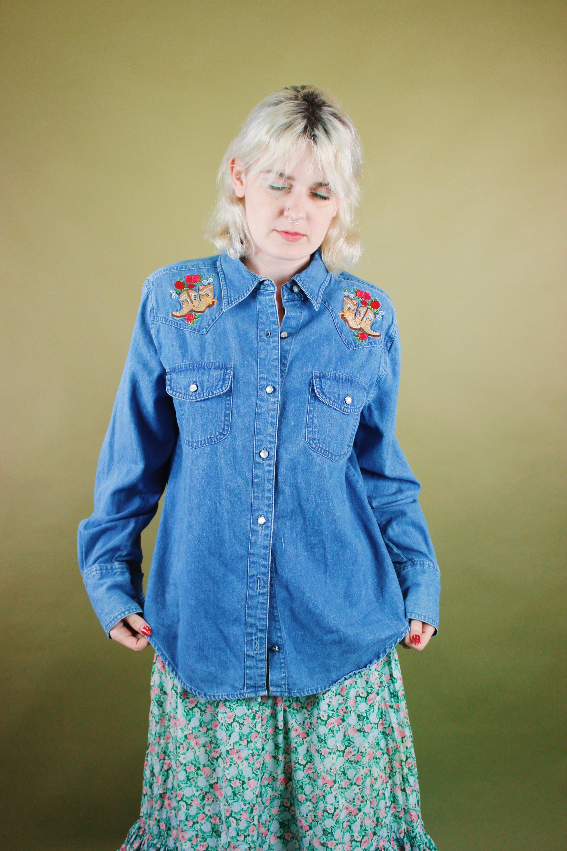 Vintage 90s does 70s light denim pearl snap with embroidered boot & rose details on the chest. Absolutely love the colors of this one! By Bill Blass. Tag size M, 100% Cotton. Best fits a M. Seen on Rose (fit was loose).