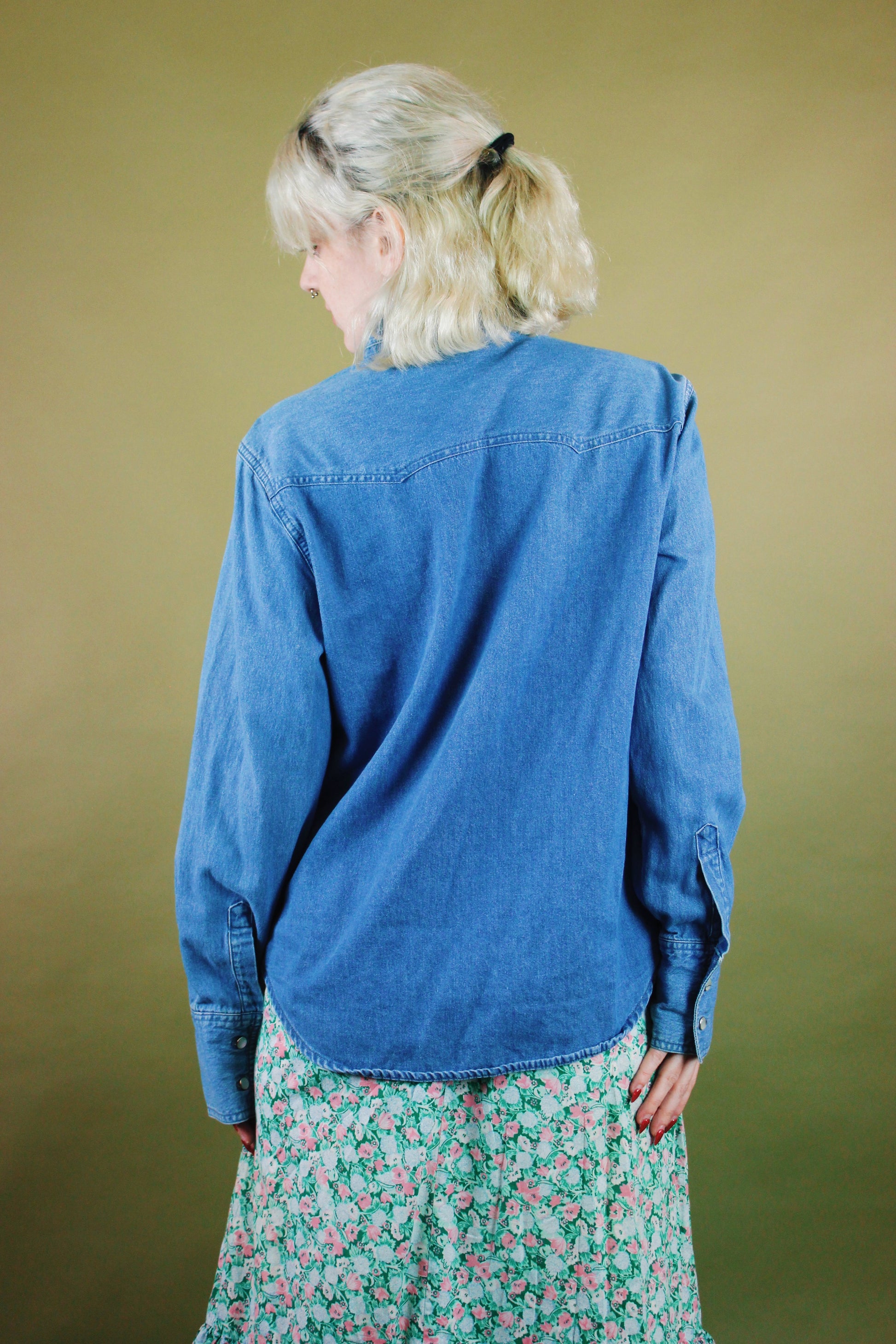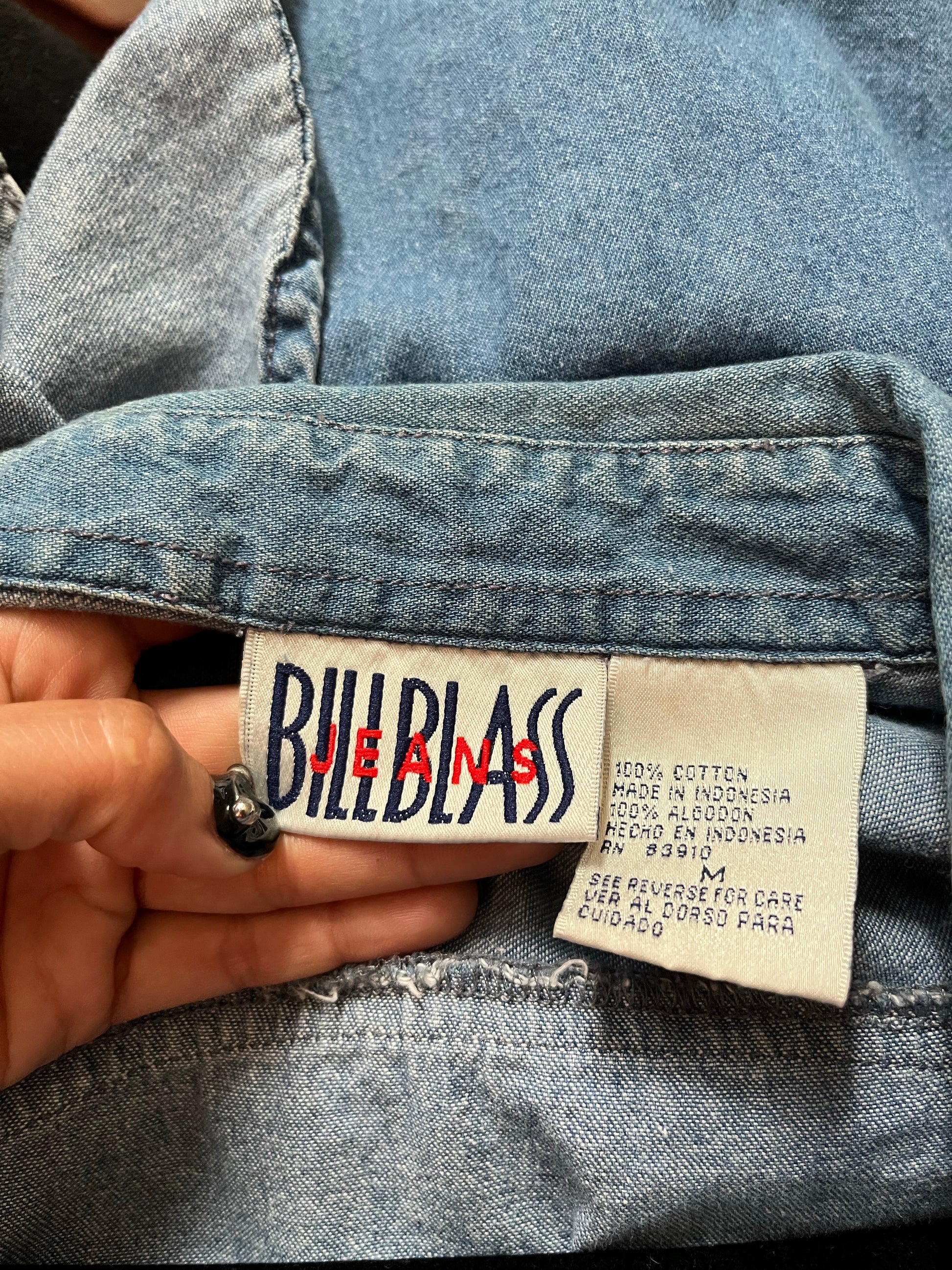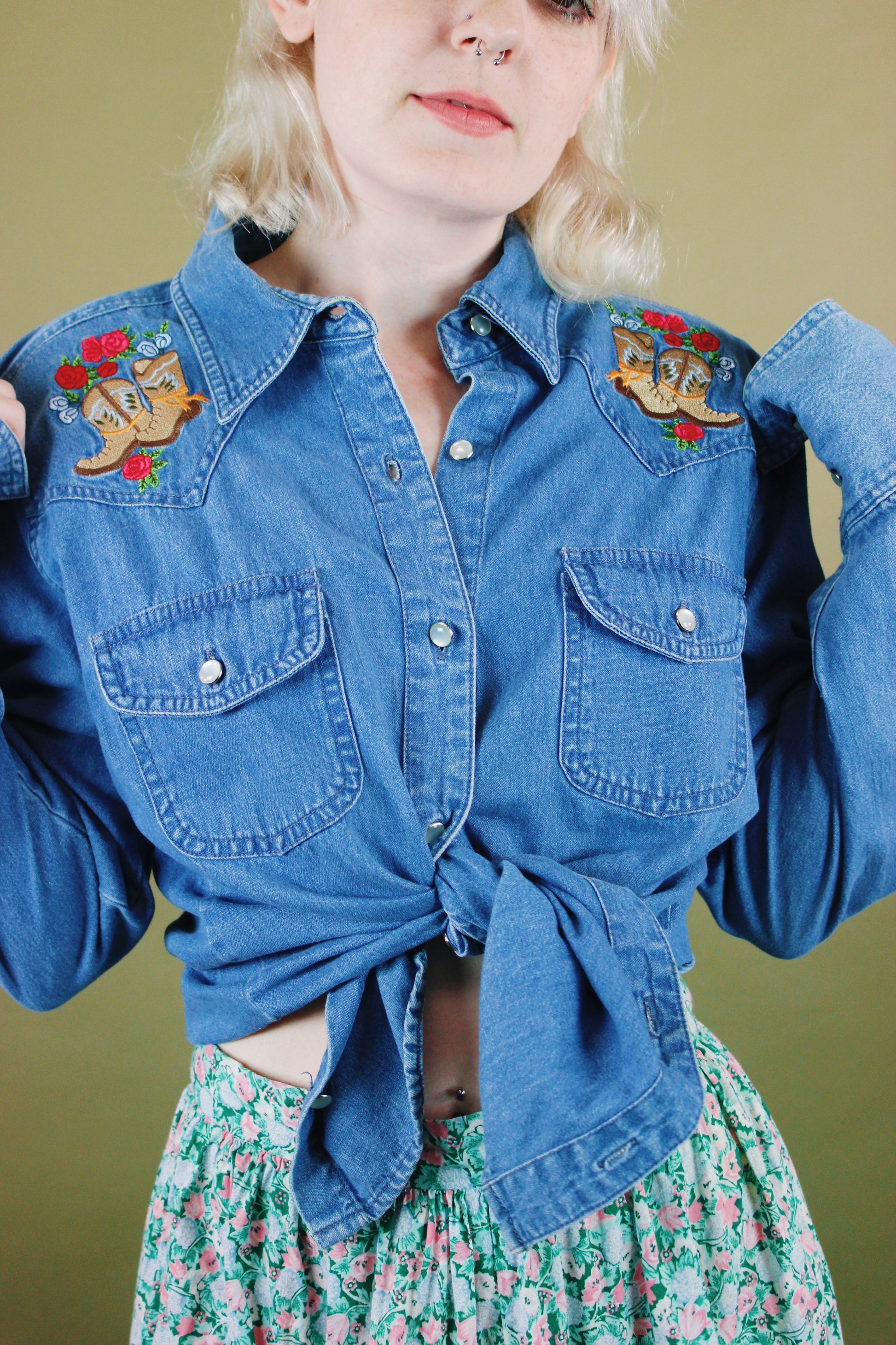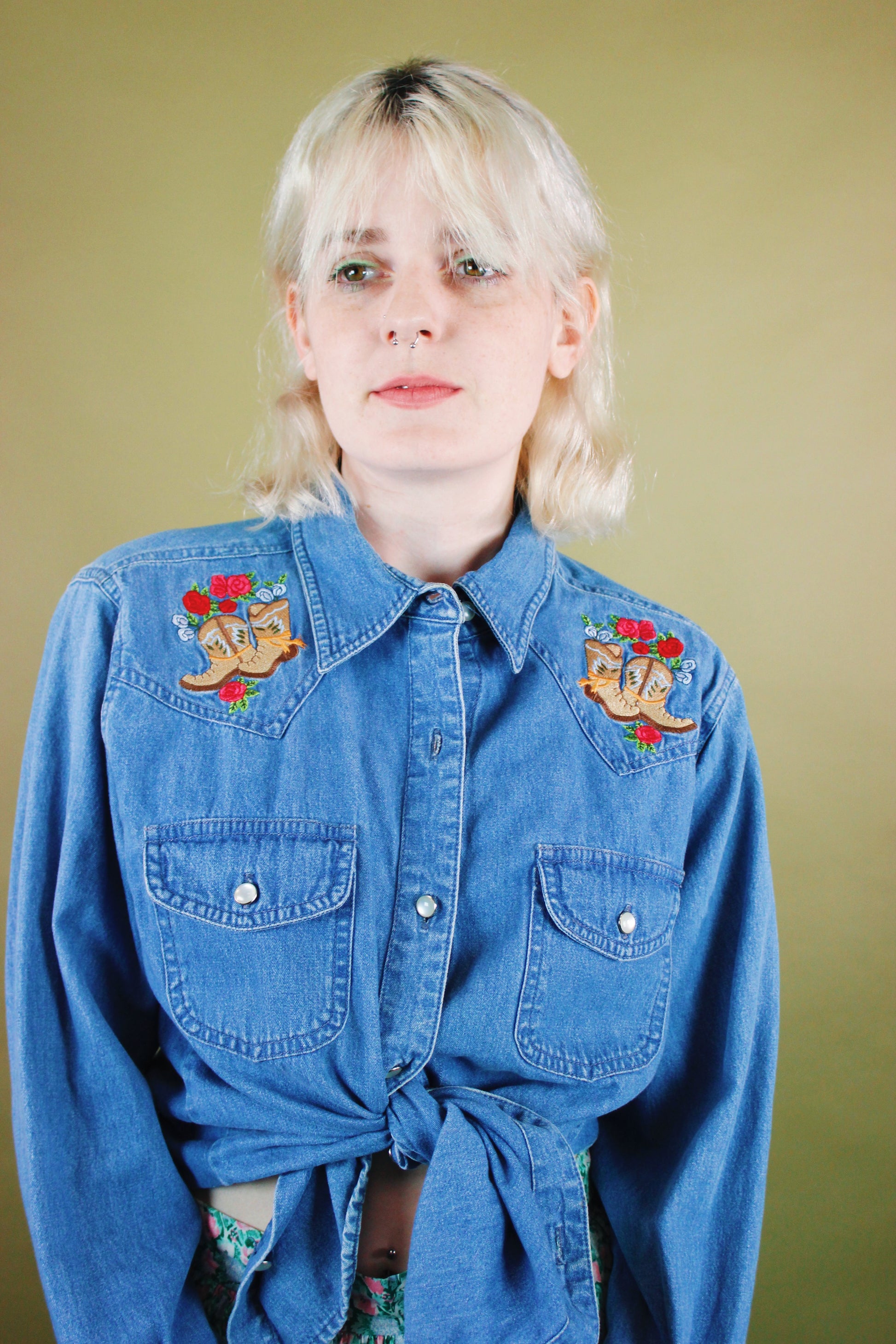 Vintage 90s does 70s light denim pearl snap with embroidered boot & rose details on the chest. Absolutely love the colors of this one! By Bill Blass. Tag size M, 100% Cotton. Best fits a M. Seen on Rose (fit was loose).