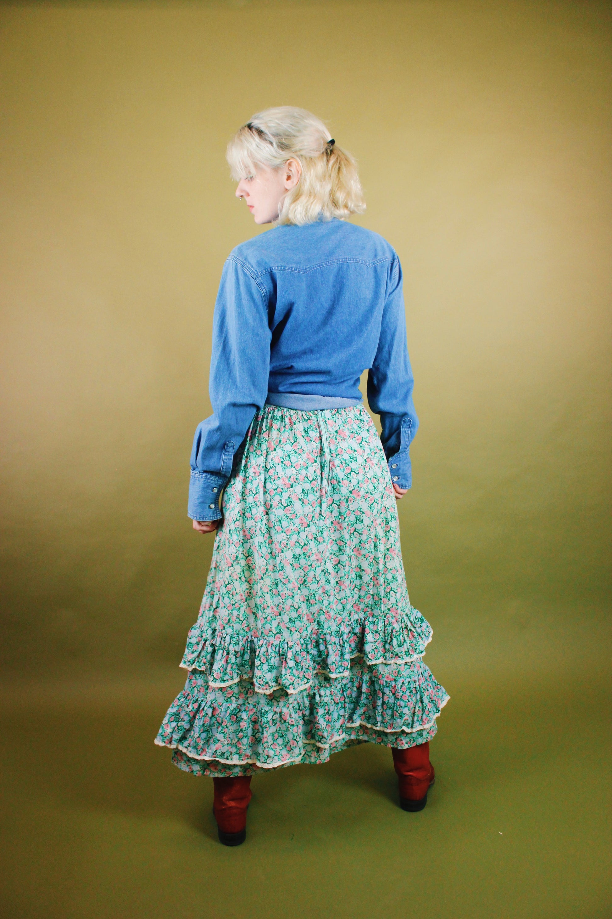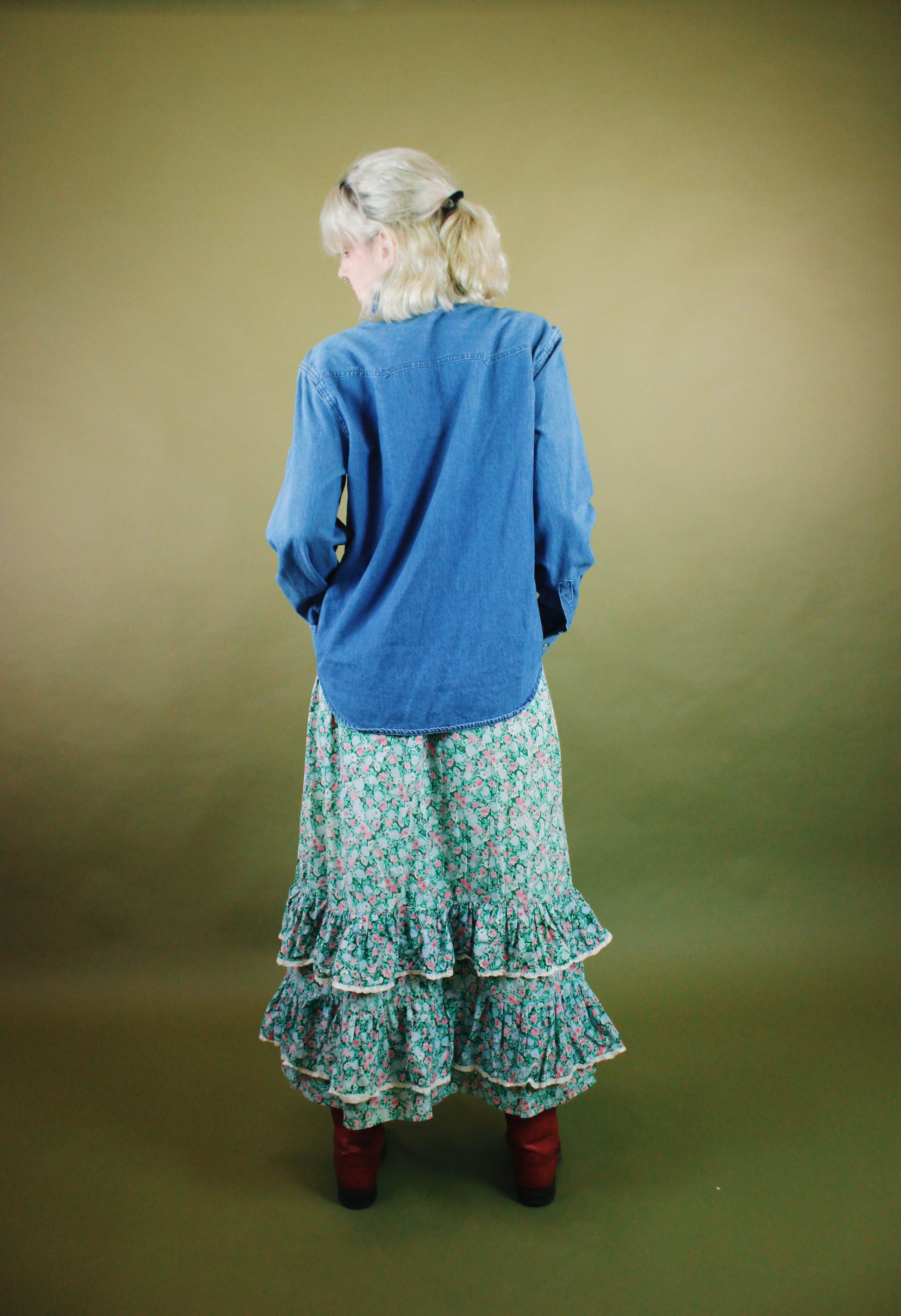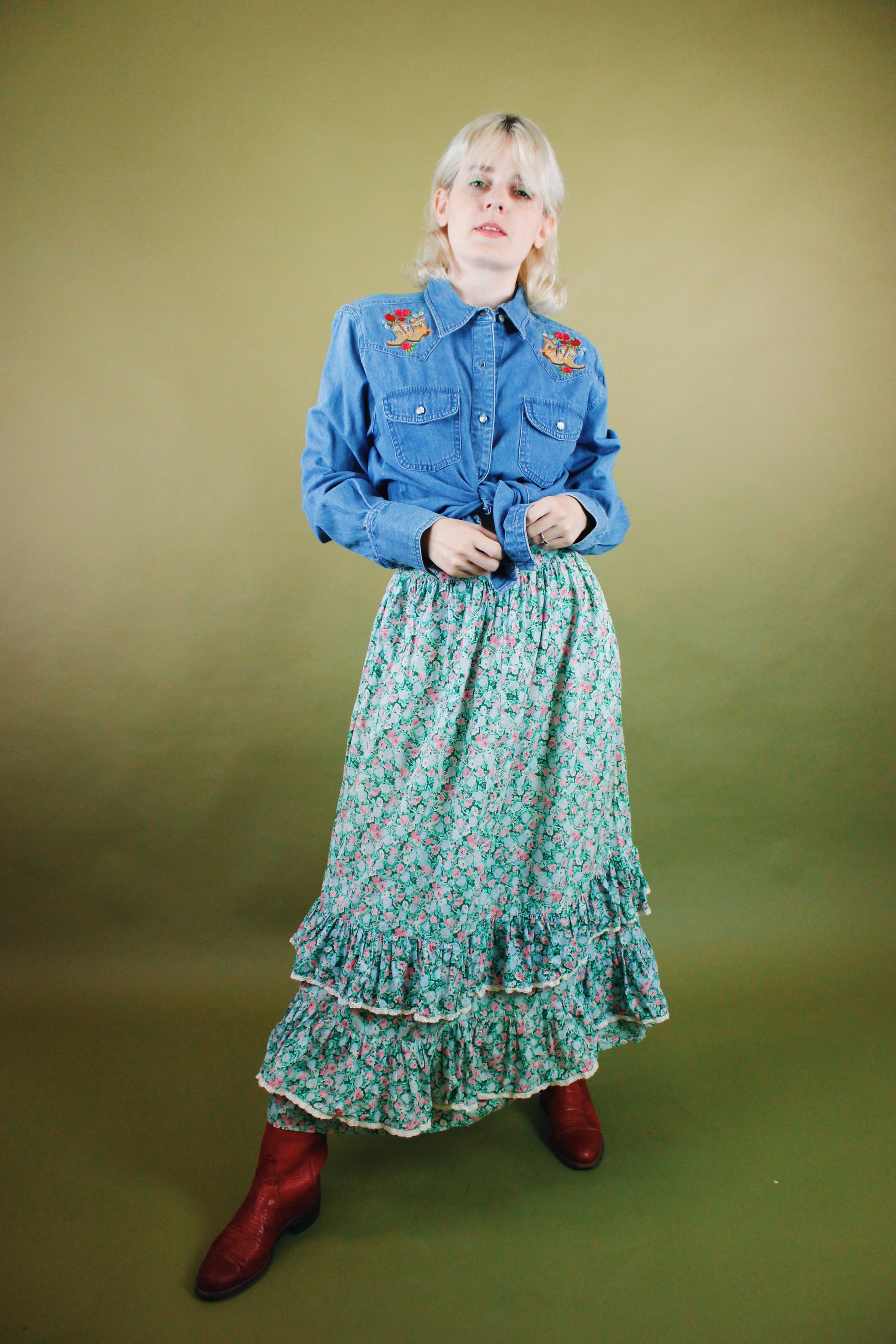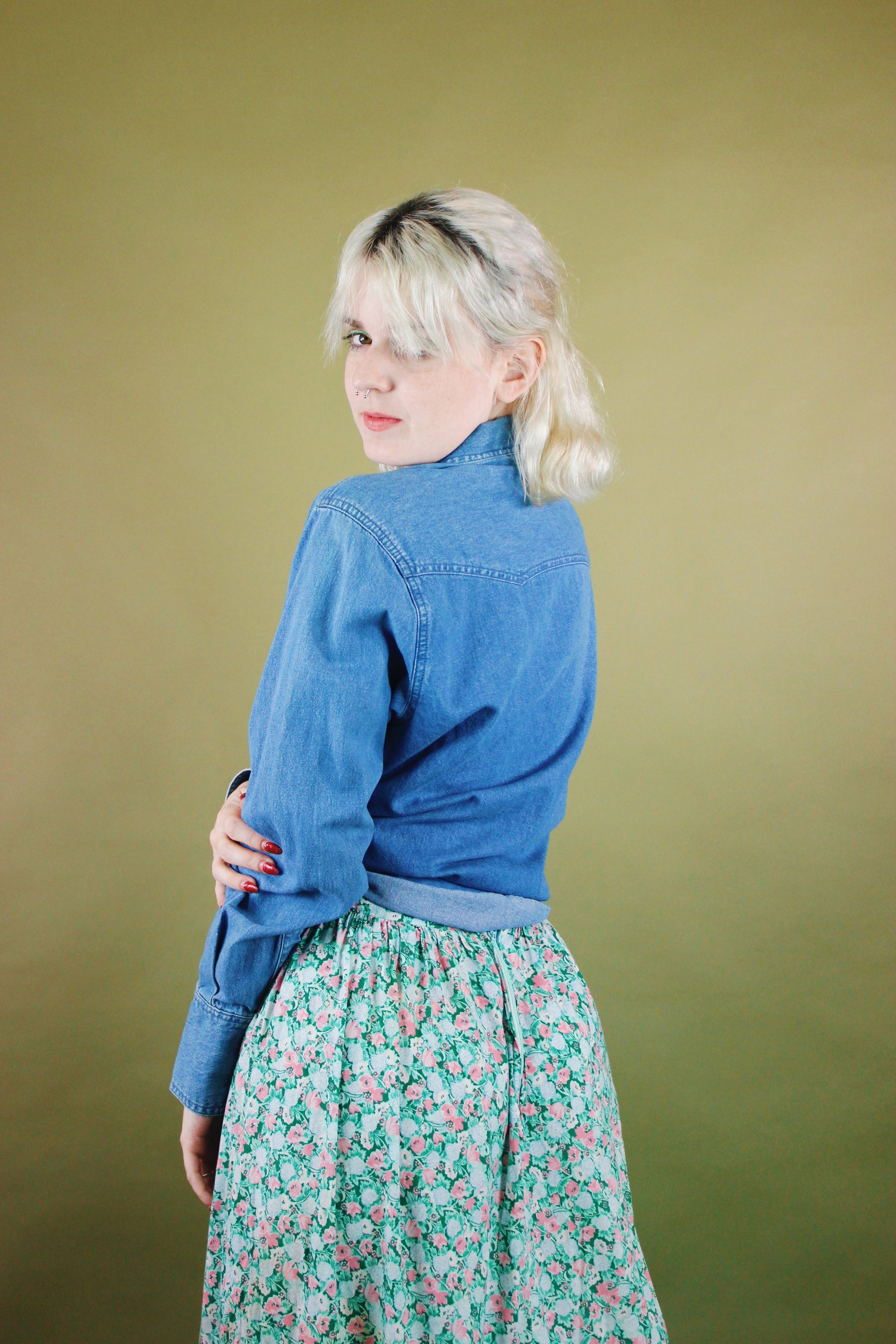 Vintage 90s does 70s light denim pearl snap with embroidered boot & rose details on the chest. Absolutely love the colors of this one! By Bill Blass. Tag size M, 100% Cotton. Best fits a M. Seen on Rose (fit was loose).