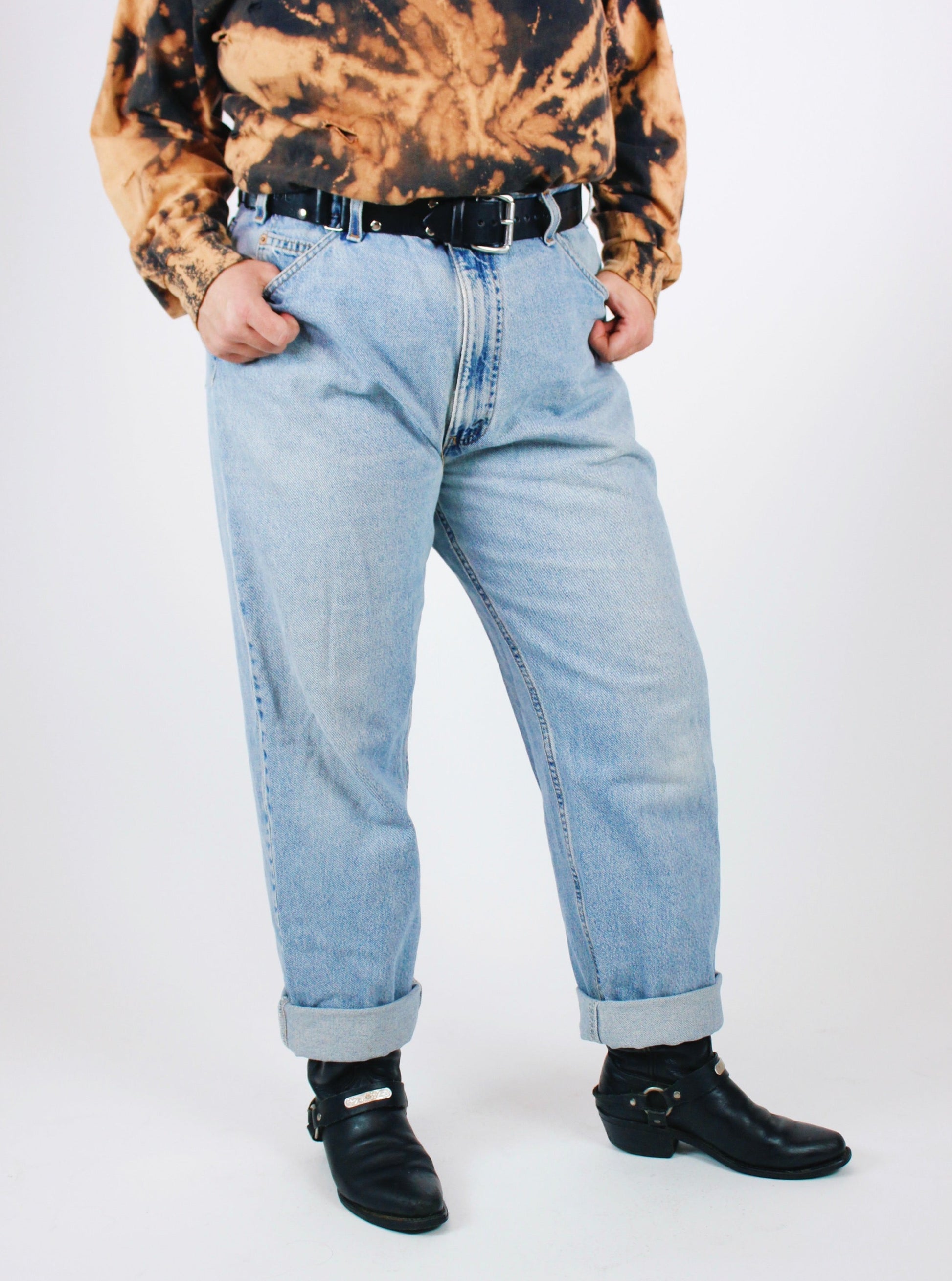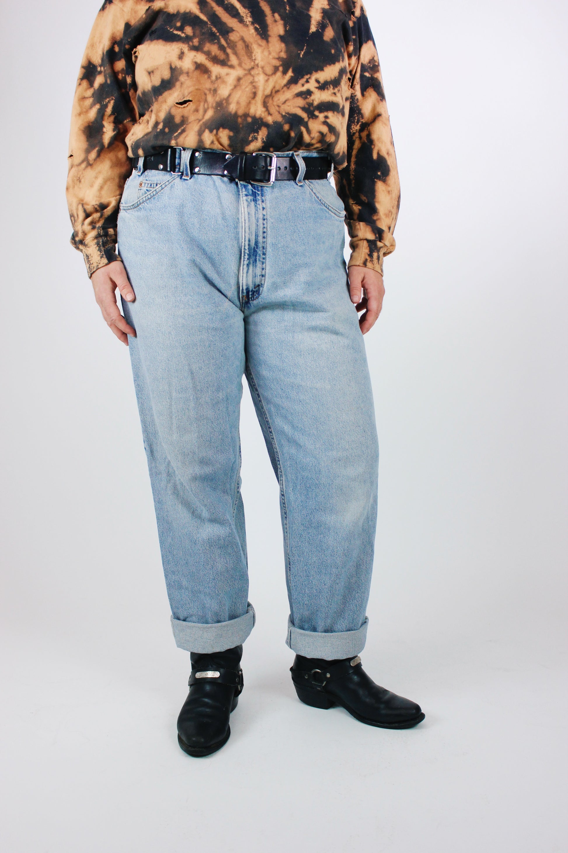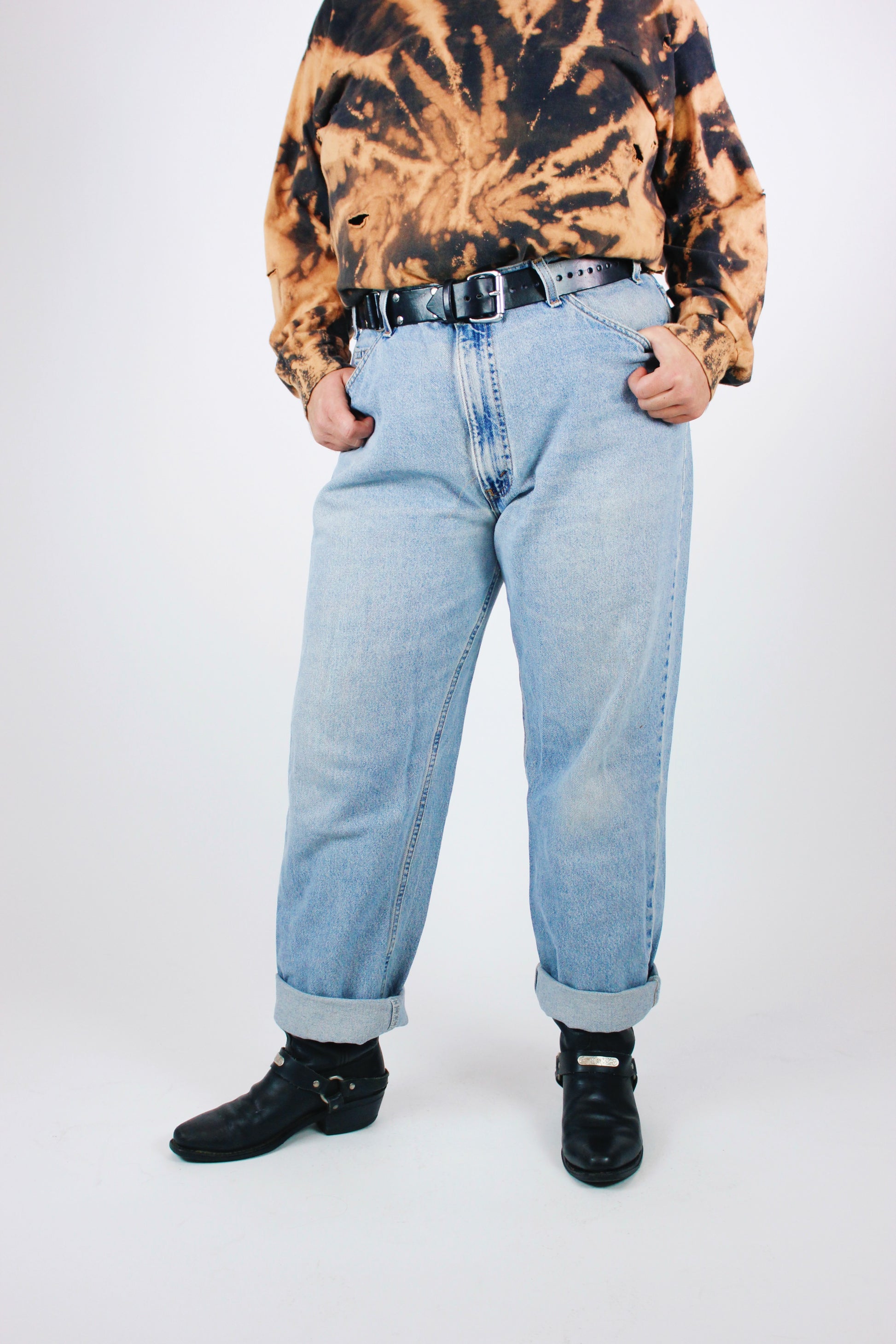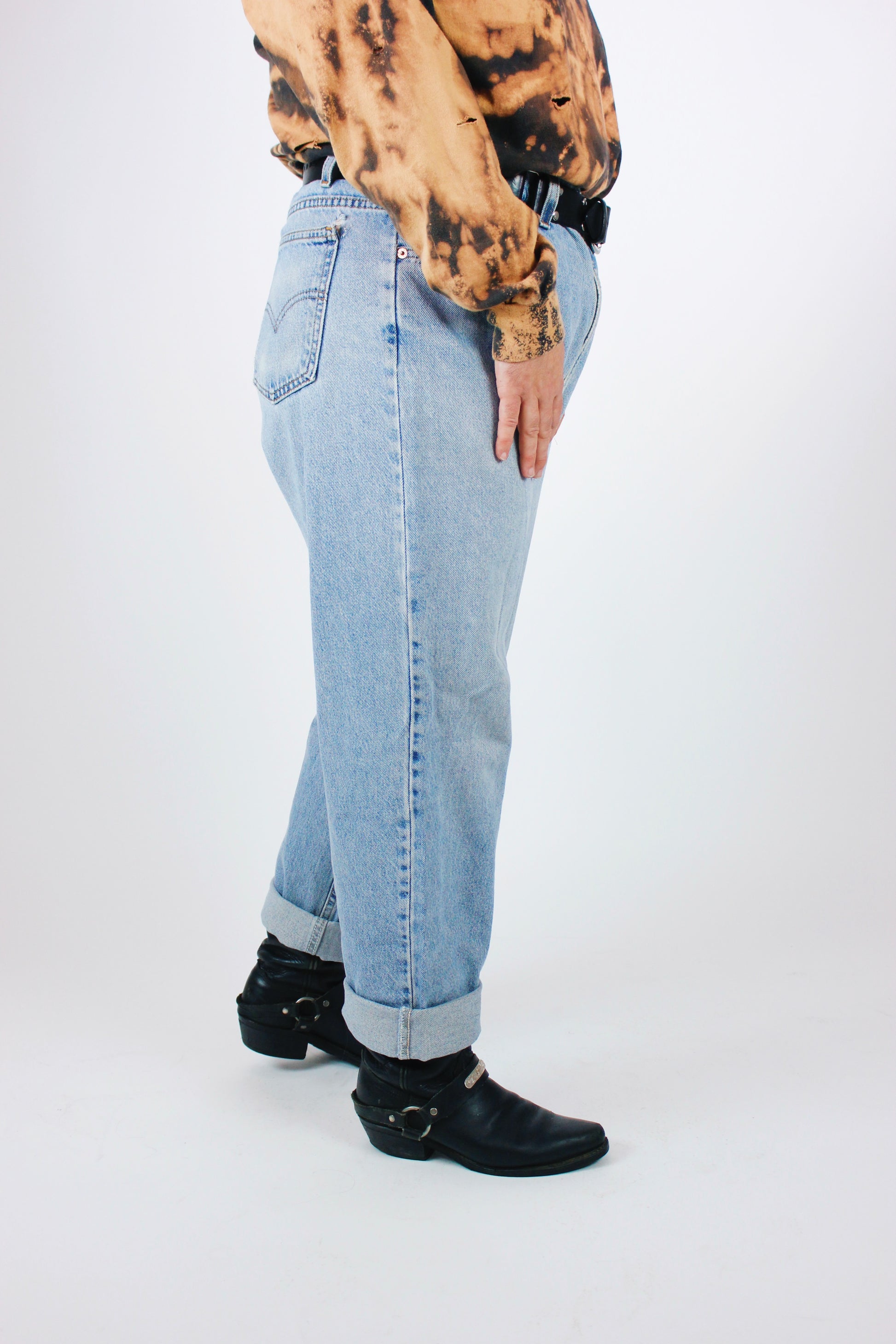 Vintage 90s classic blue denim relaxed fit/ straight leg Levi's. We love the fraying along the ankle. Tag size 40x30, 100% Cotton. Made in USA. Best fits an XL-XXL. Seen on Schyler (belted + cuffed to fit).