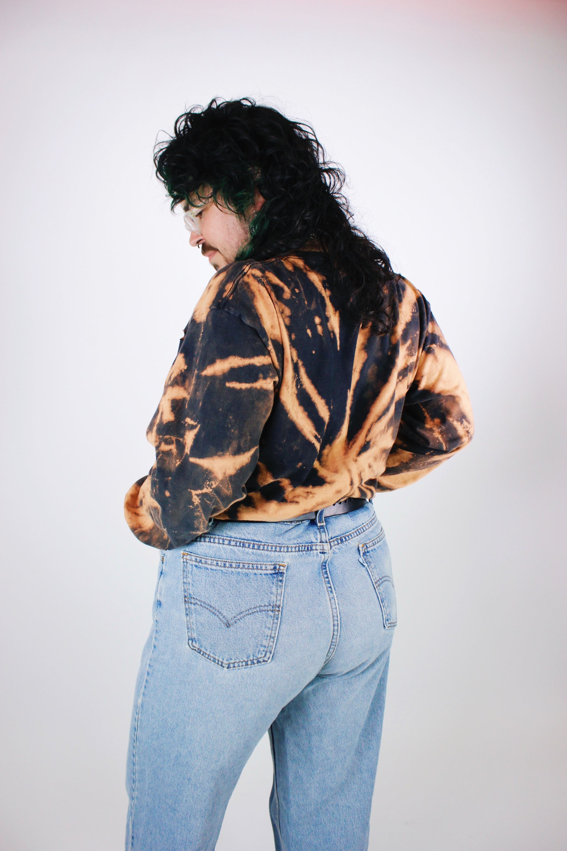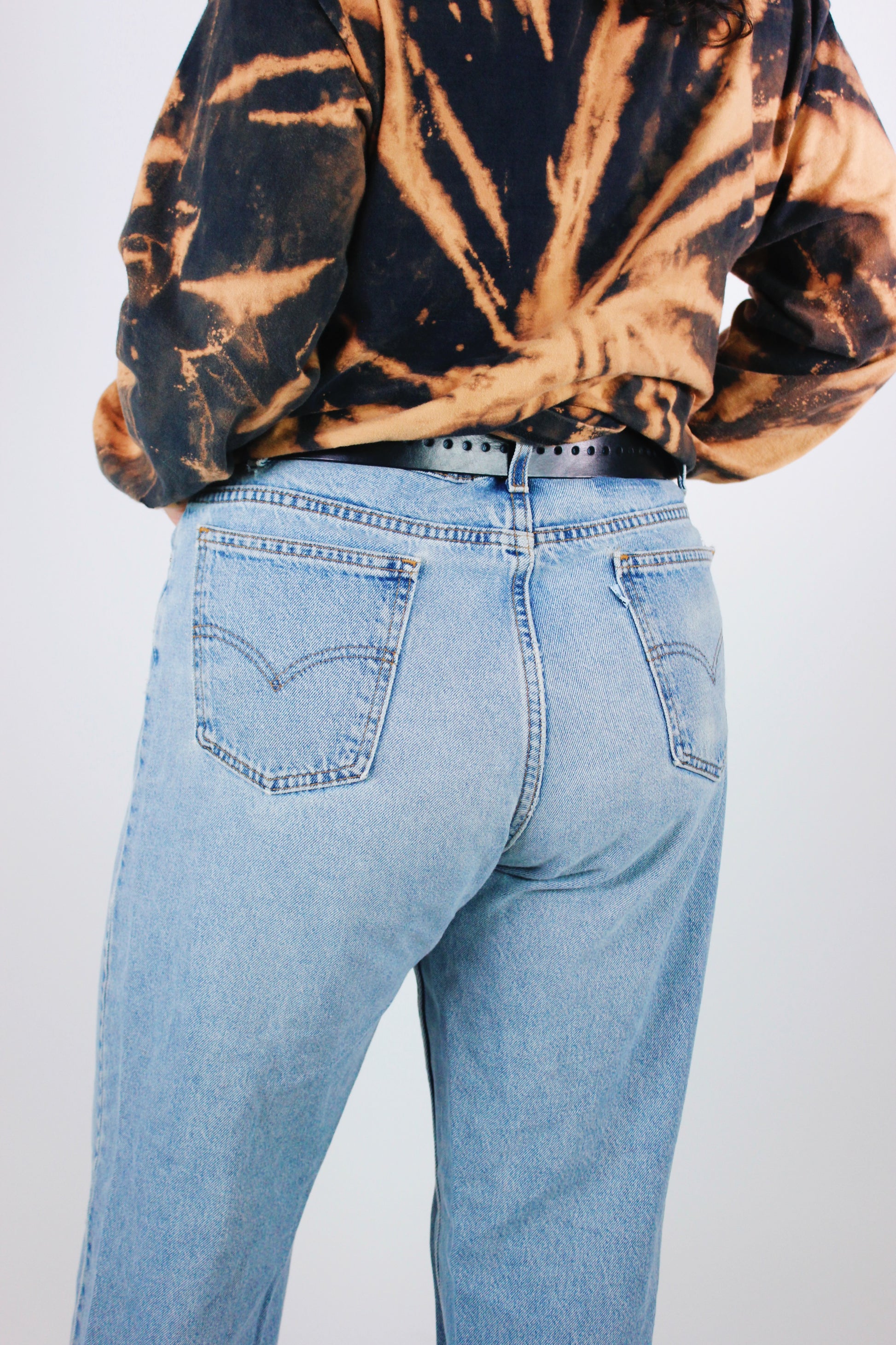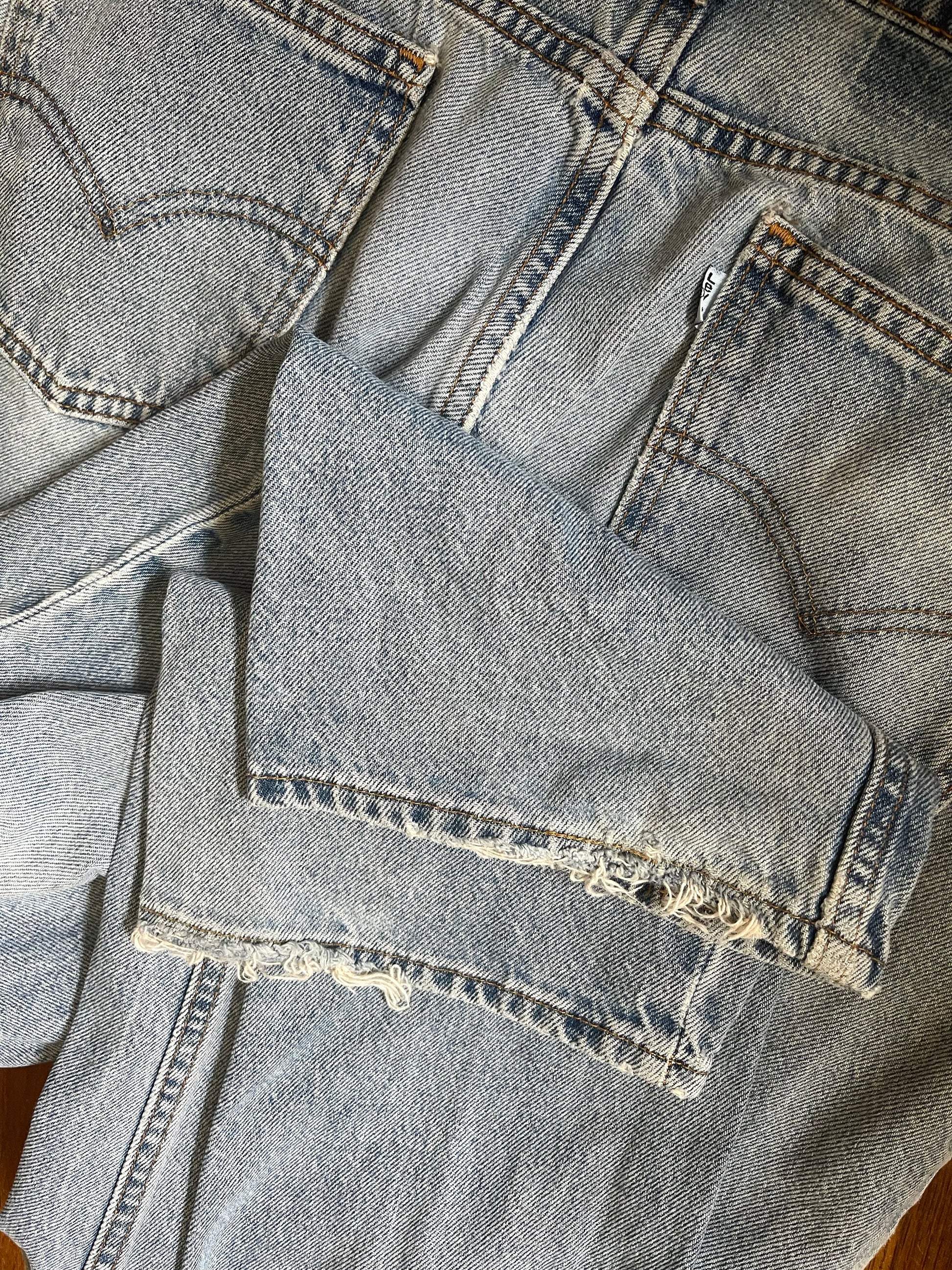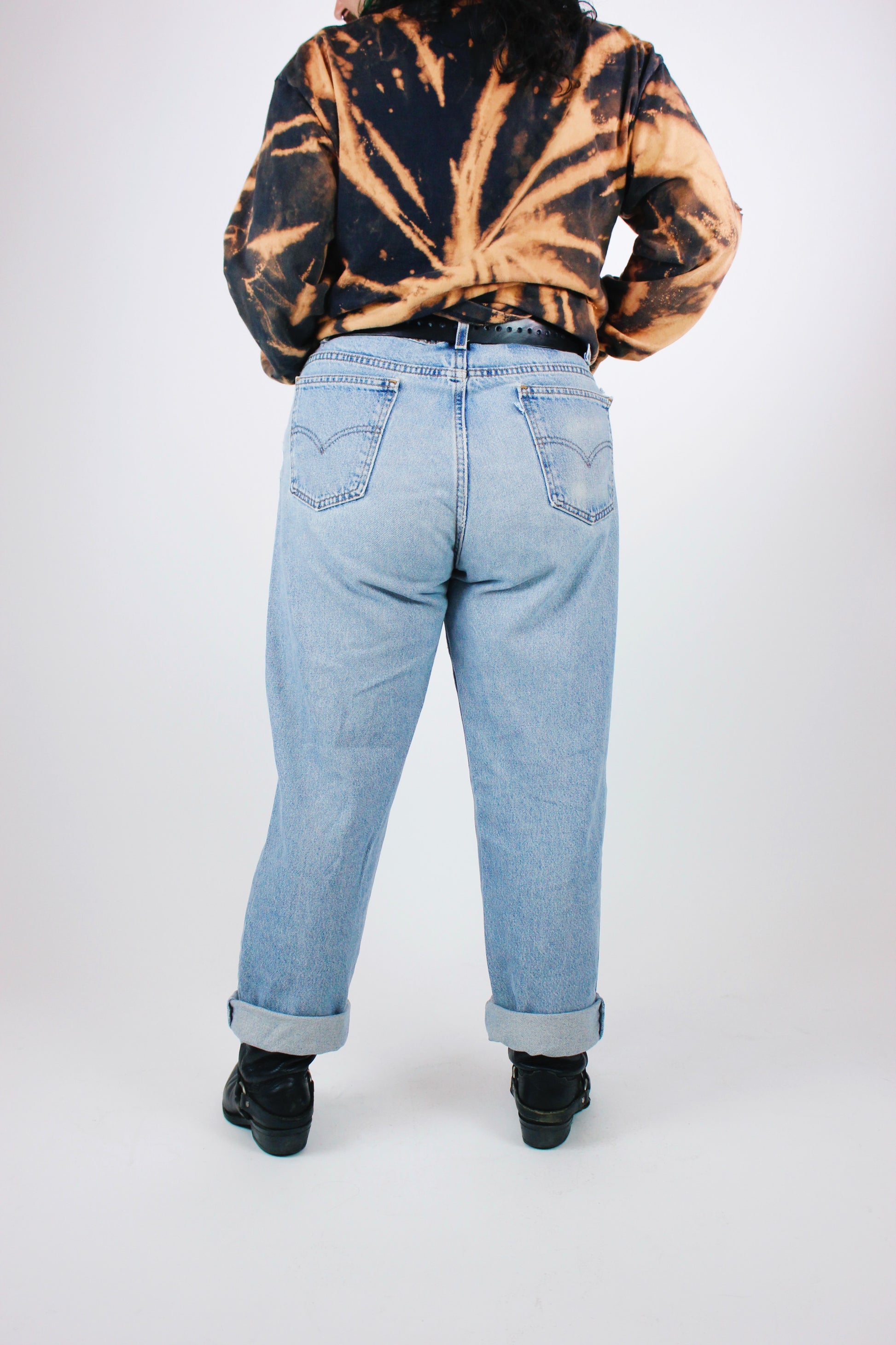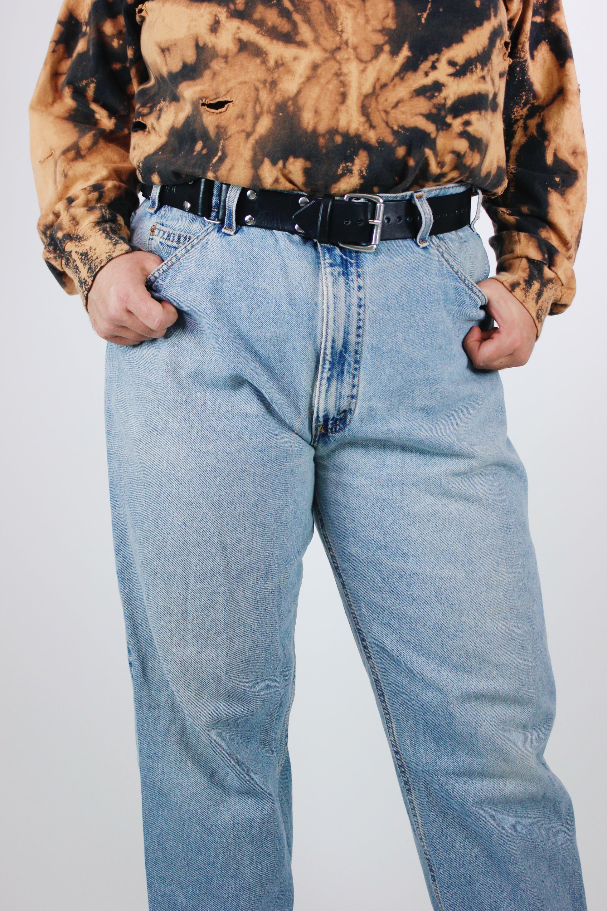 Vintage 90s classic blue denim relaxed fit/ straight leg Levi's. We love the fraying along the ankle. Tag size 40x30, 100% Cotton. Made in USA. Best fits an XL-XXL. Seen on Schyler (belted + cuffed to fit).