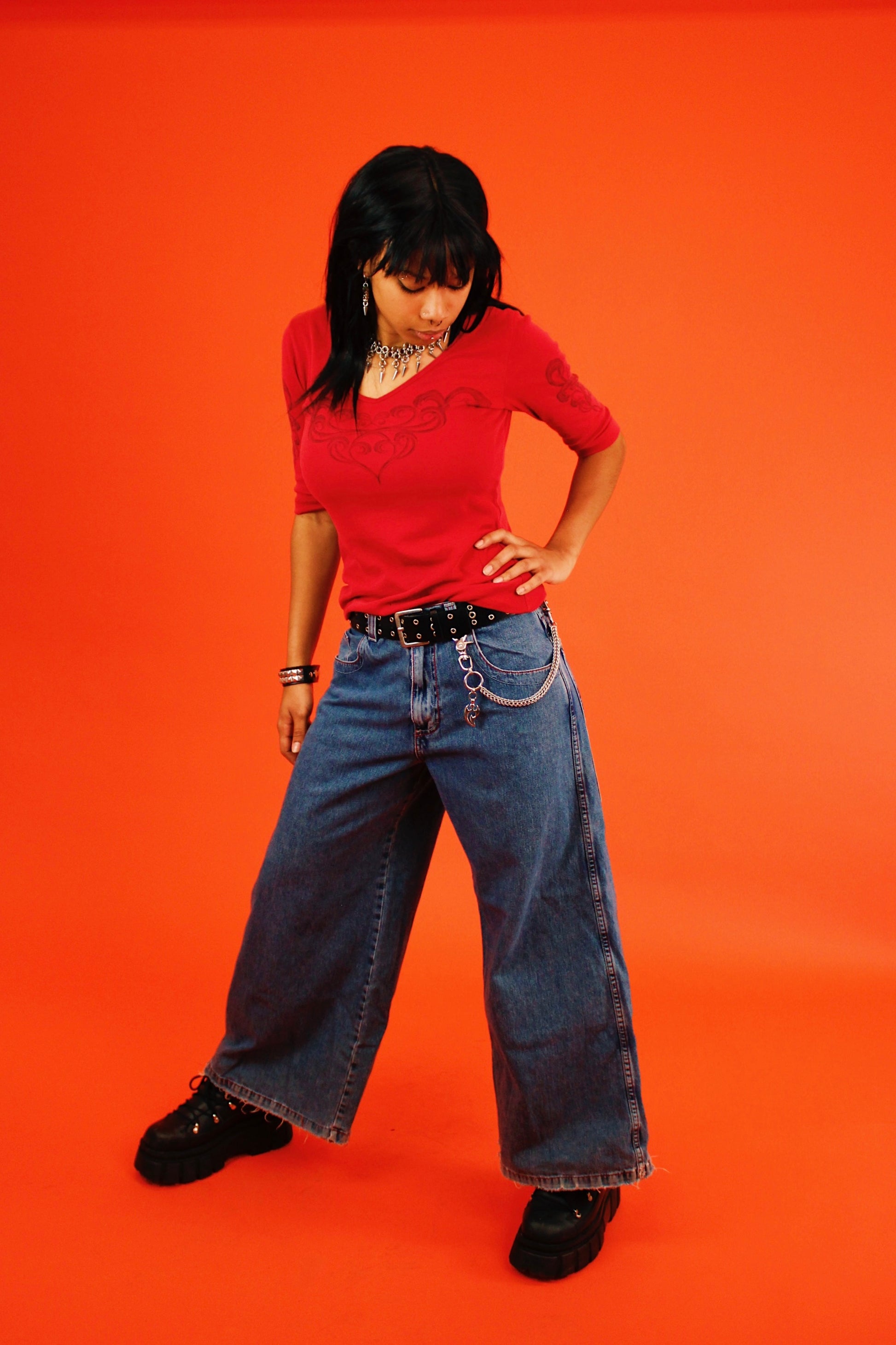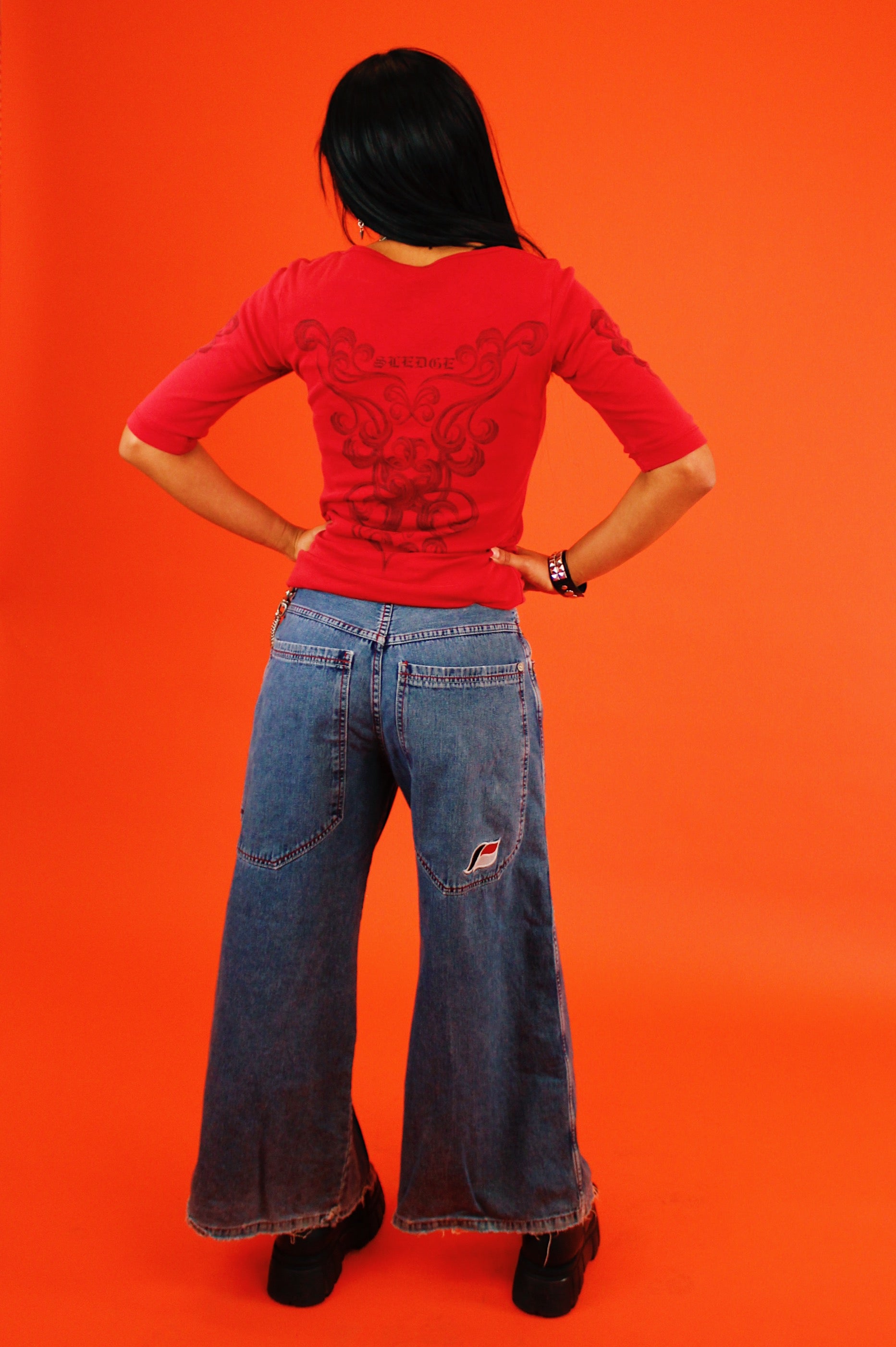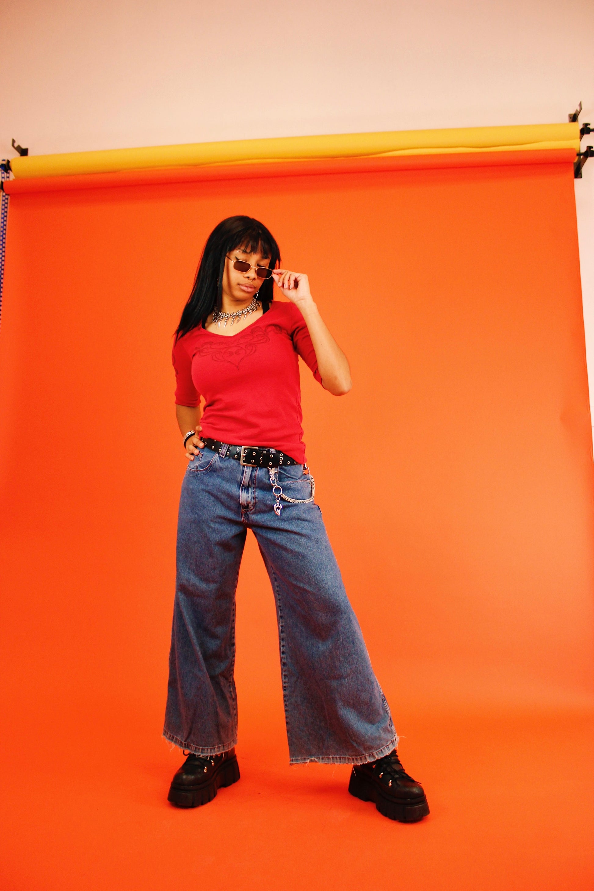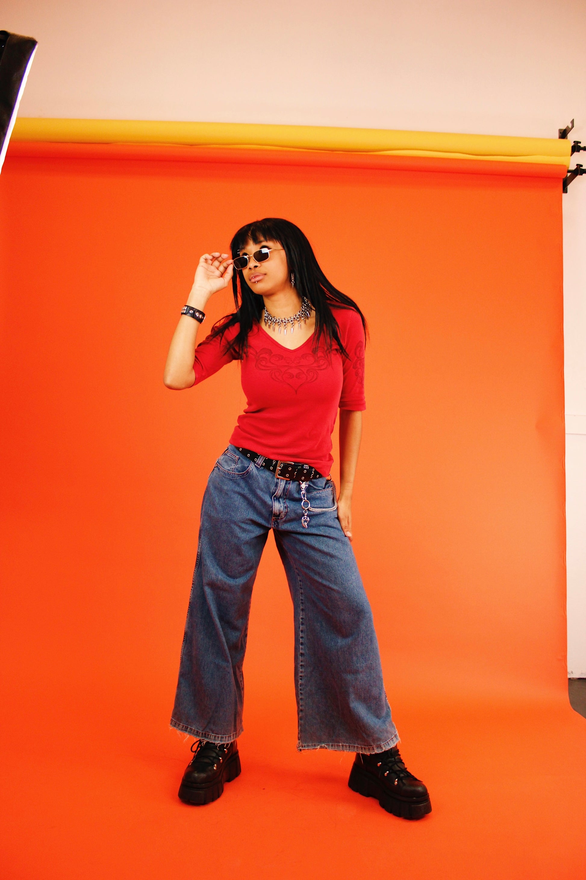 Vintage 90s tribal-gothic tee with a perfectly worn in feel. Has a logo print along the back in a traditional gothic font. Tag size M, 100% Combed Cotton. Best fits a S-L depending on desired fit. Seen on Kayla.