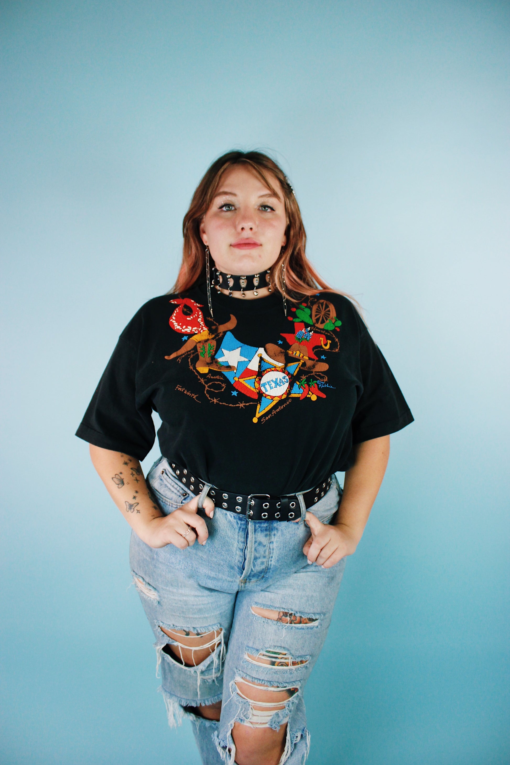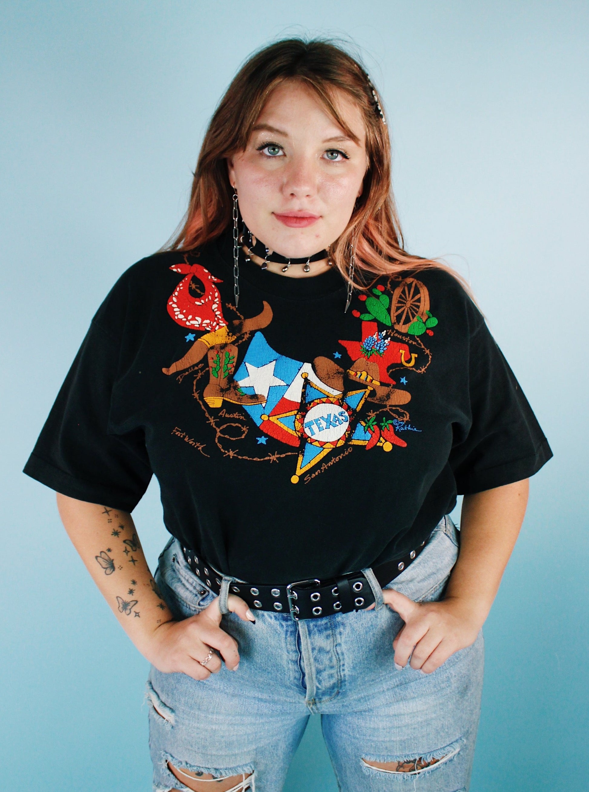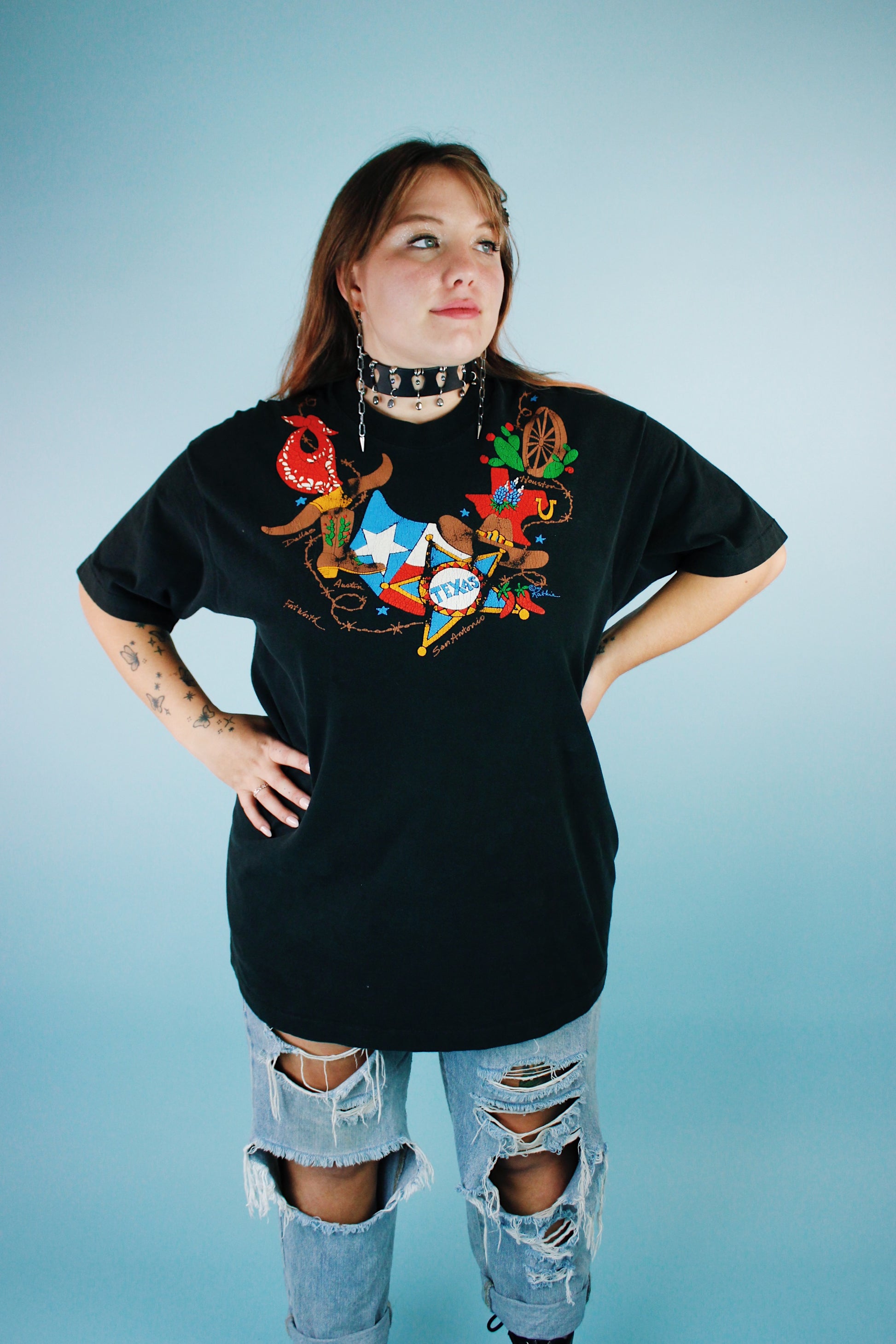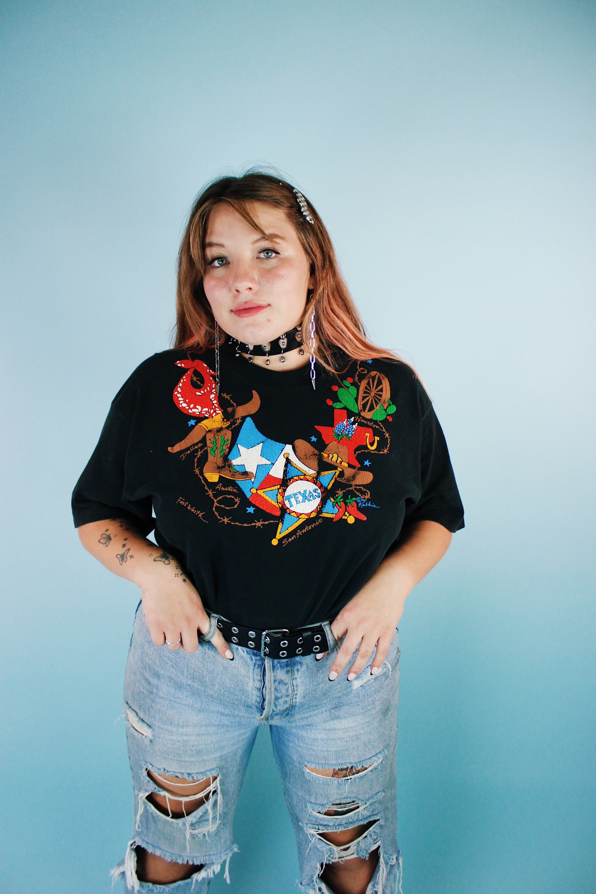 Vintage 90s Texas graphic tee with lots of fun classic western iconography. Has a barbed wire strand looping across the chest marking the major texas cities! Single stitched & comfy. Tag size XL adult, 100% Cotton. Best fits an XL-XXL. Seen on Amira.