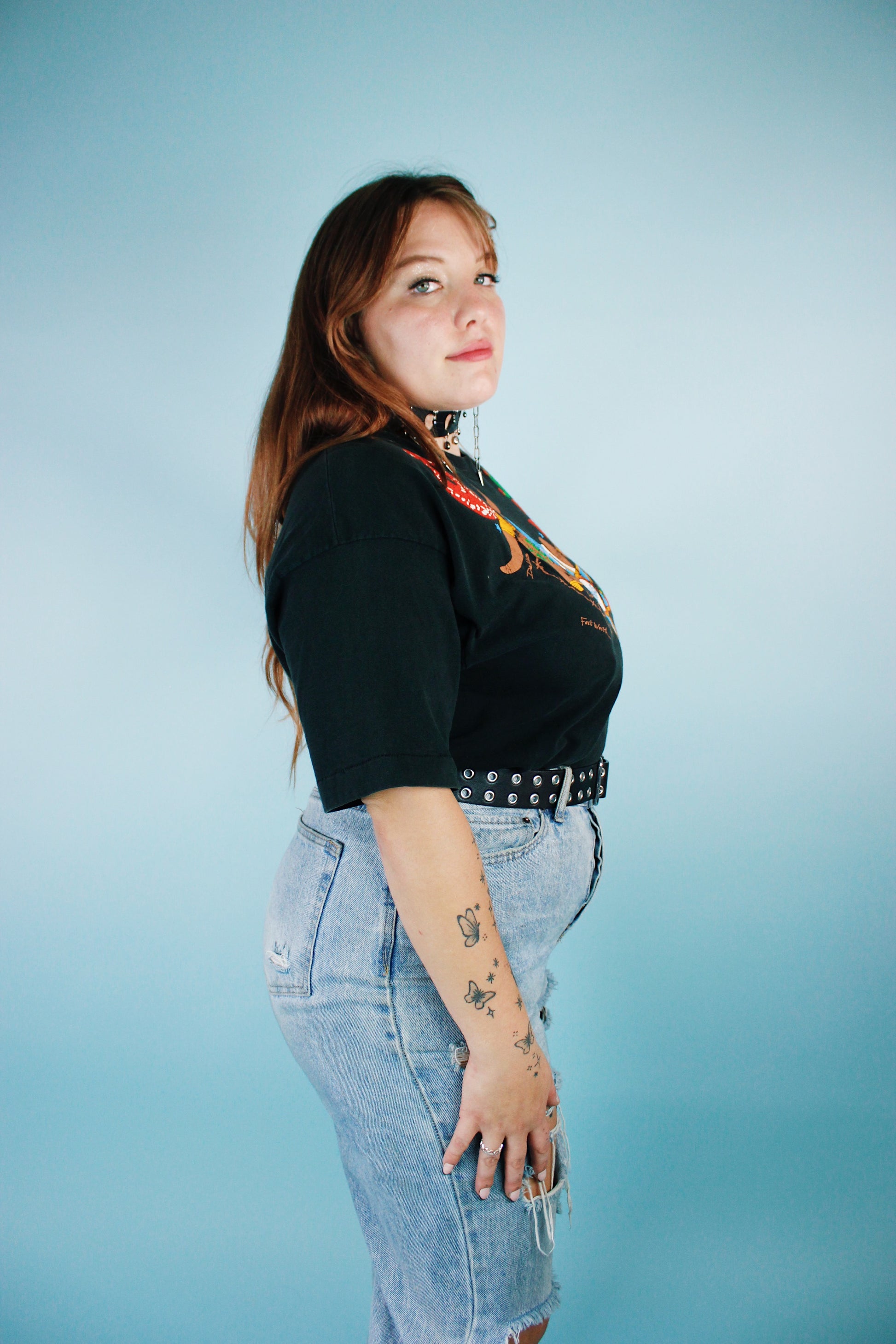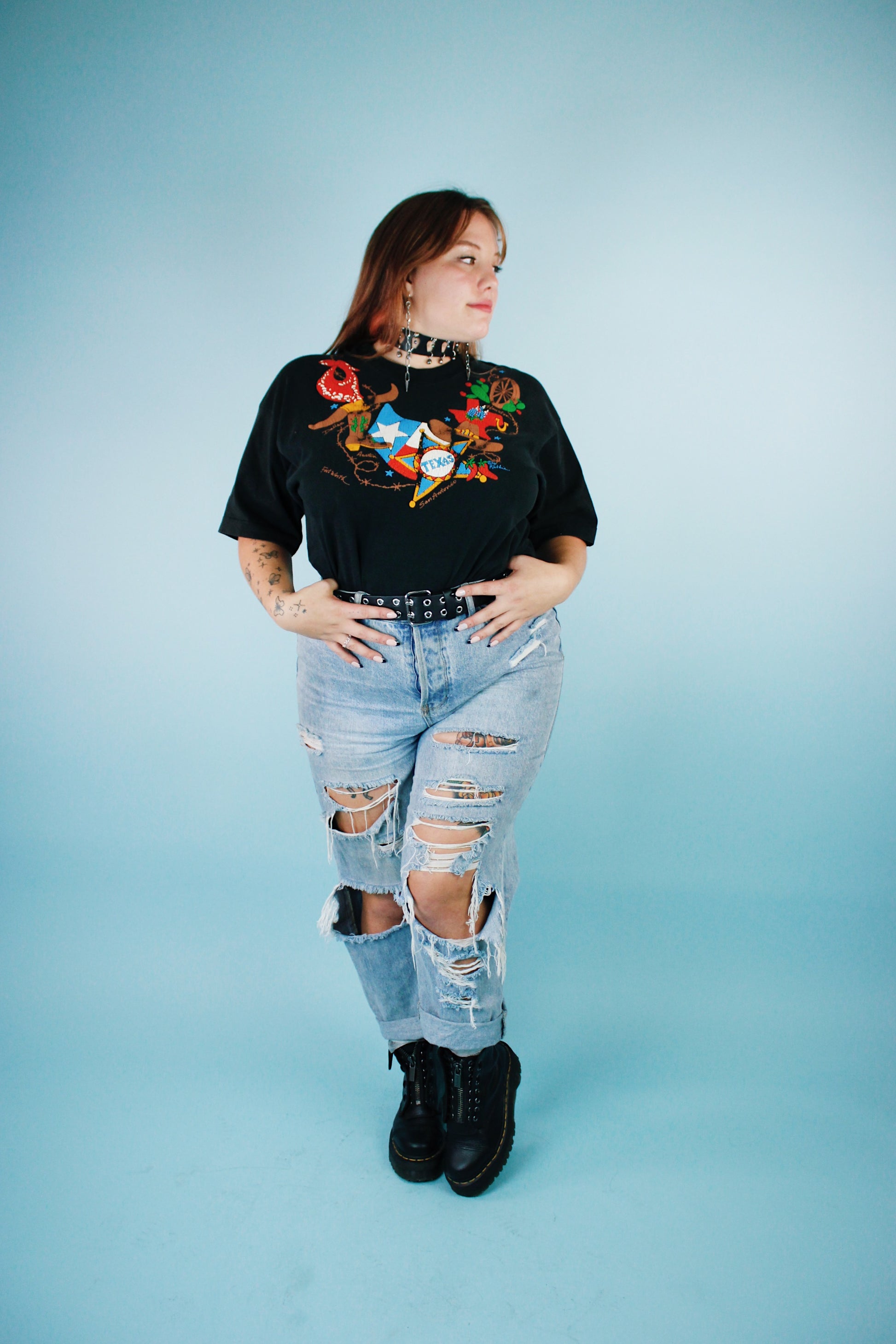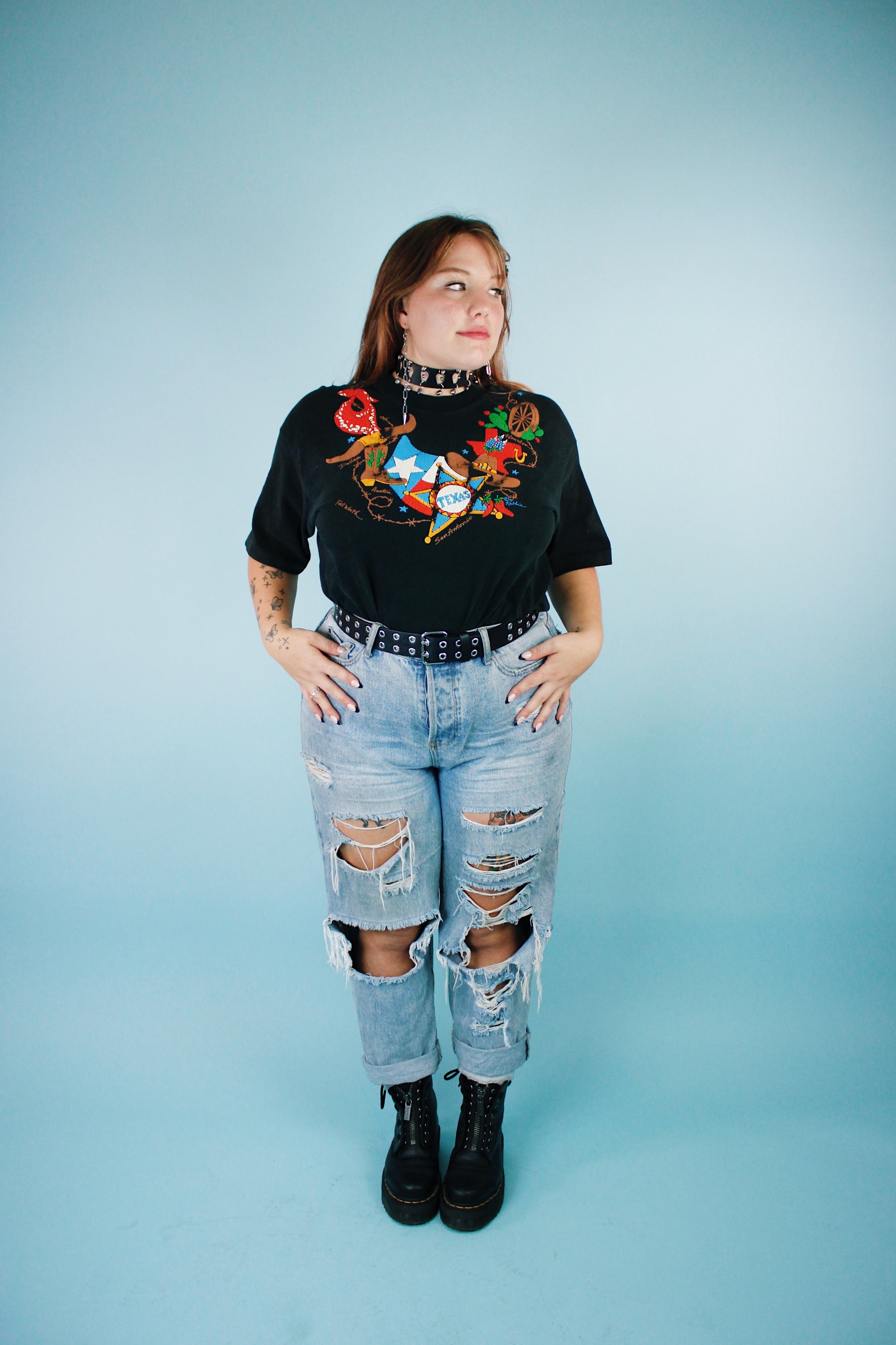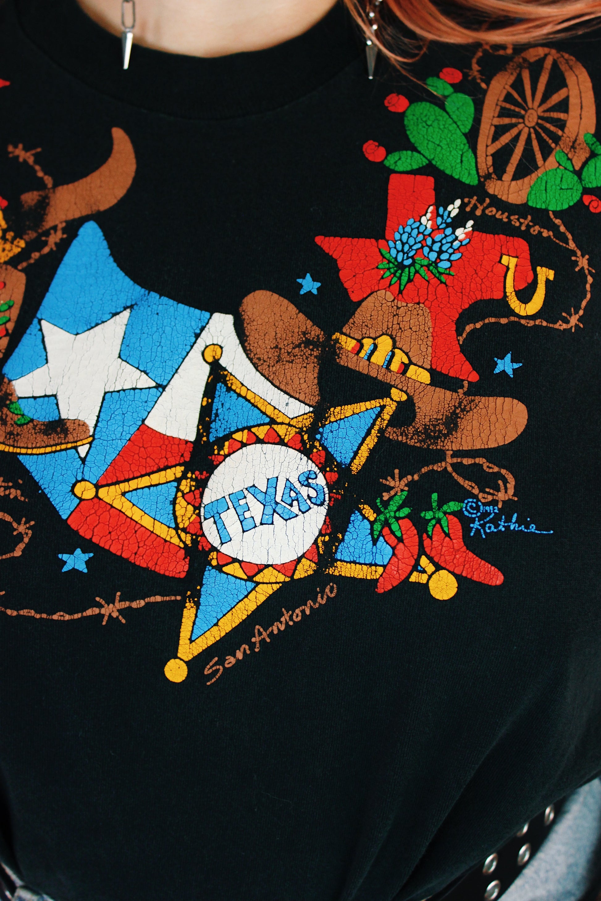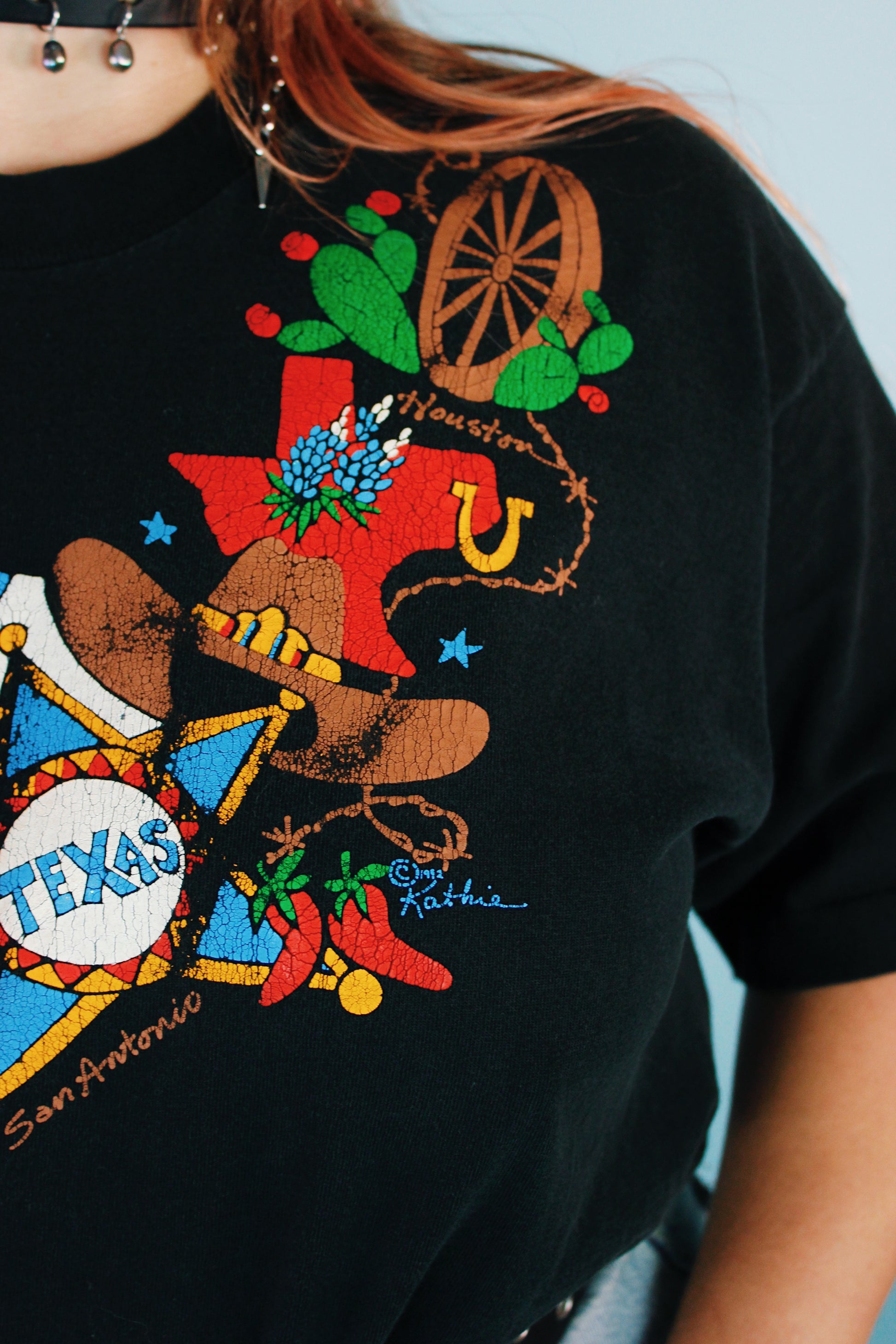 Vintage 90s Texas graphic tee with lots of fun classic western iconography. Has a barbed wire strand looping across the chest marking the major texas cities! Single stitched & comfy. Tag size XL adult, 100% Cotton. Best fits an XL-XXL. Seen on Amira.