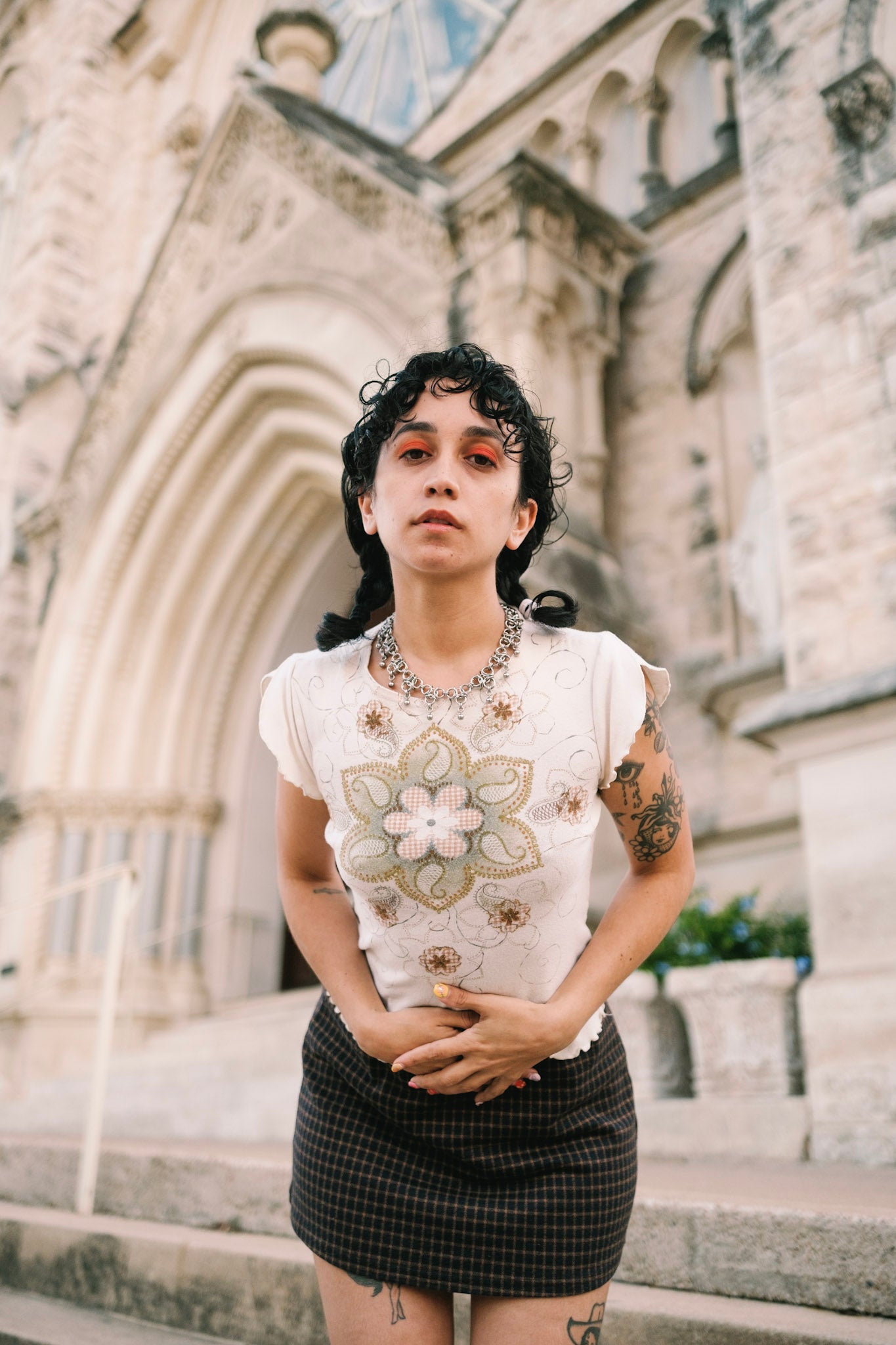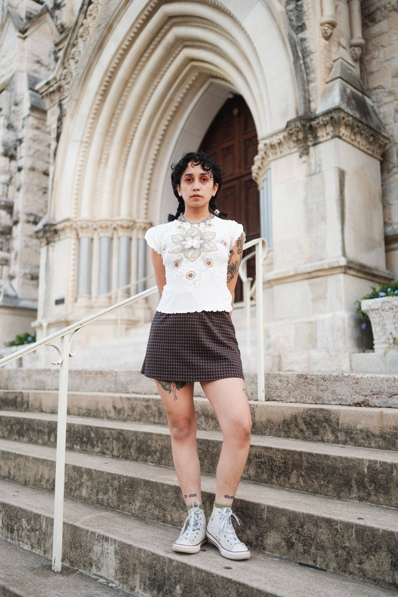 Vintage 90s neutral tone floral tee. Micro beaded details in sage and earth tones with flutter sleeve details and lettuce trim along the edges and hem. By F.A.N.G. Tag size youth L. Best fits an XXS-M (has lots of stretch with a baby tee fit). Seen on Justina.