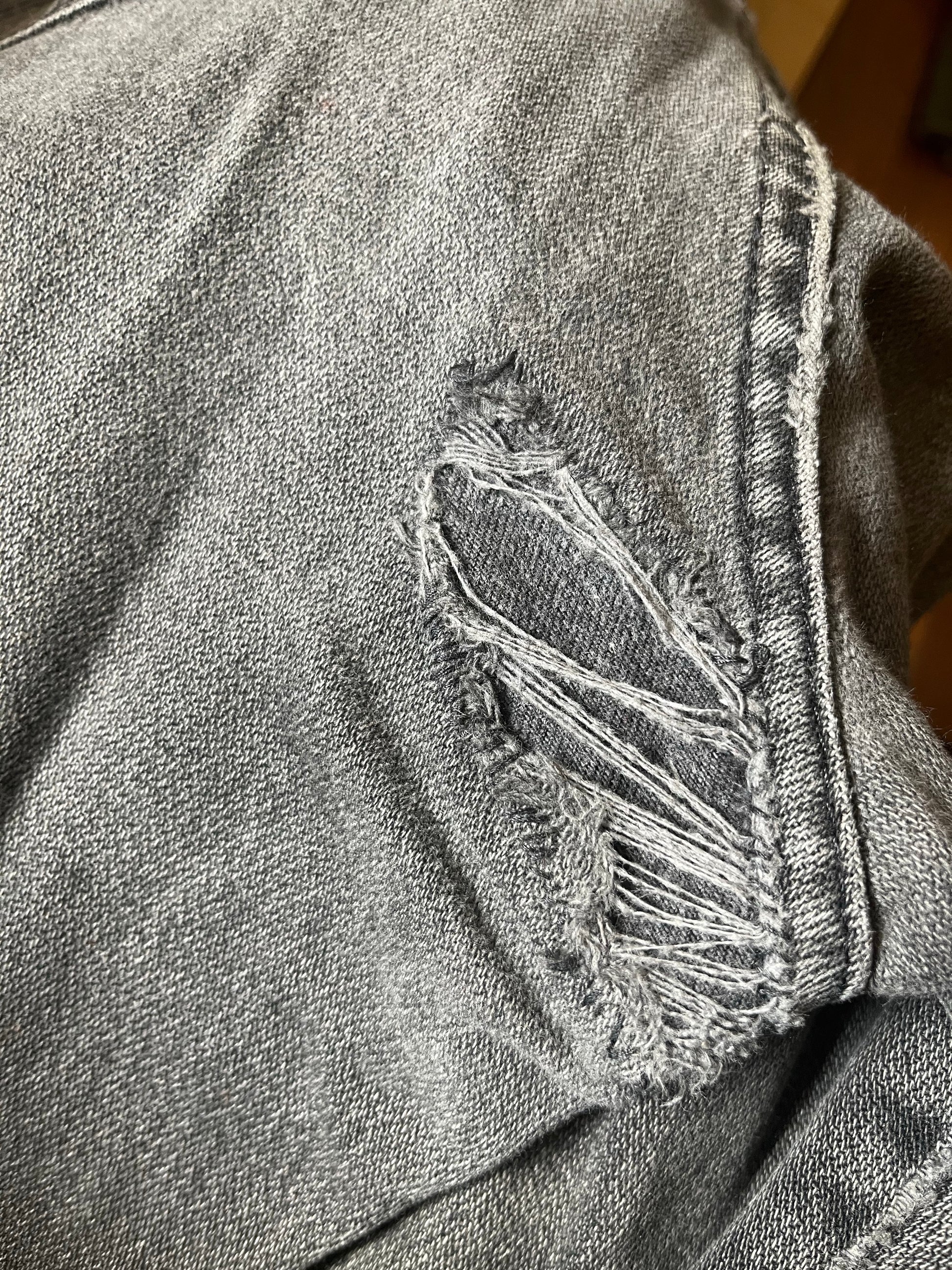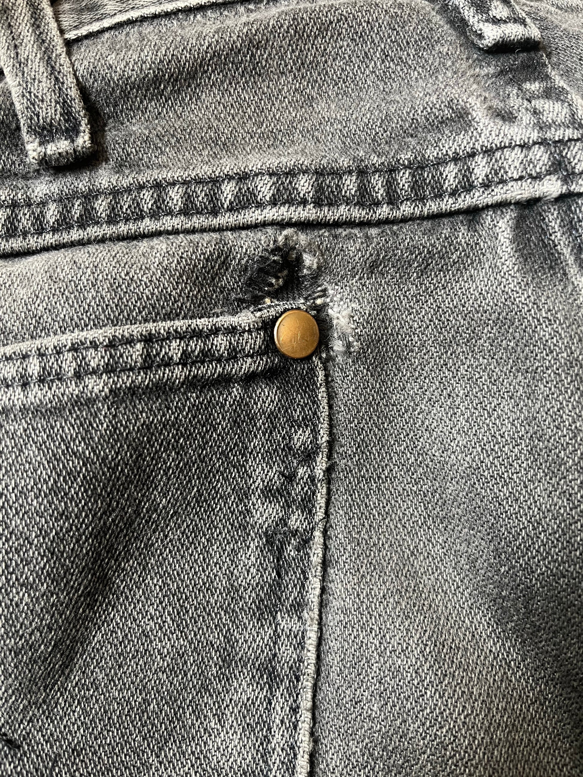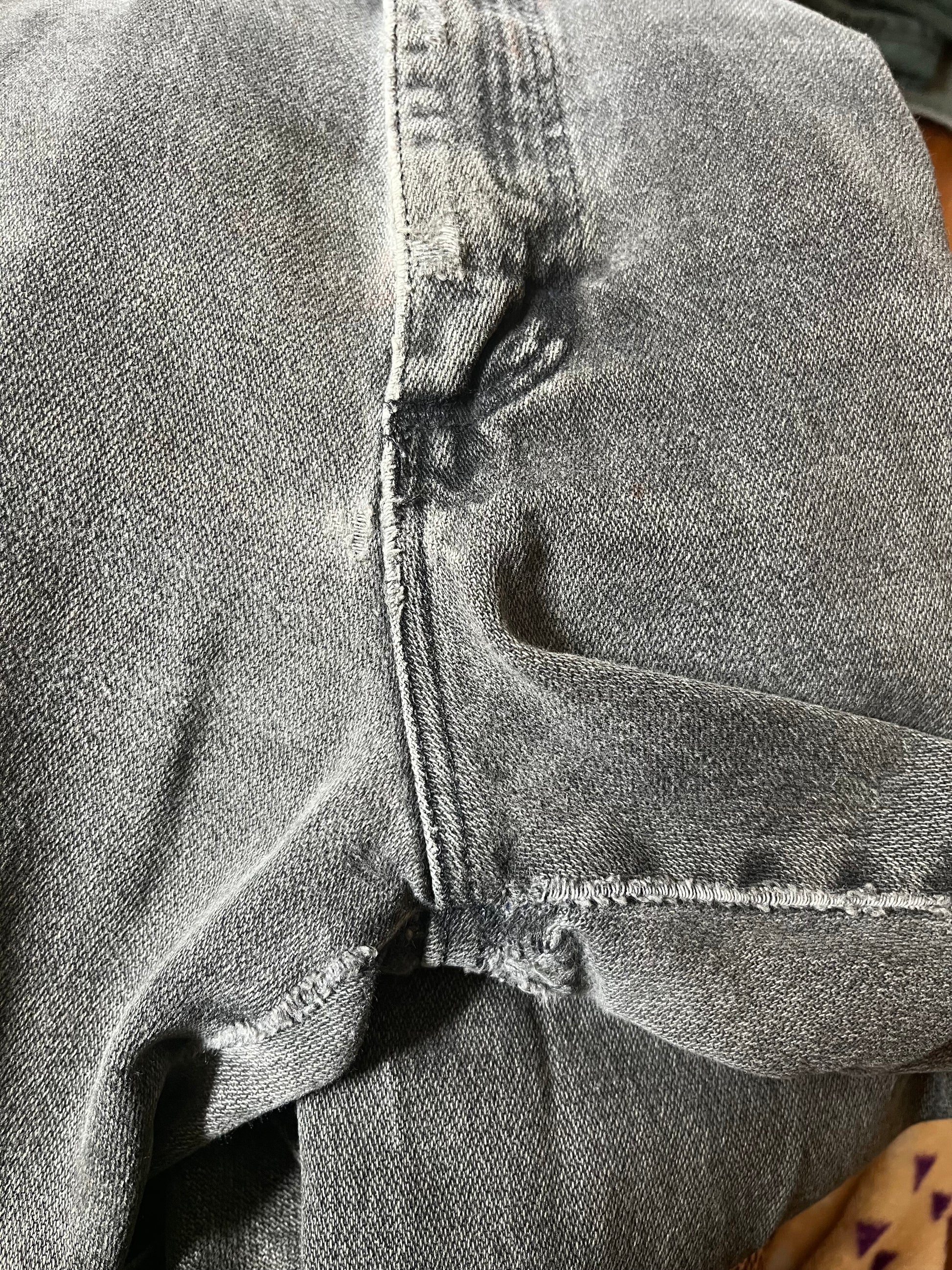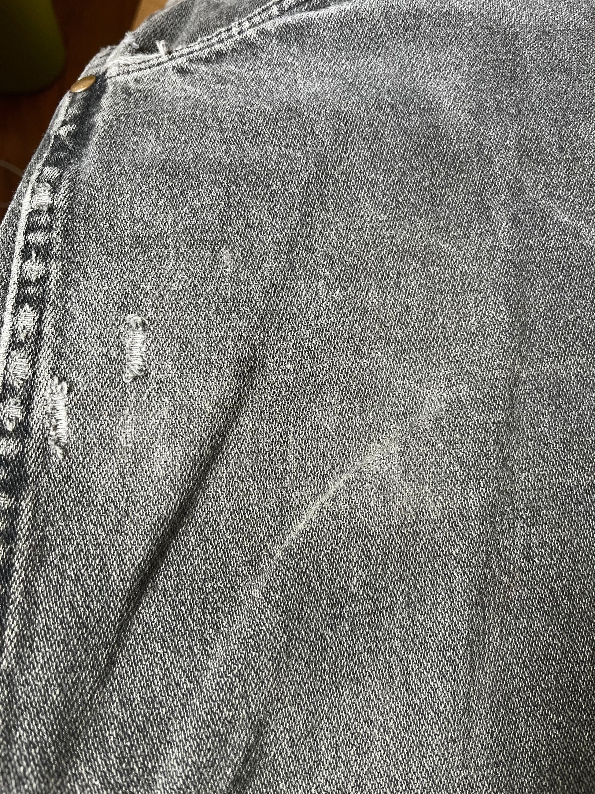 6/10, fading, discoloration, some spots throughout, tear in the butt & corner of the pockets has been patched with scrap denim