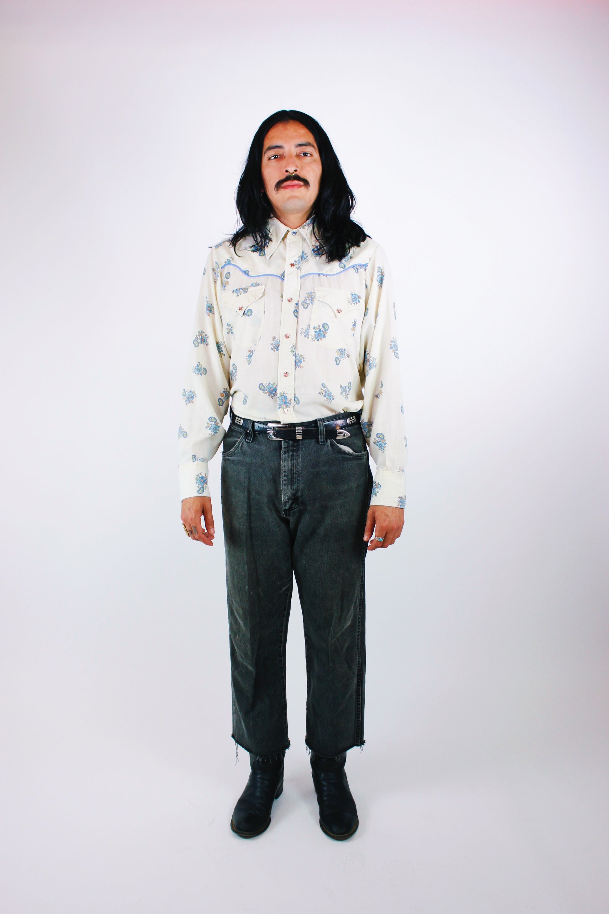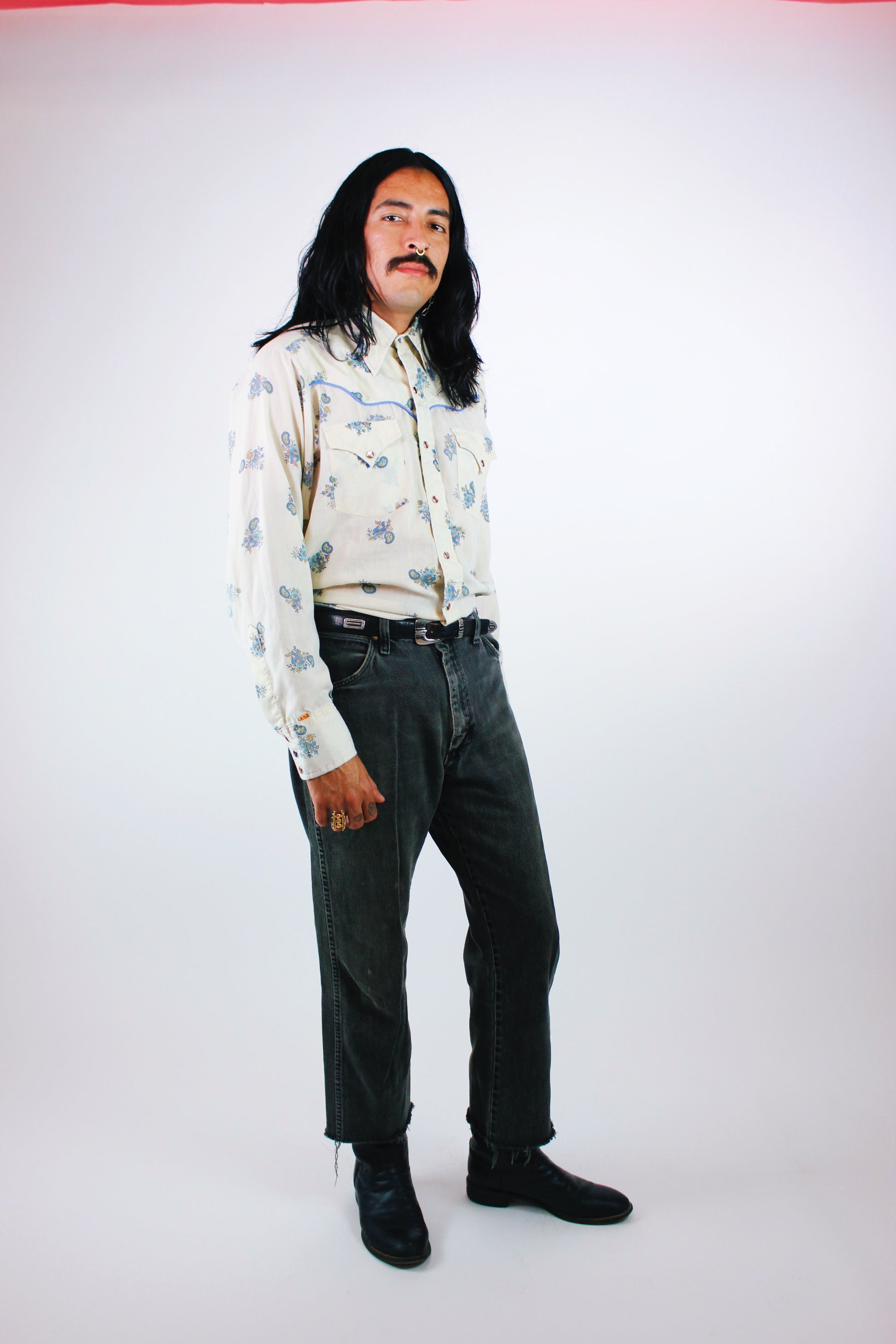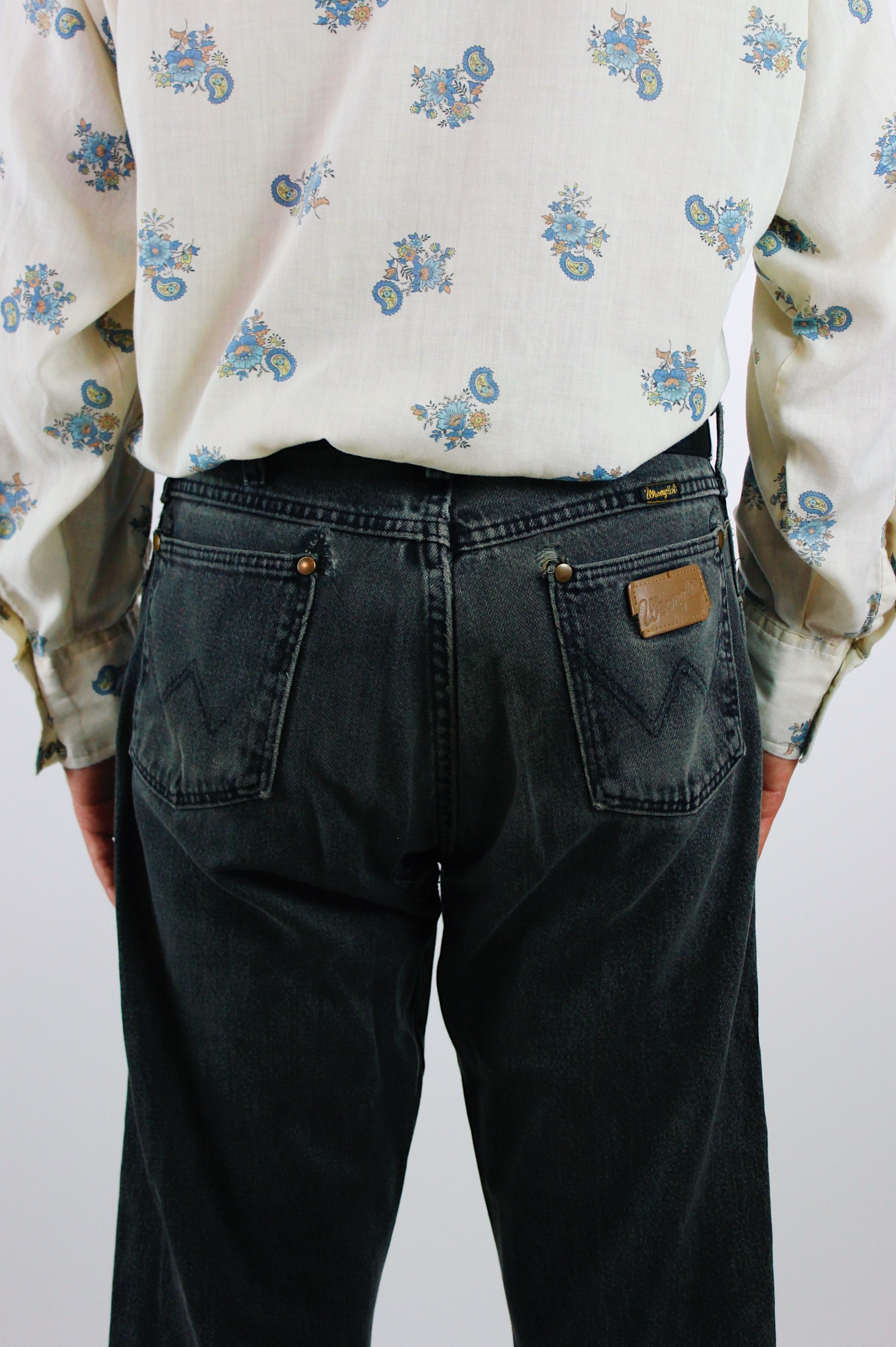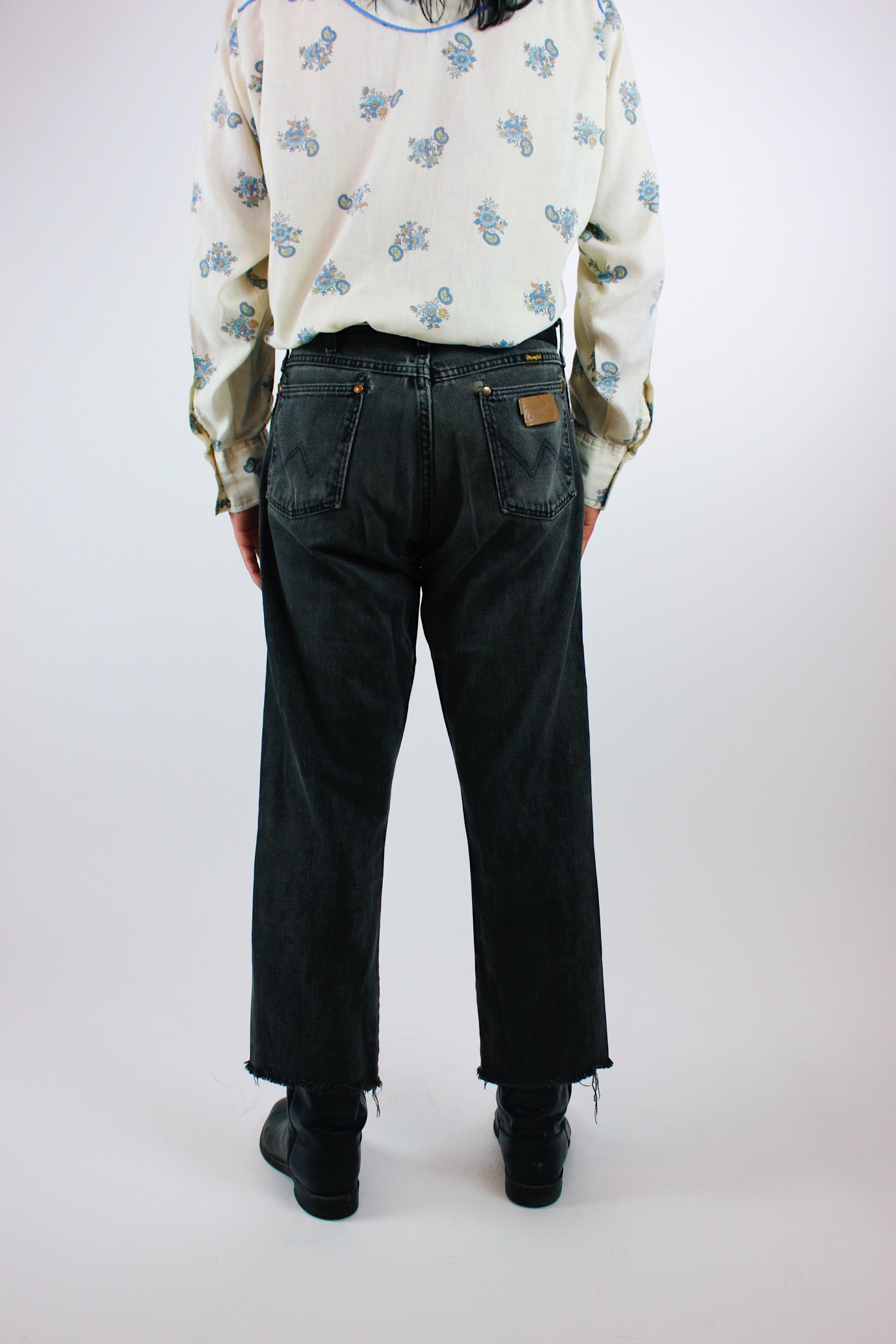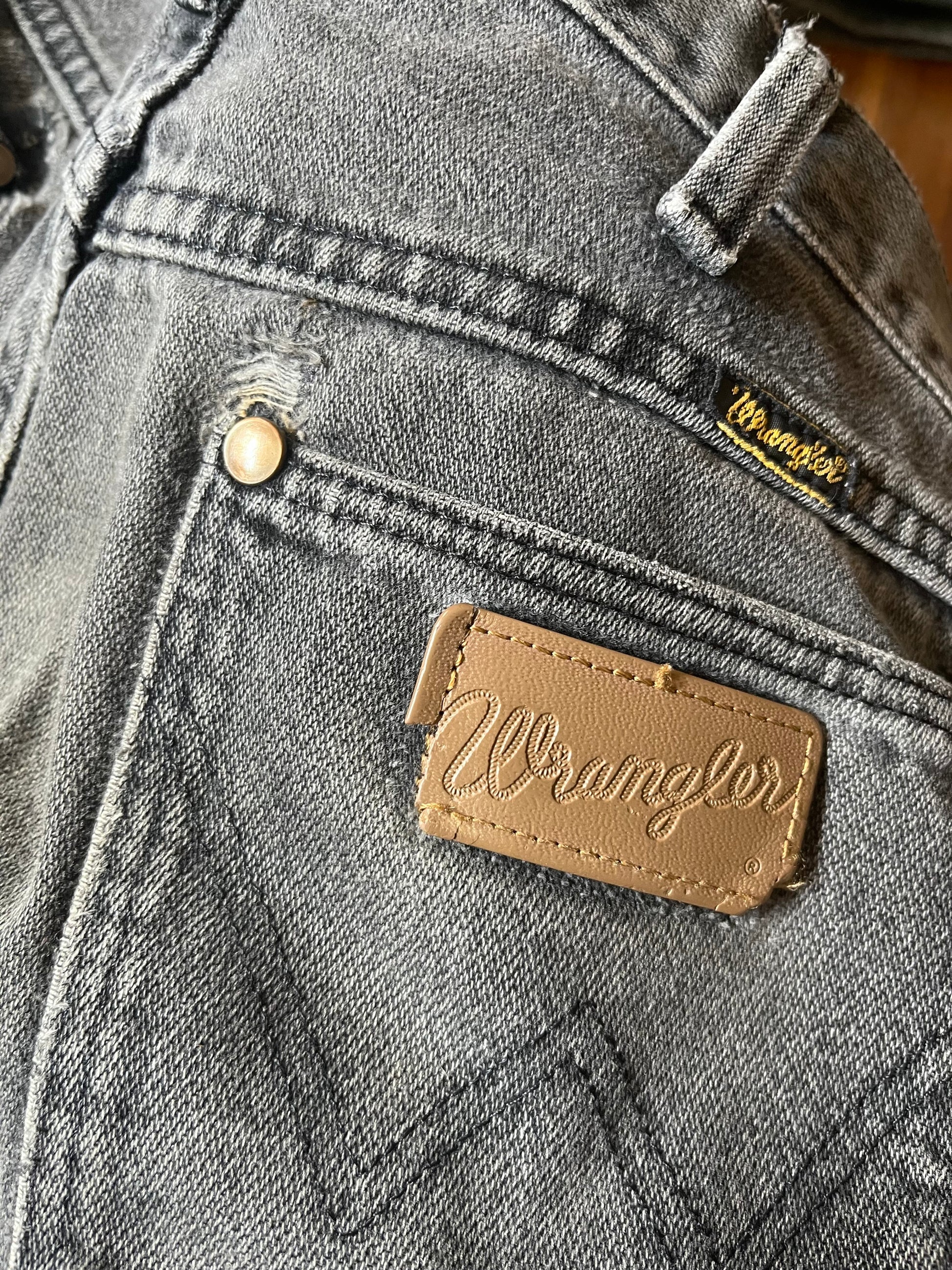 Vintage 90s black washed and distressed Wrangler's with frayed edges. These have been well loved and patched up by me. Tag is washed. Best fits a M. Seen on Michael.