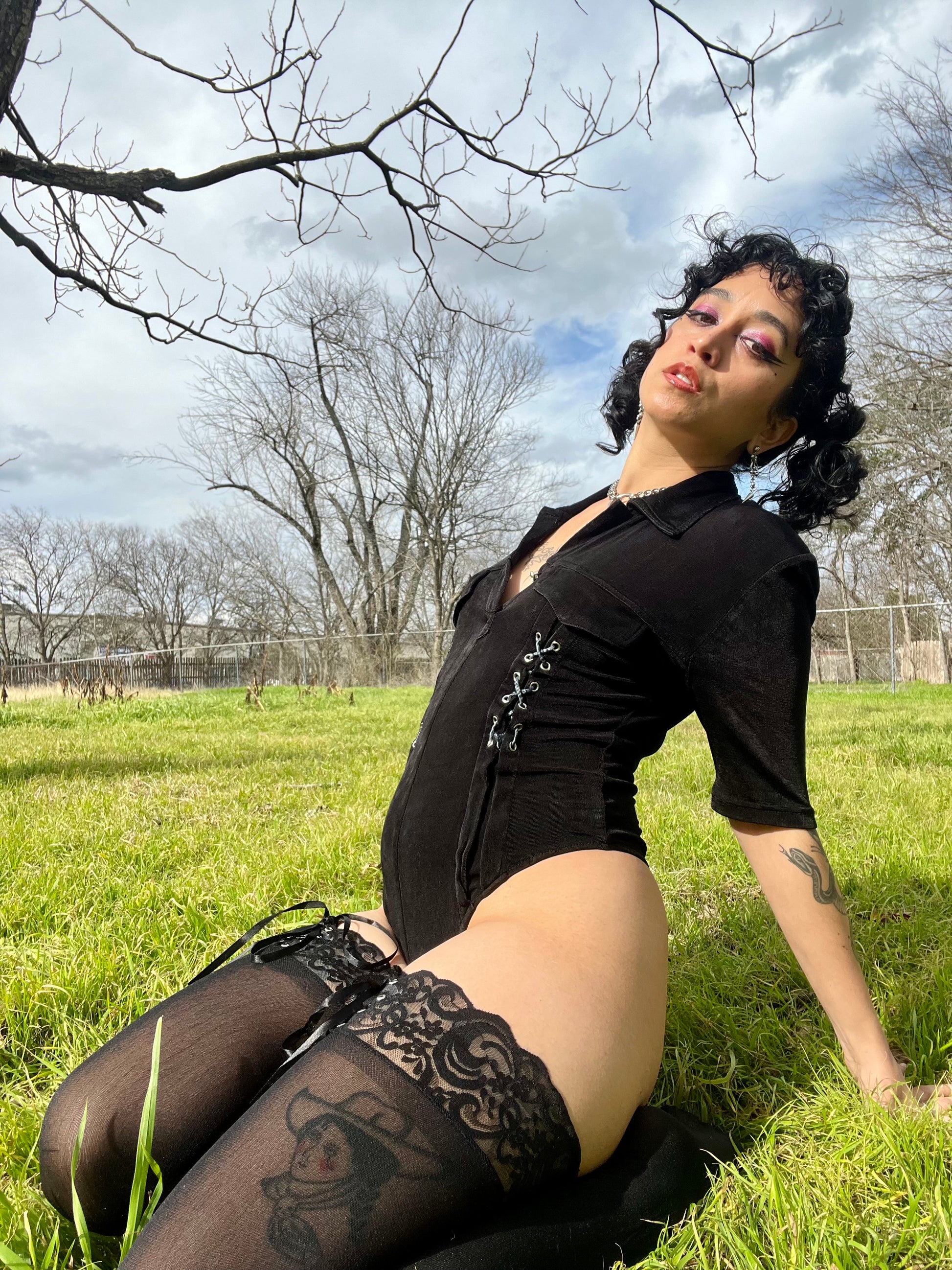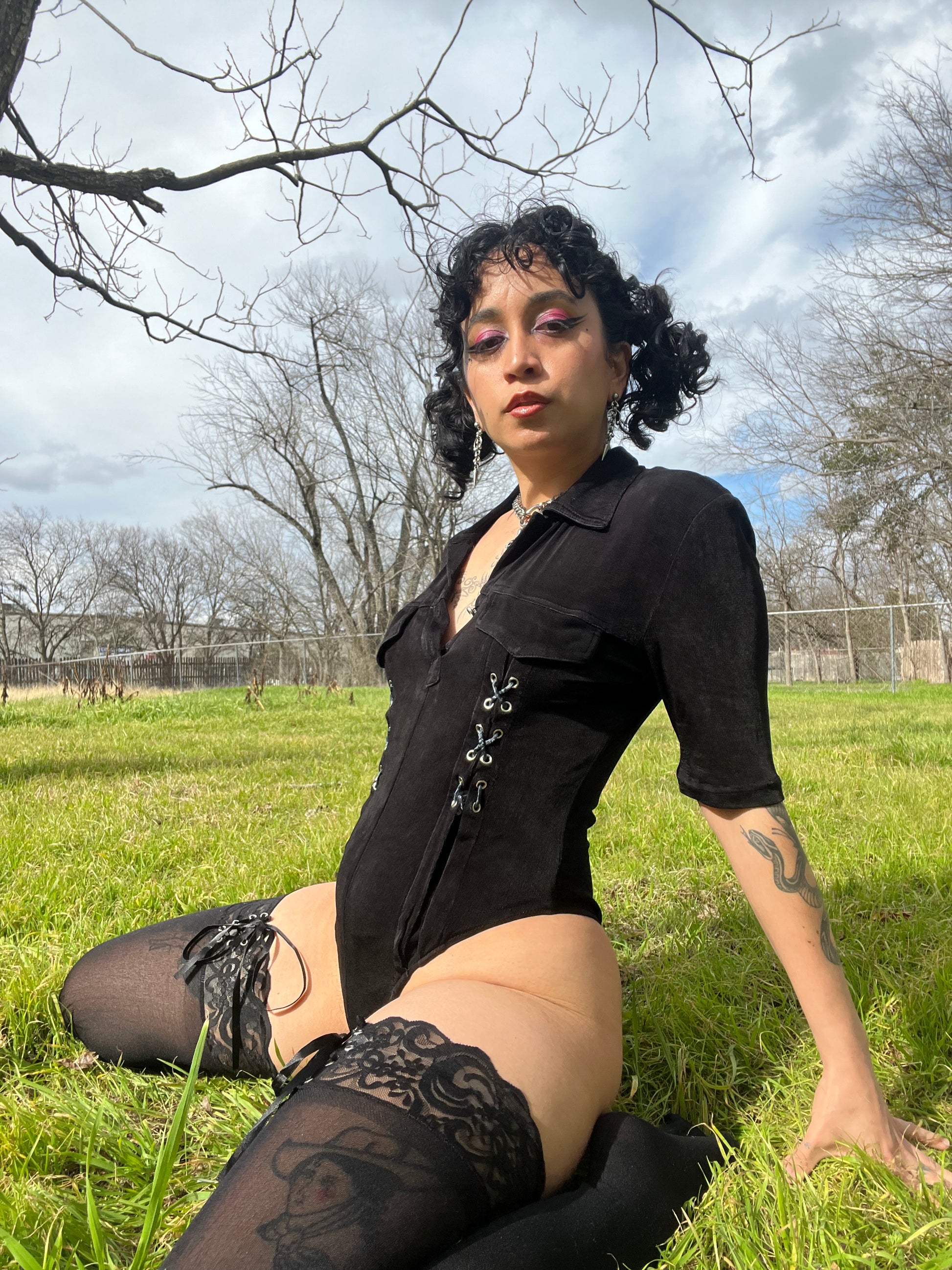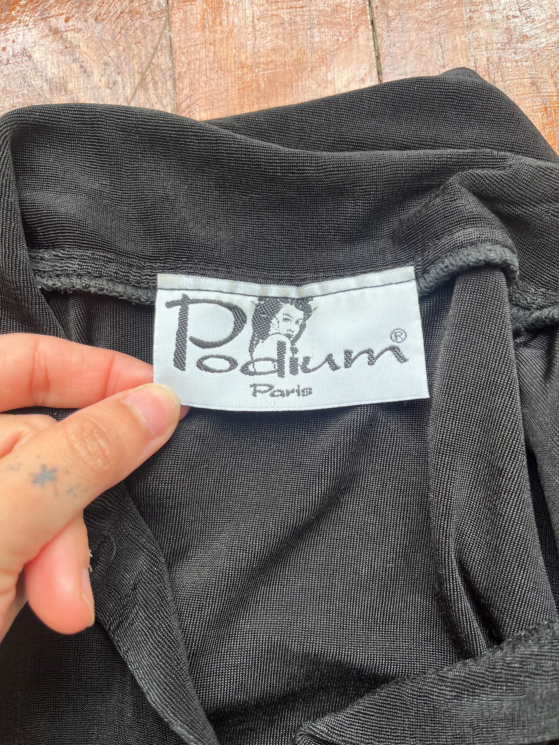 Vintage 90s black stretchy bodysuit with sexy grommet + lace up details. By Podium Paris [amazing tag]. Best fits a S-L, extremely stretchy. Seen on Justina.