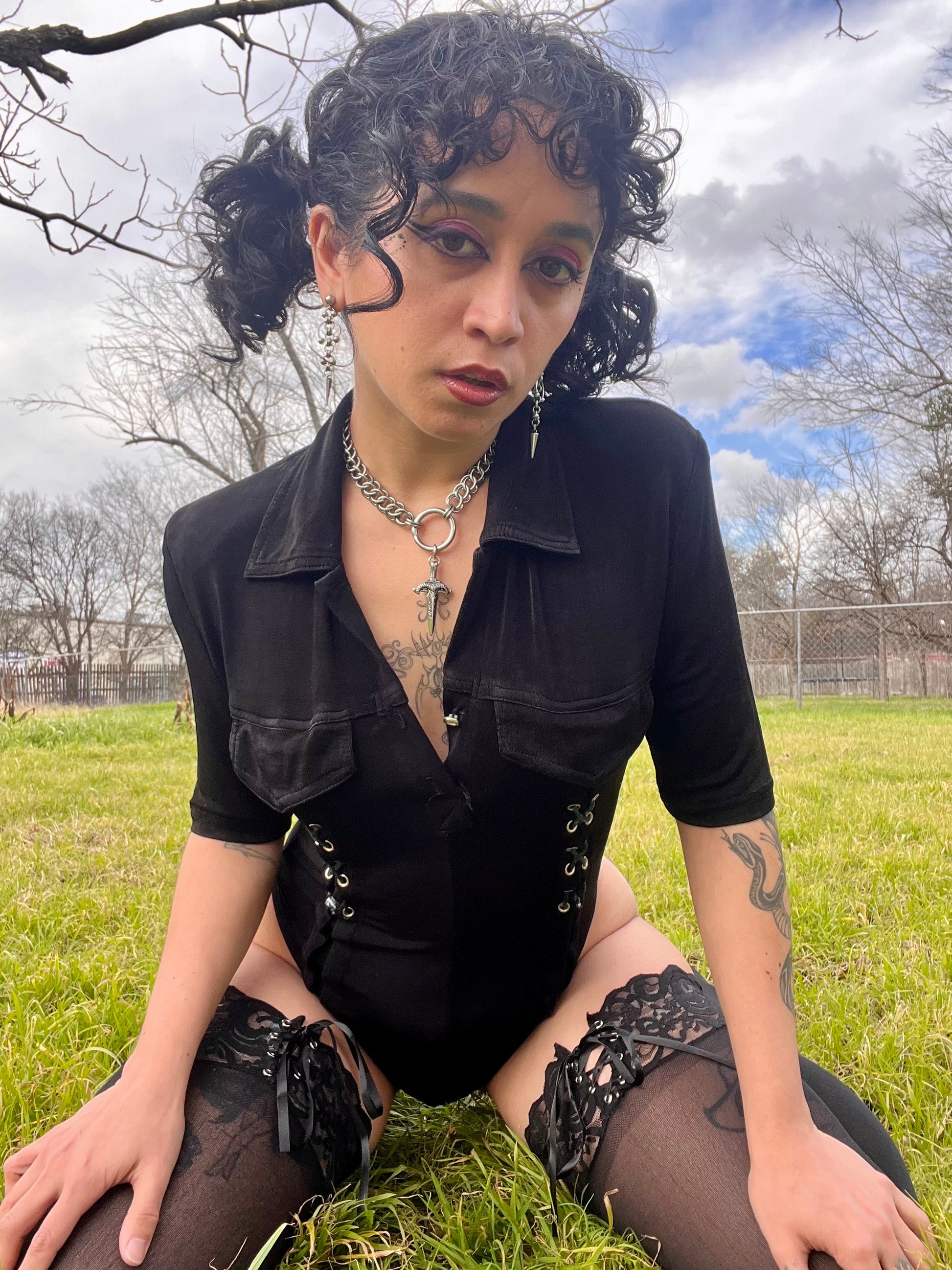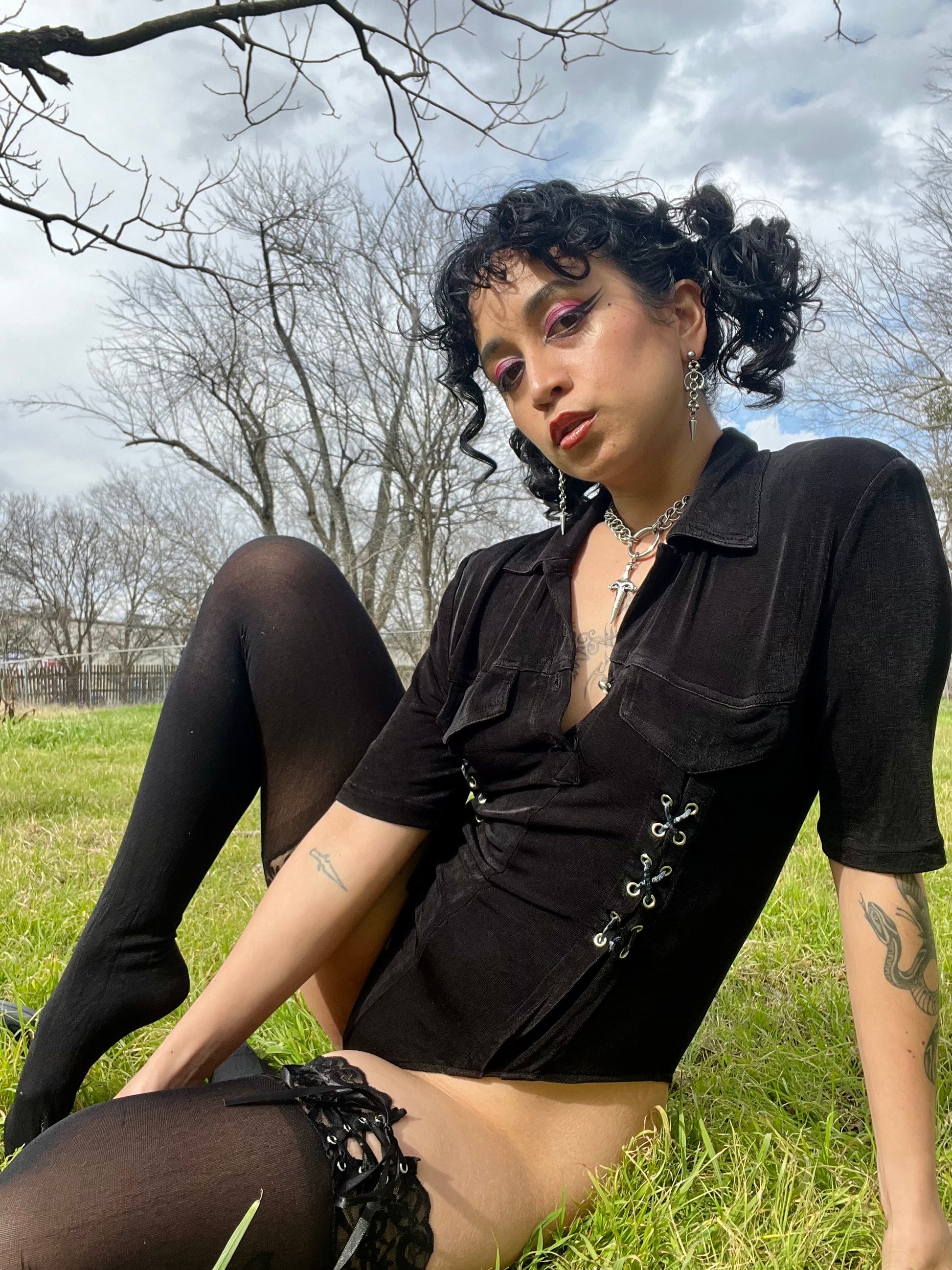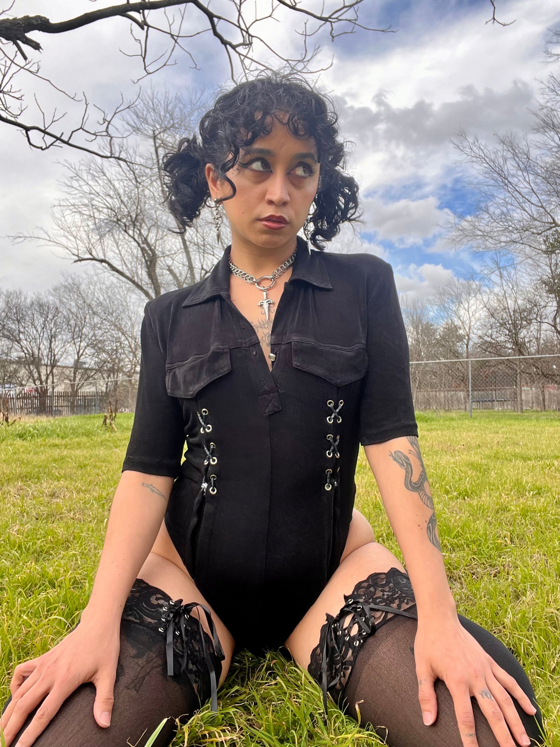 Vintage 90s black stretchy bodysuit with sexy grommet + lace up details. By Podium Paris [amazing tag]. Best fits a S-L, extremely stretchy. Seen on Justina.