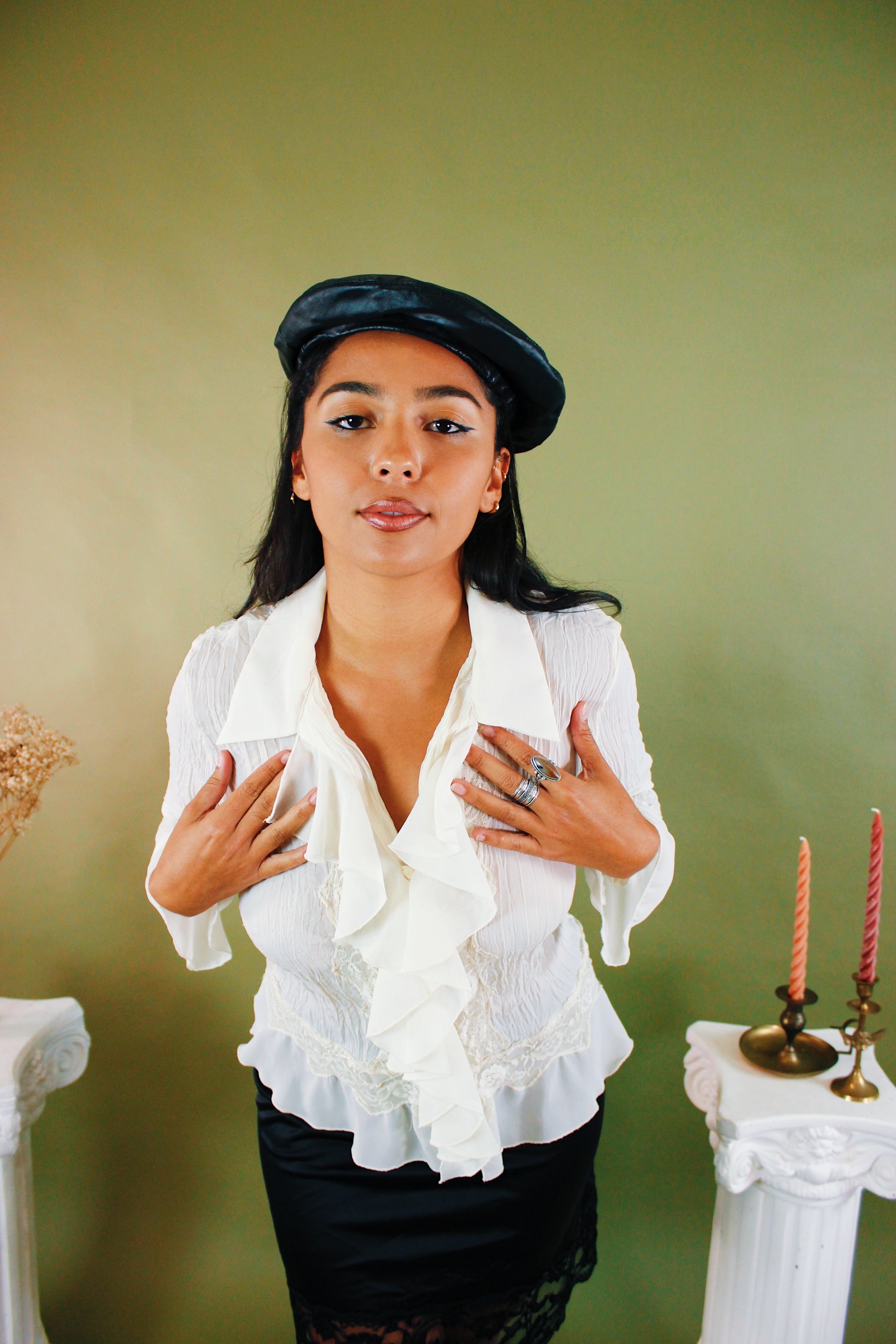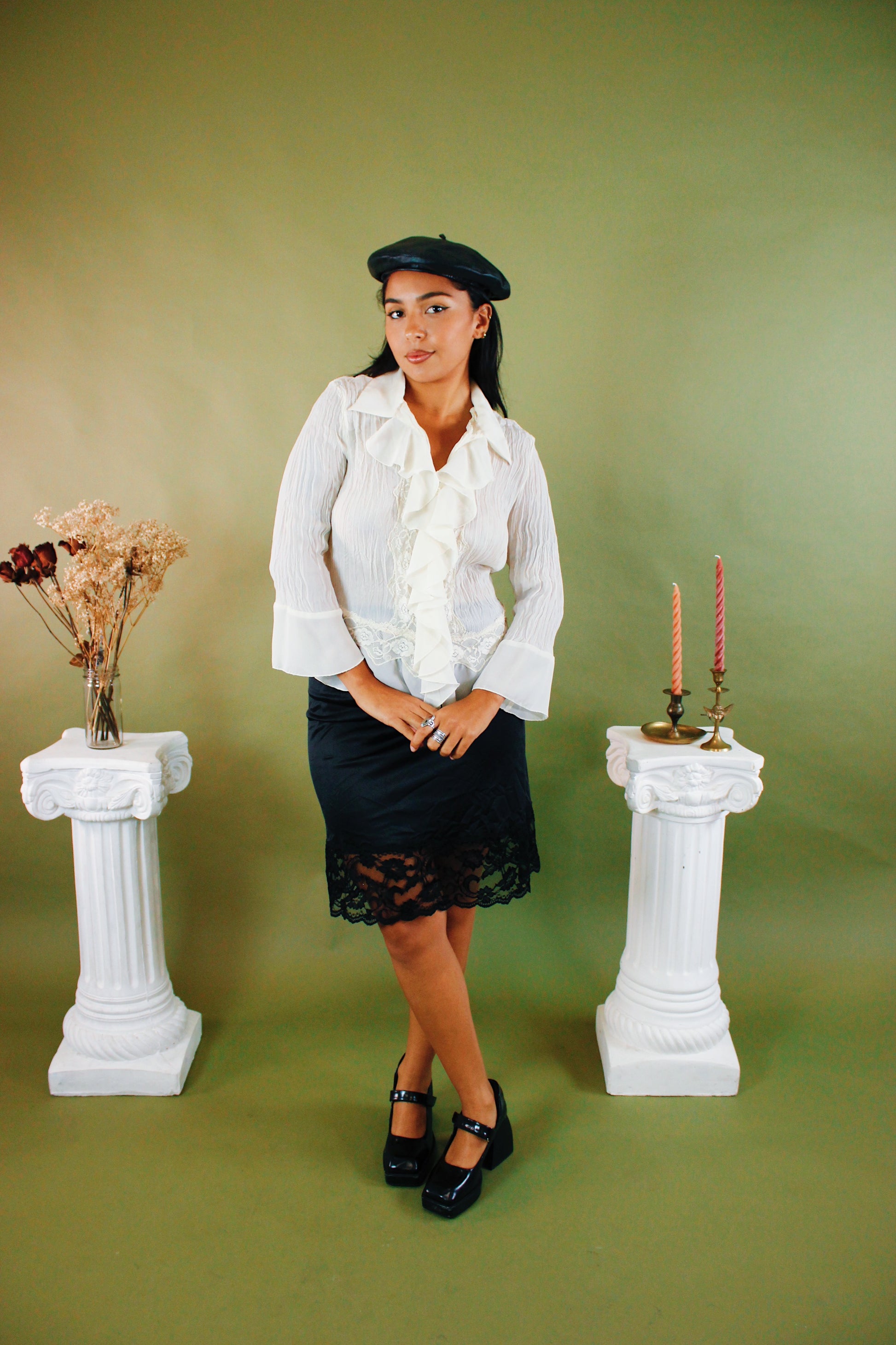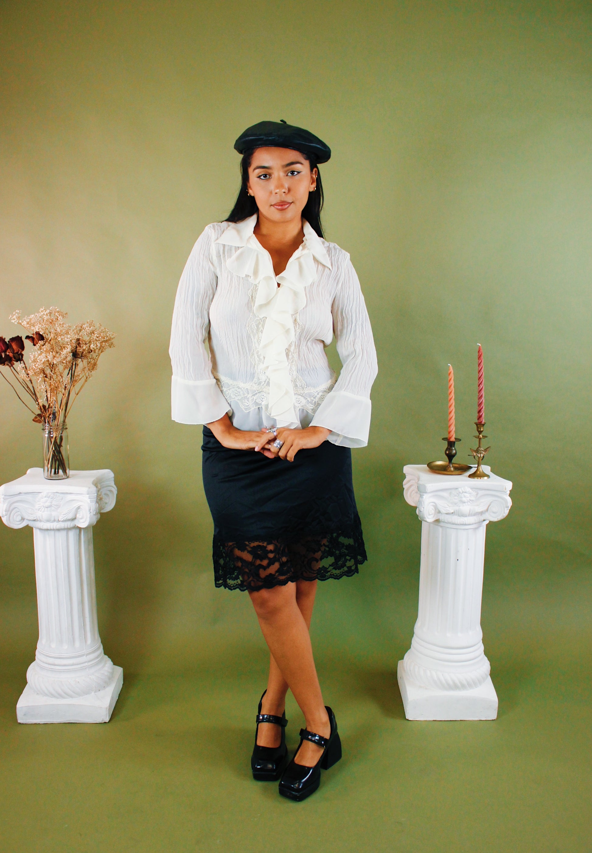 Vintage 90s/y2k gauzy white button up with lace details and flared sleeves. Absolutely divine texture with so much fun styling potential. By Allison Taylor. Best fits a M-L, 100% Polyester. Seen on Sam.