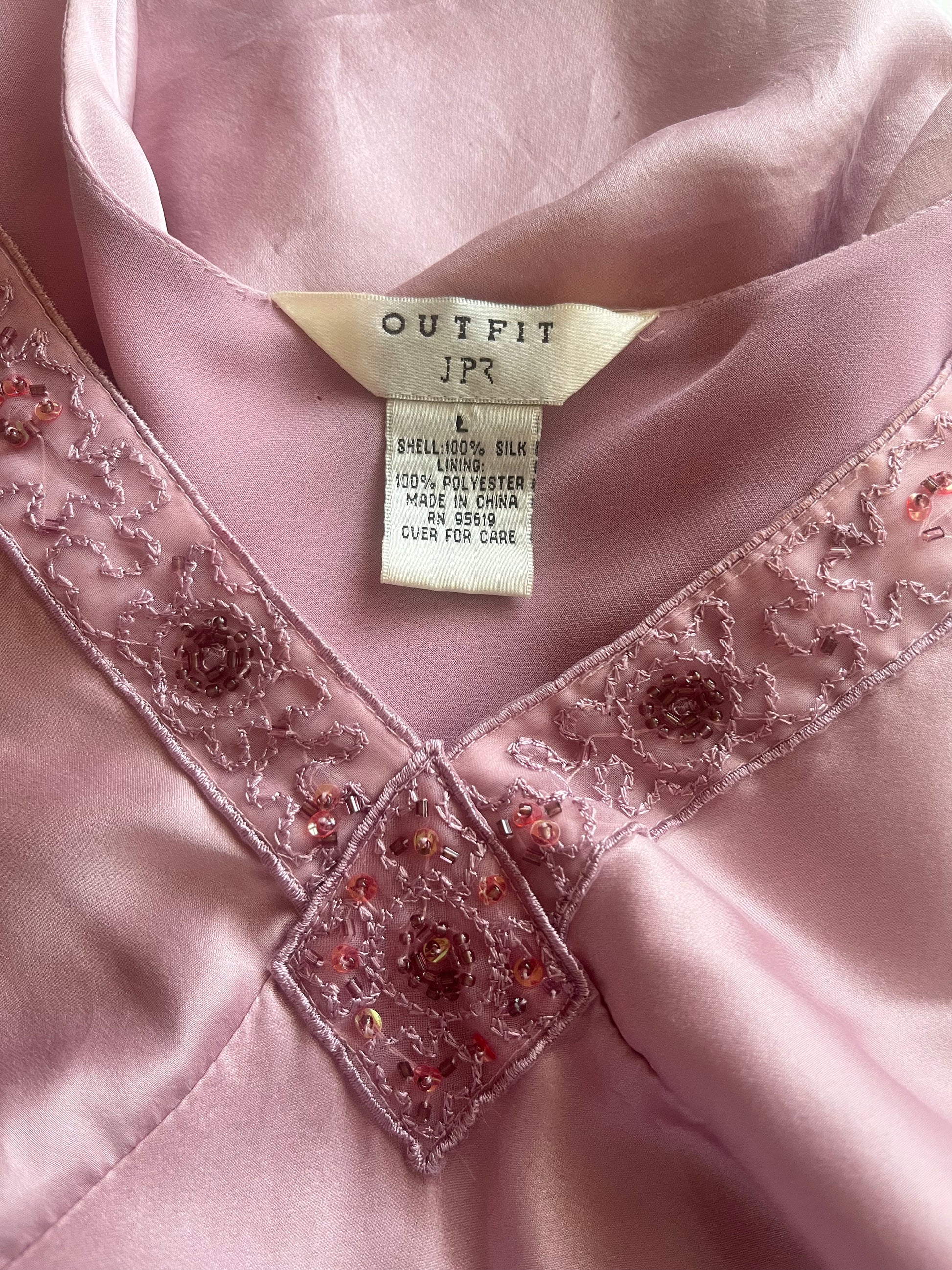 Vintage 90s/y2k mauve silk slip tank with the cutest swirly beaded neckline. By JPR. Tag size L, 100% Silk w/ Poly lining. Best fits a L. Seen on Max.