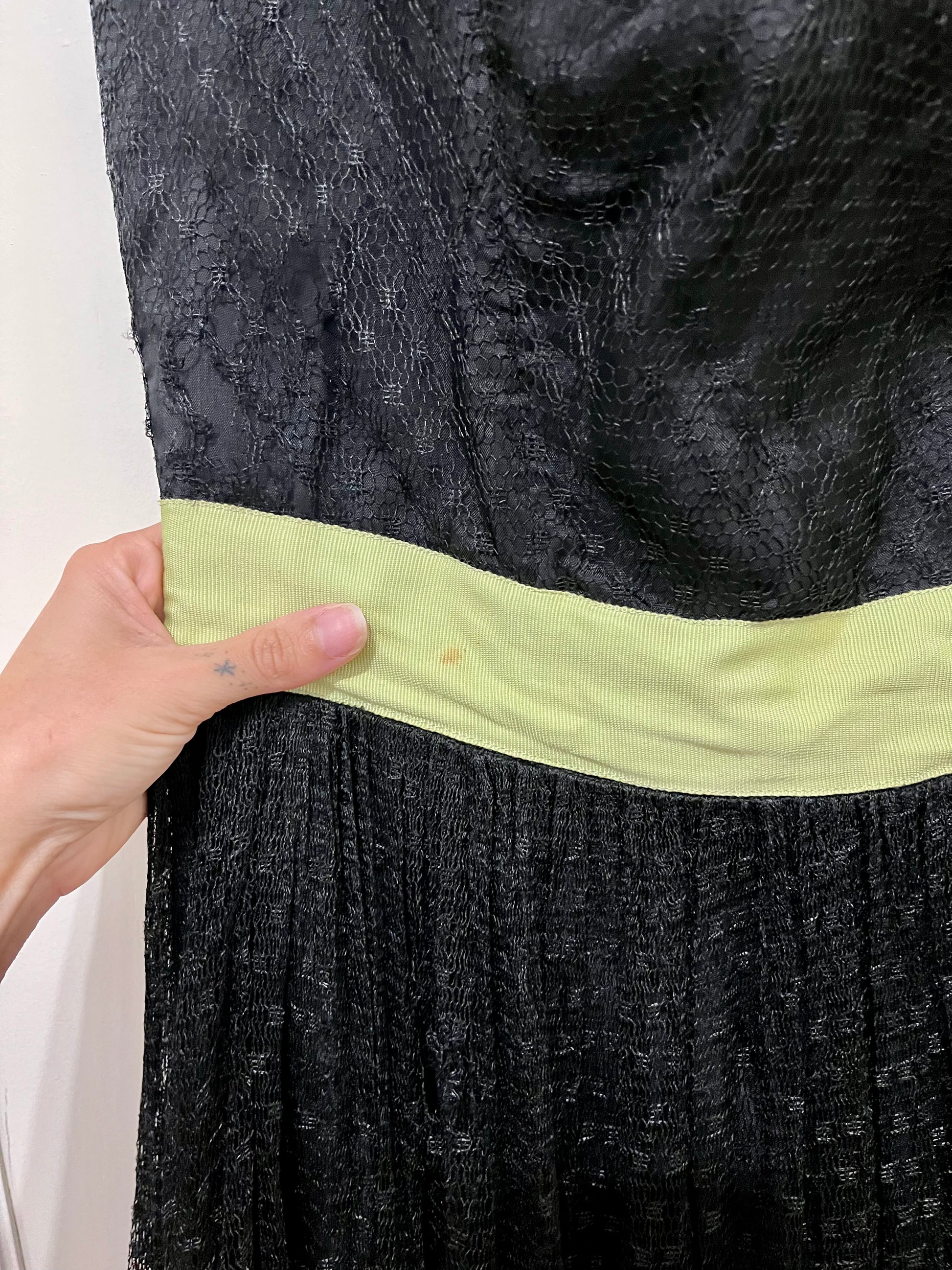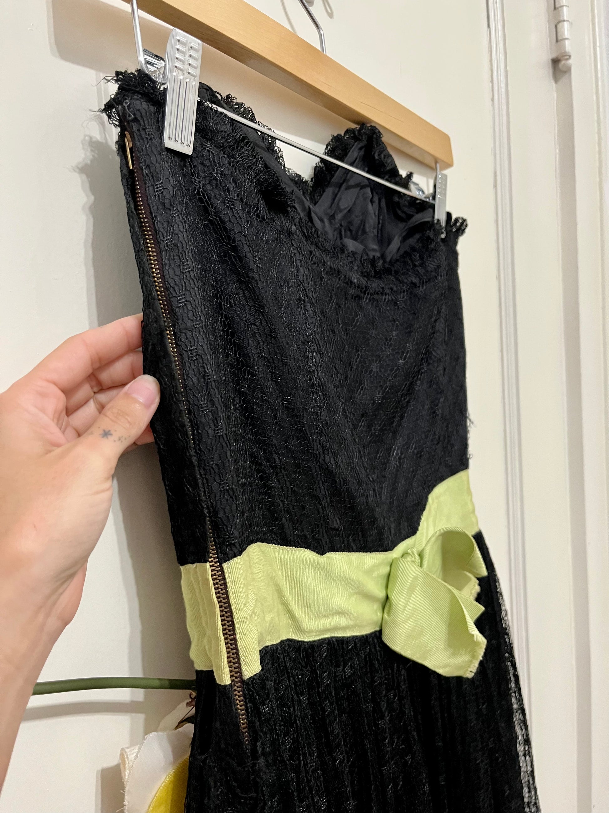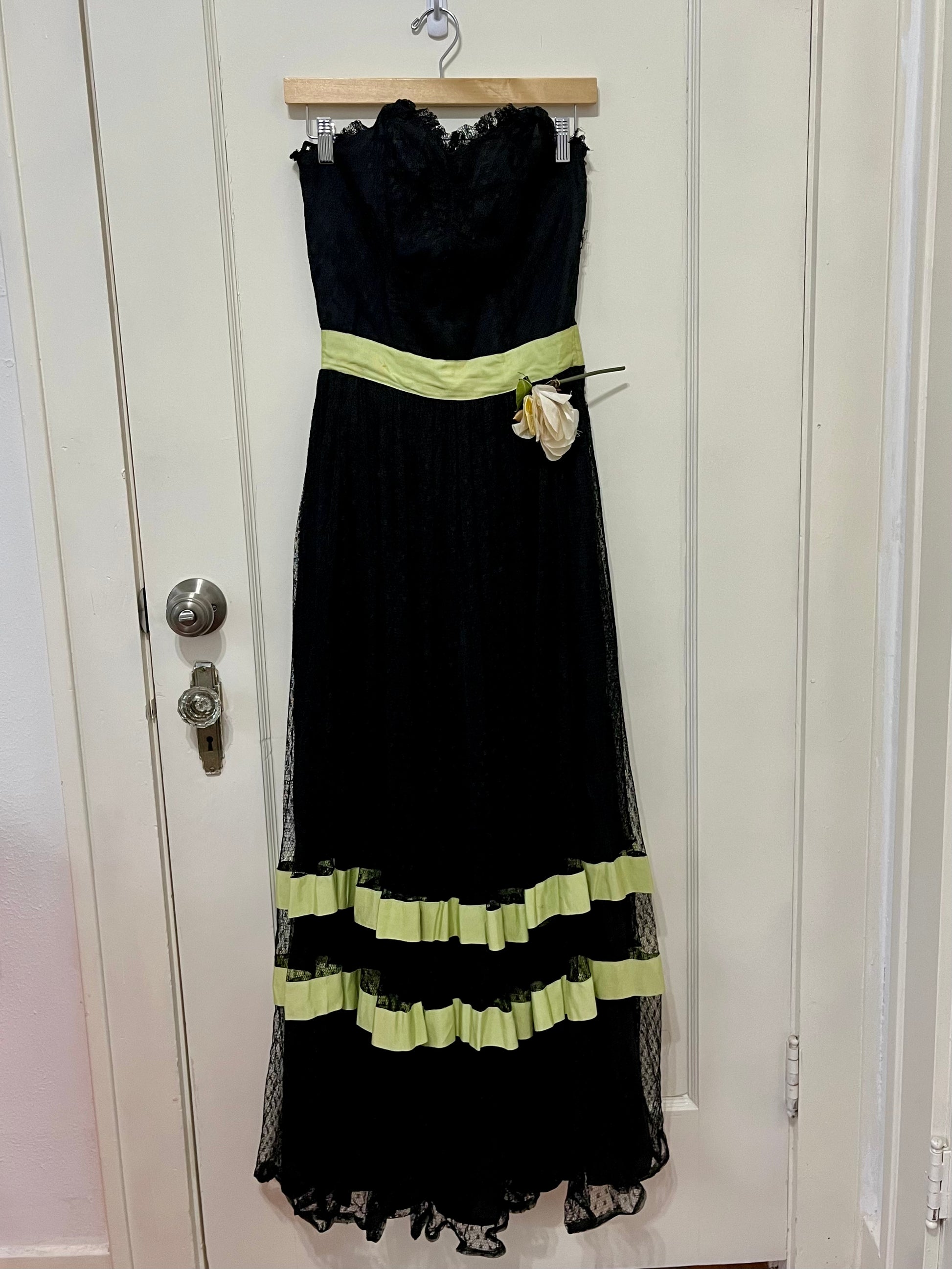 Vintage 50s black tulle gown with pale green contrast details and a faux flower pinned at the waist. Amazing strapless design with a layered skirt. Side zip closure. No tags. Best fits a S. Seen on Sammi.
