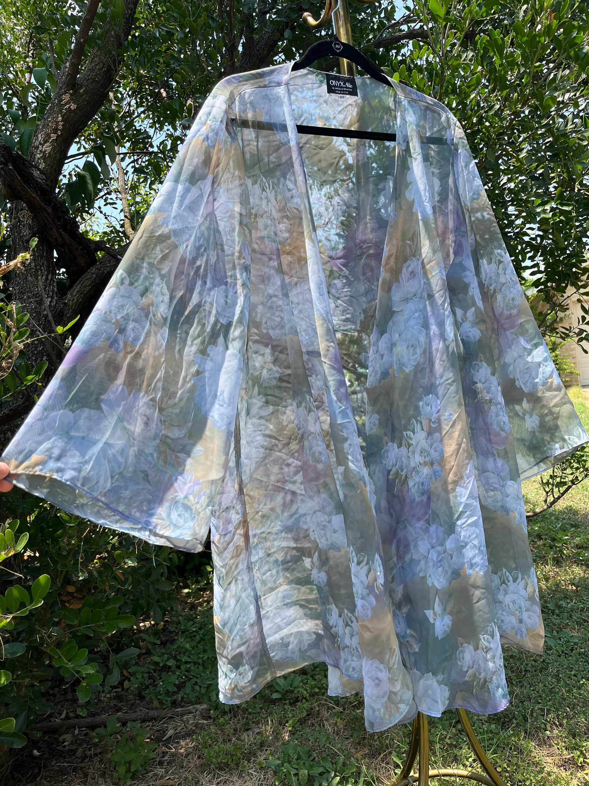 90s dreamy floral robe + black/ blue floral maxi skirt for maya