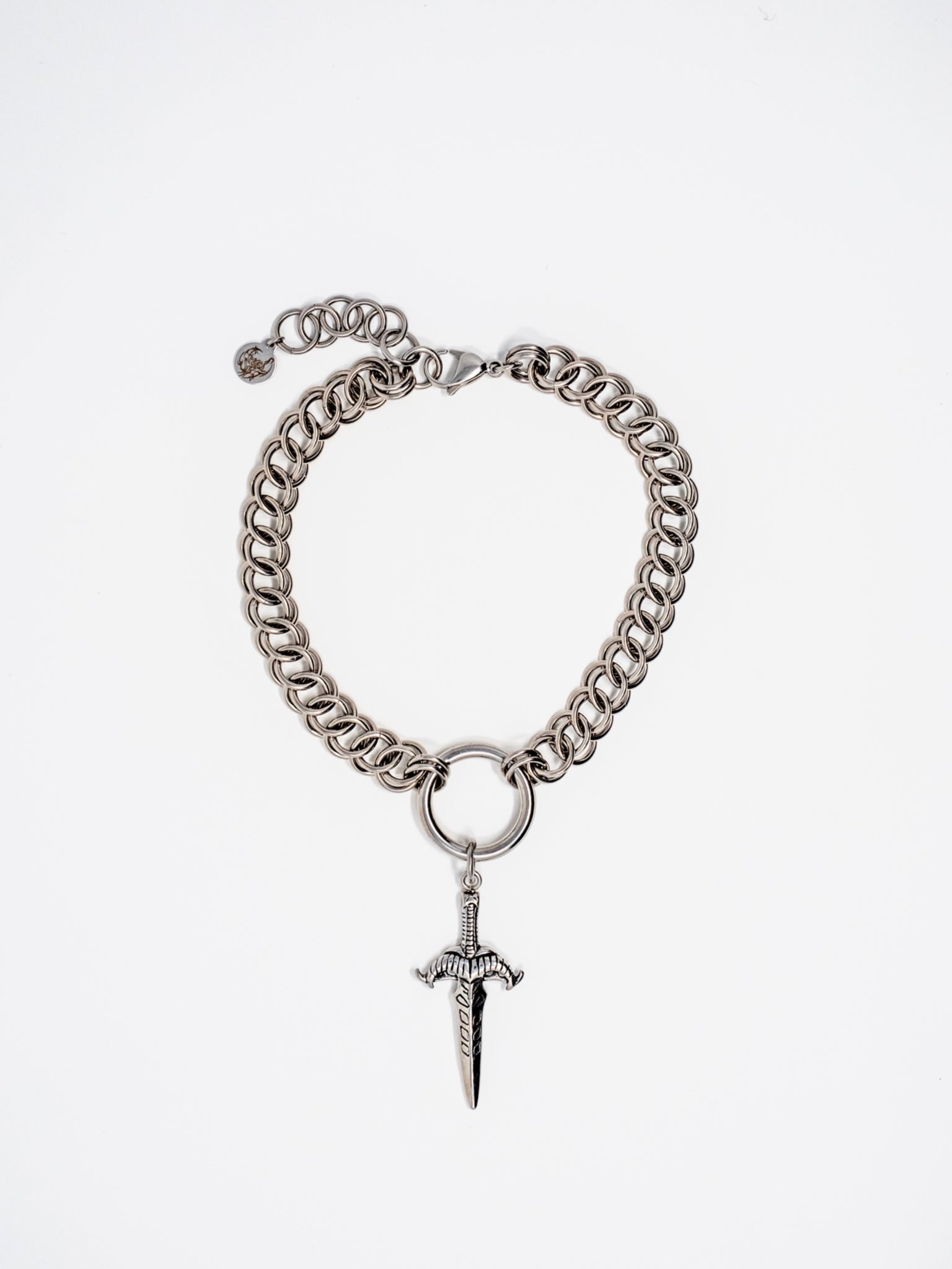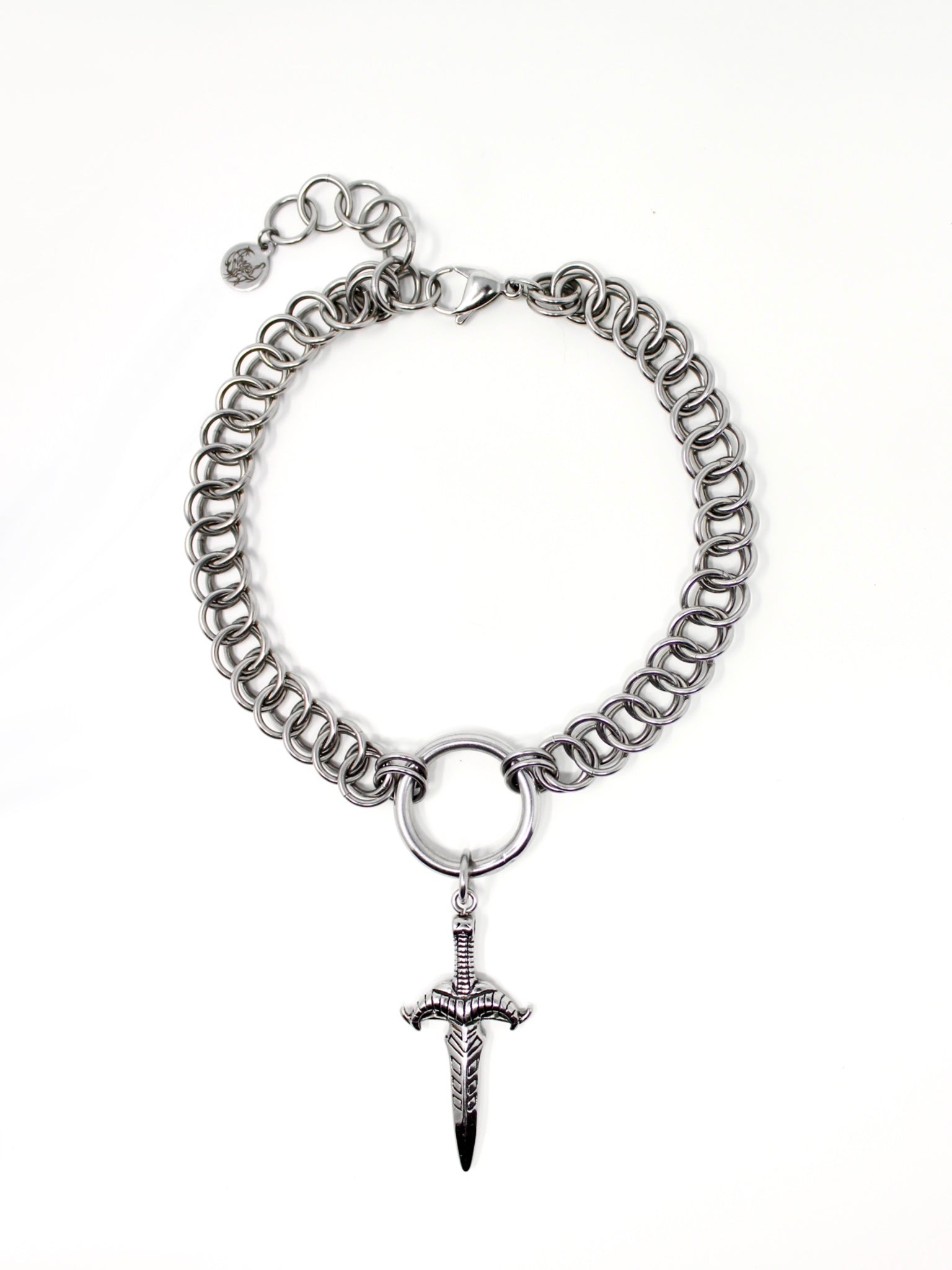 Persian weave chain with an O-Ring and dagger pendant. Inspired by the Kendra of Buffy, who was sent to Sunnydale to stop Acathla from sucking the world into a hell dimension. The dagger represents her sword which was blessed by the knight who first slew the demon