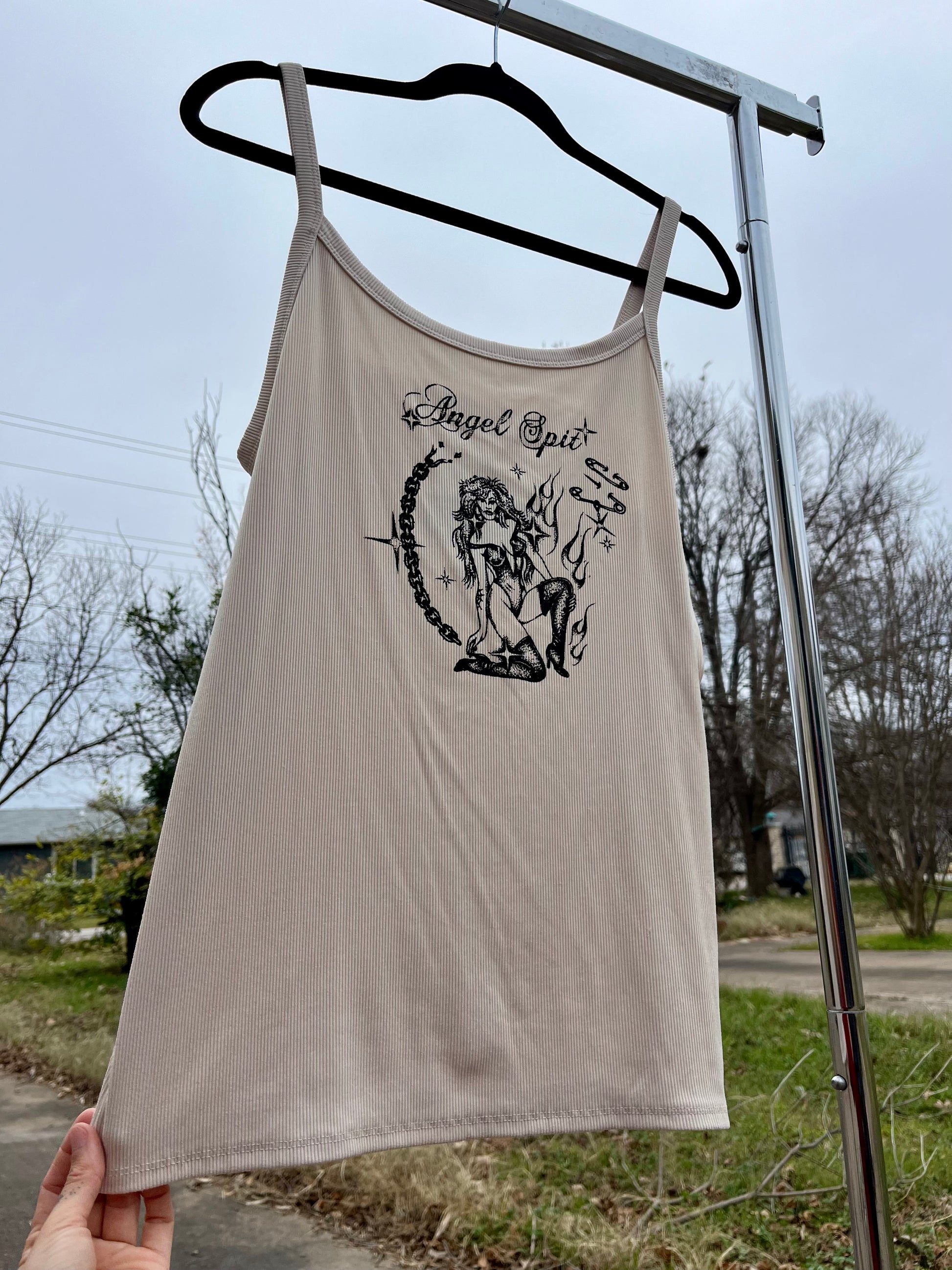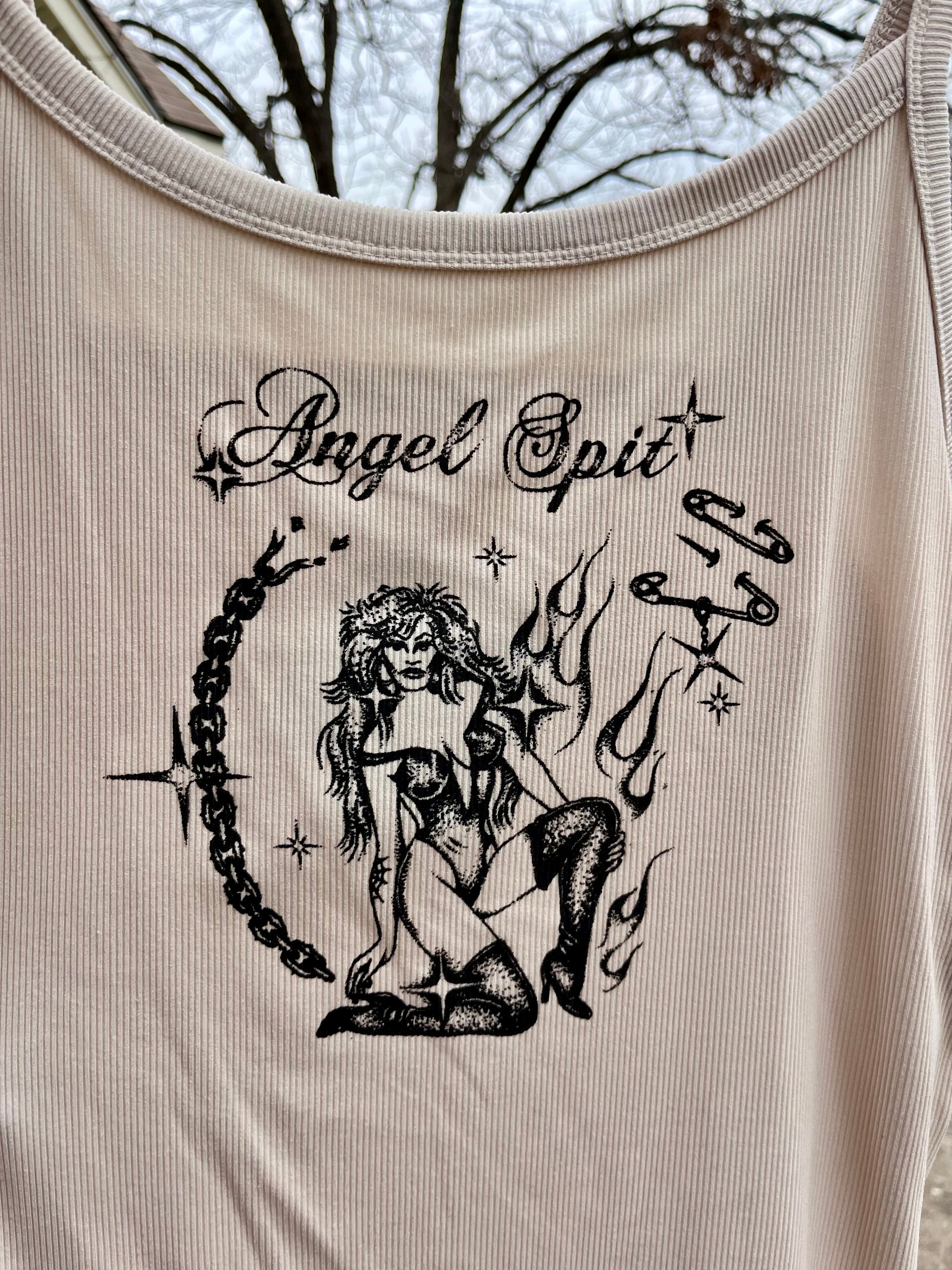 Angel Spit chain baddie locally screen printed on a thrifted tank. Size XL has stretch
