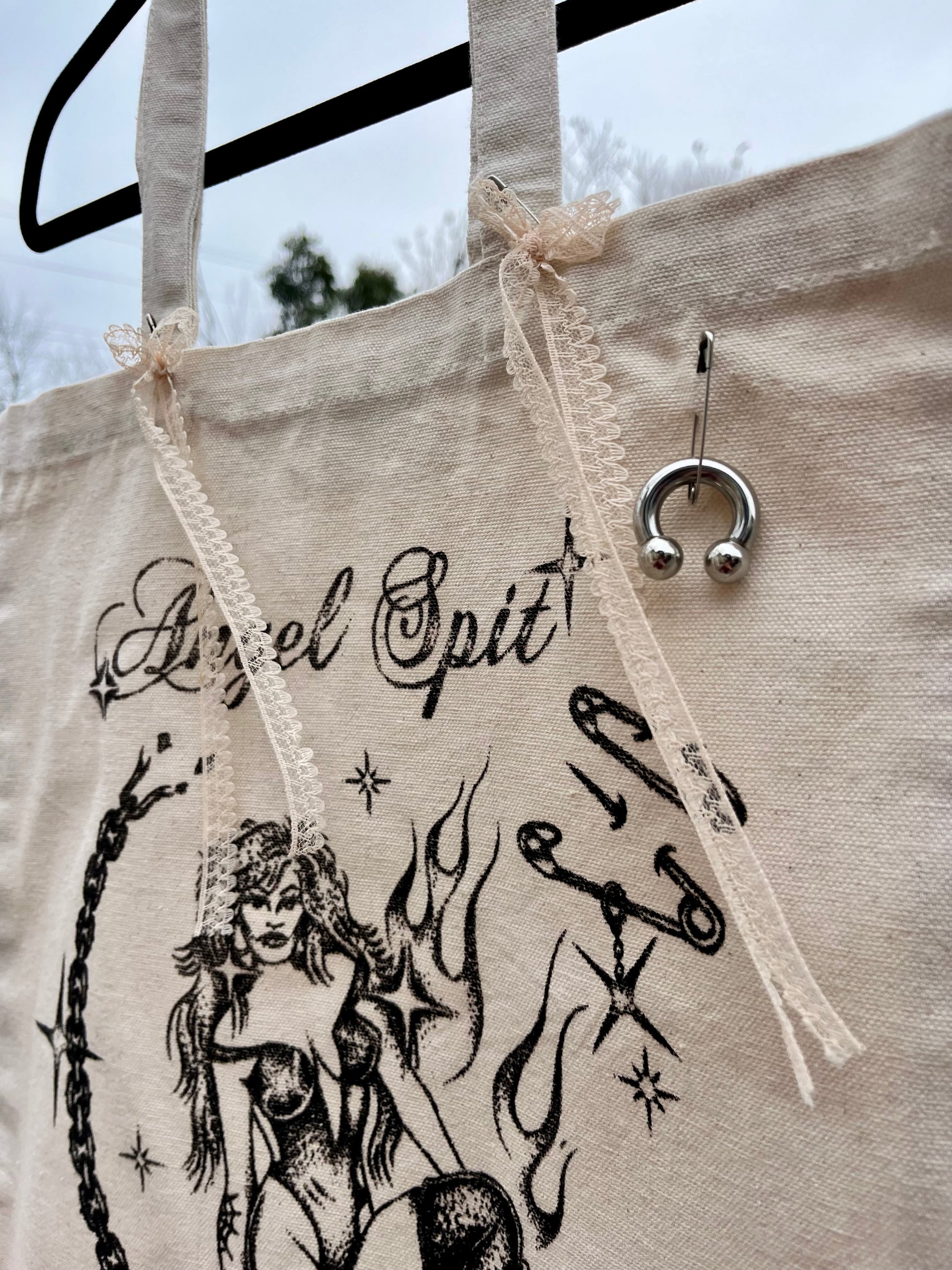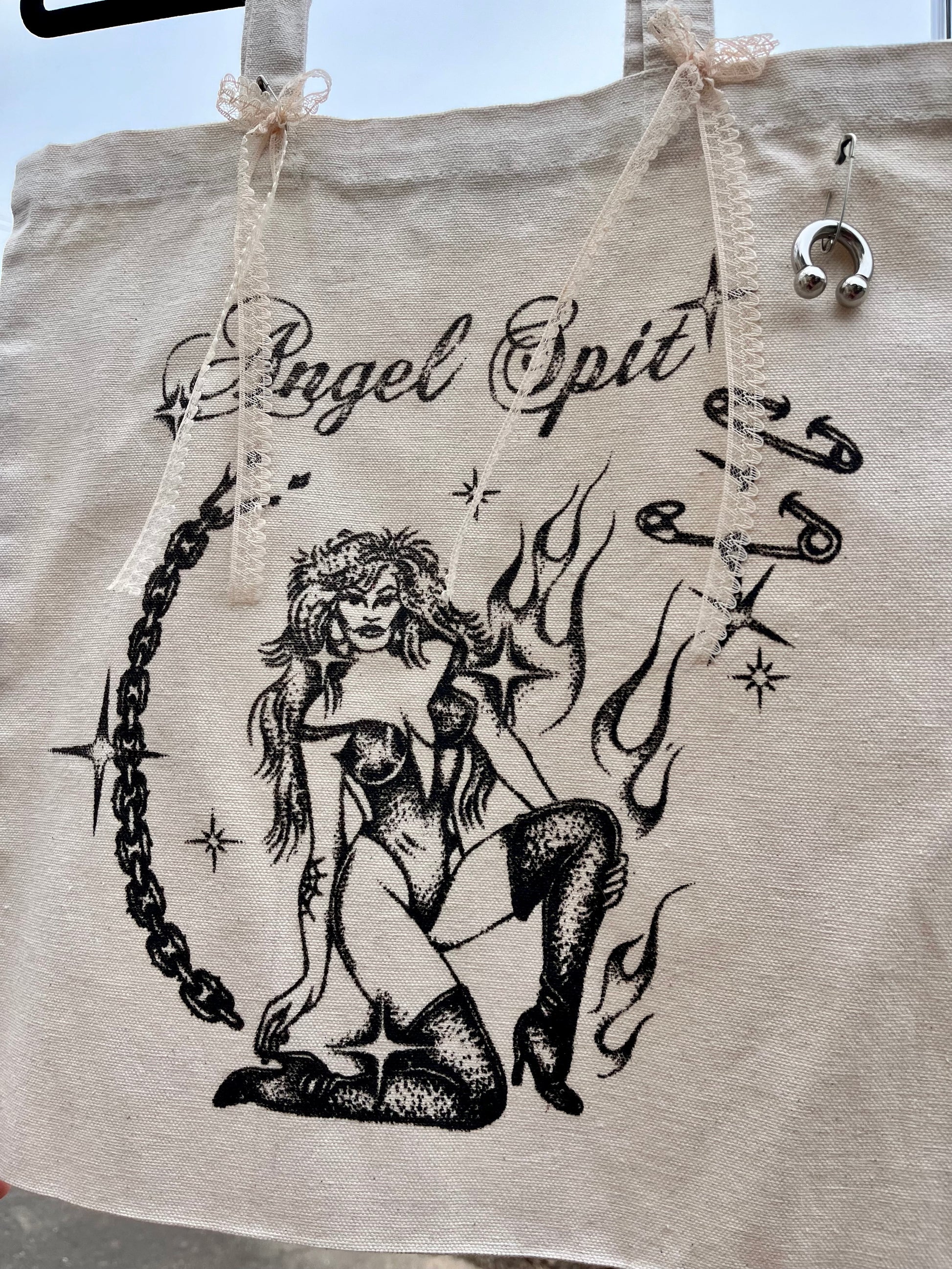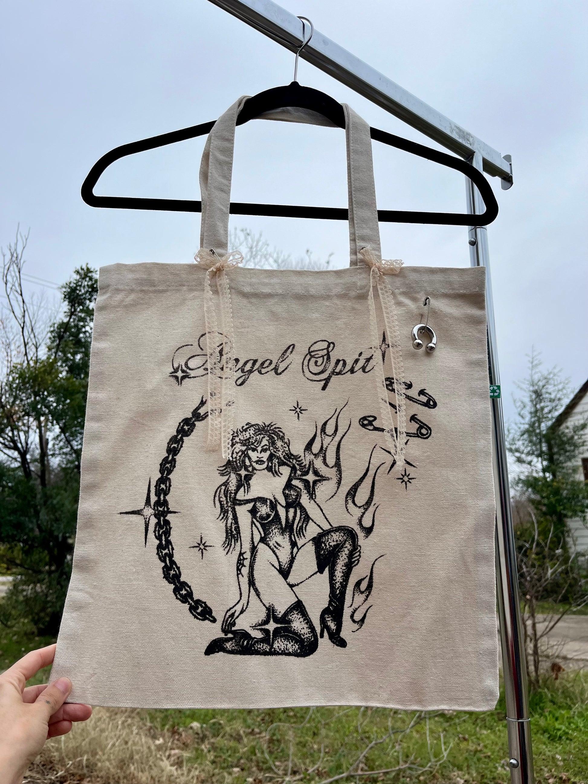 Angel Spit chain baddie tote-- 1/1 custom with lace bows and chunky piercing detail. Locally screenprinted on an eco-friendly canvas bag