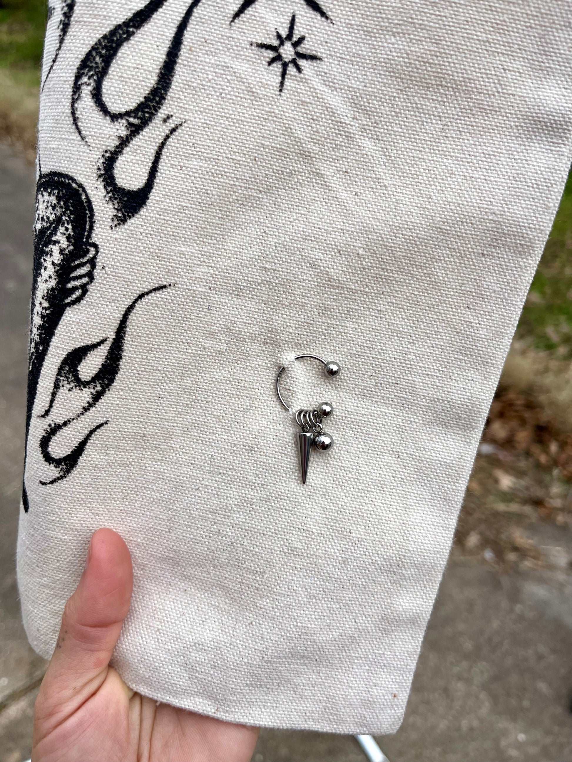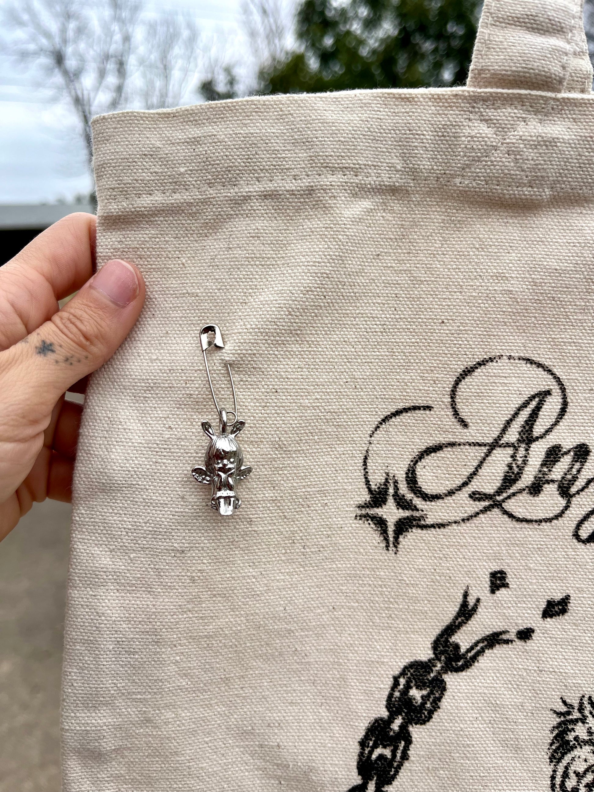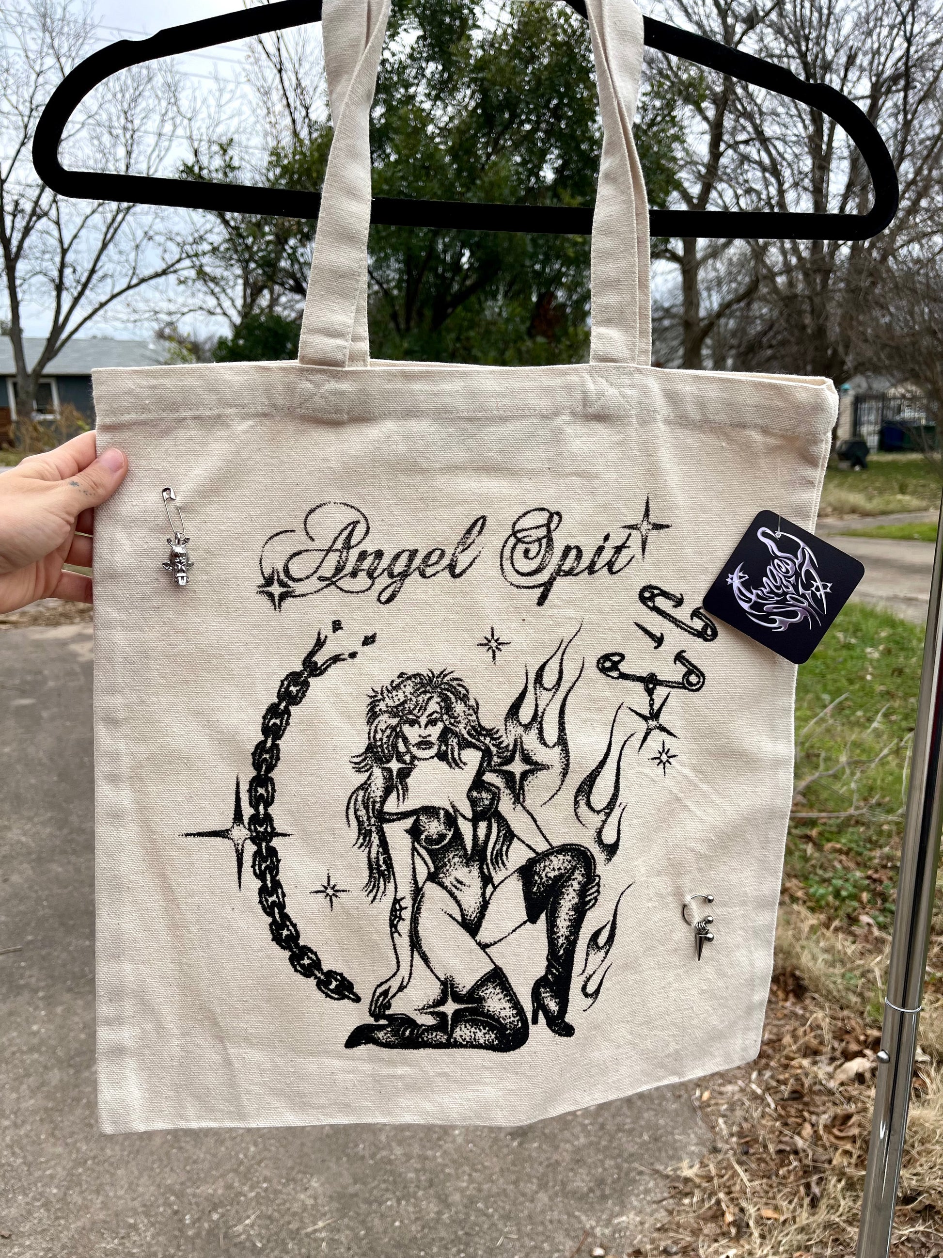Angel Spit chain baddie tote-- 1/1 custom with a steel fairy charm and piercing detail. Locally screenprinted on an eco-friendly canvas bag