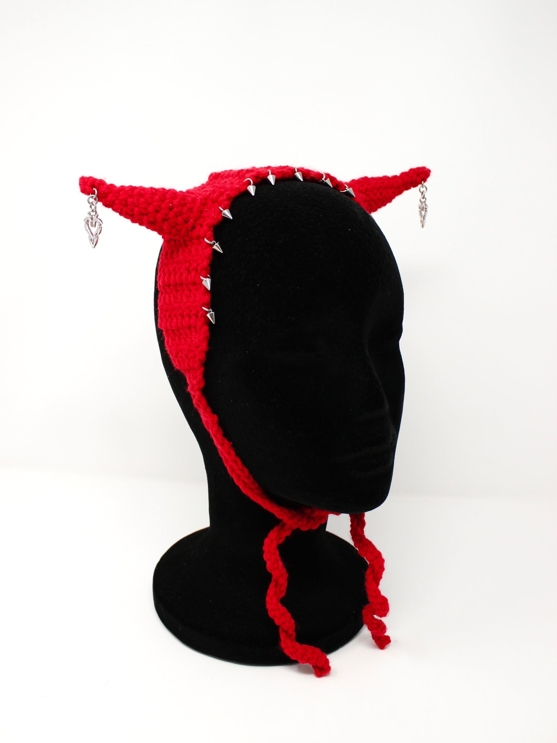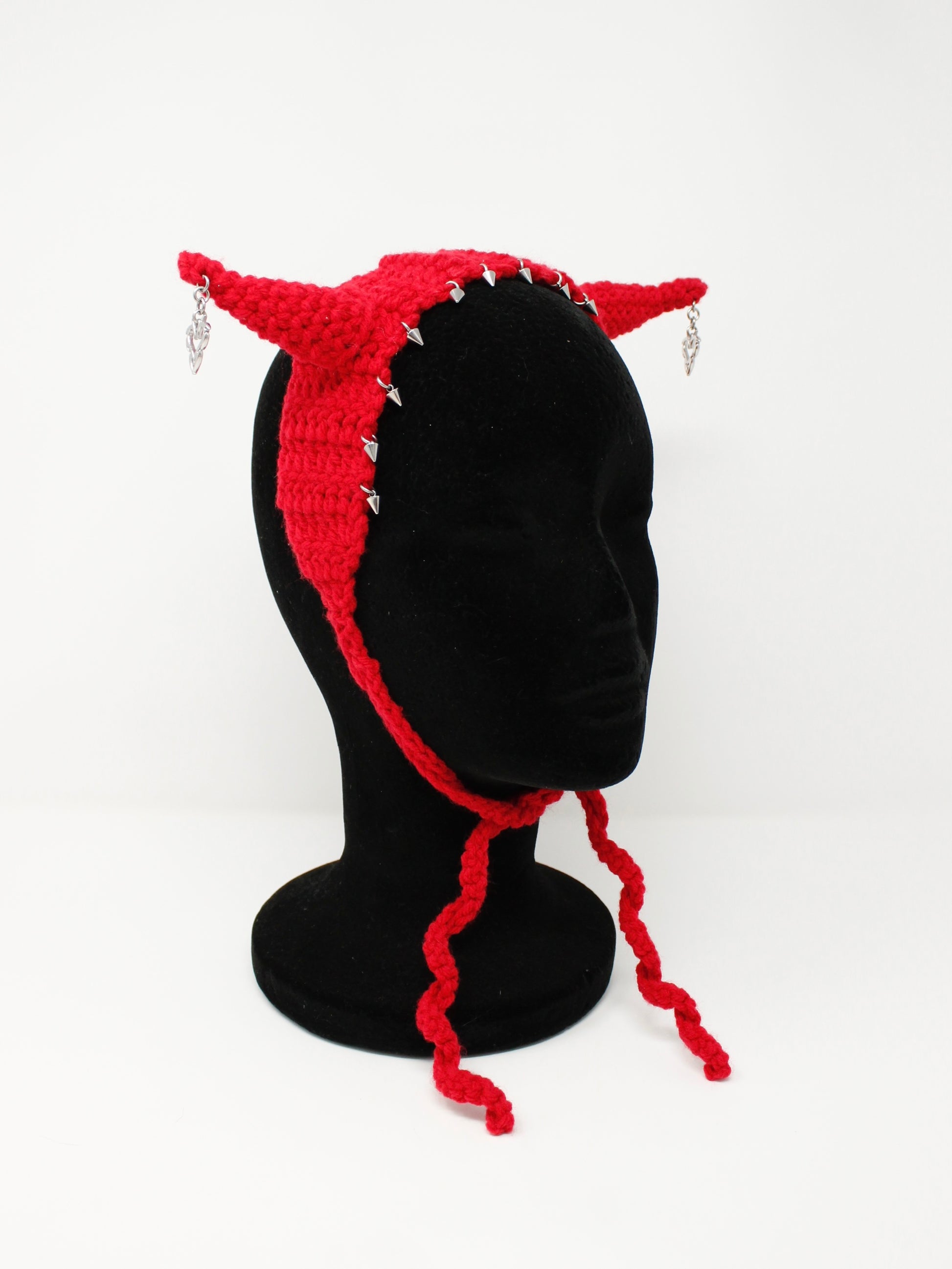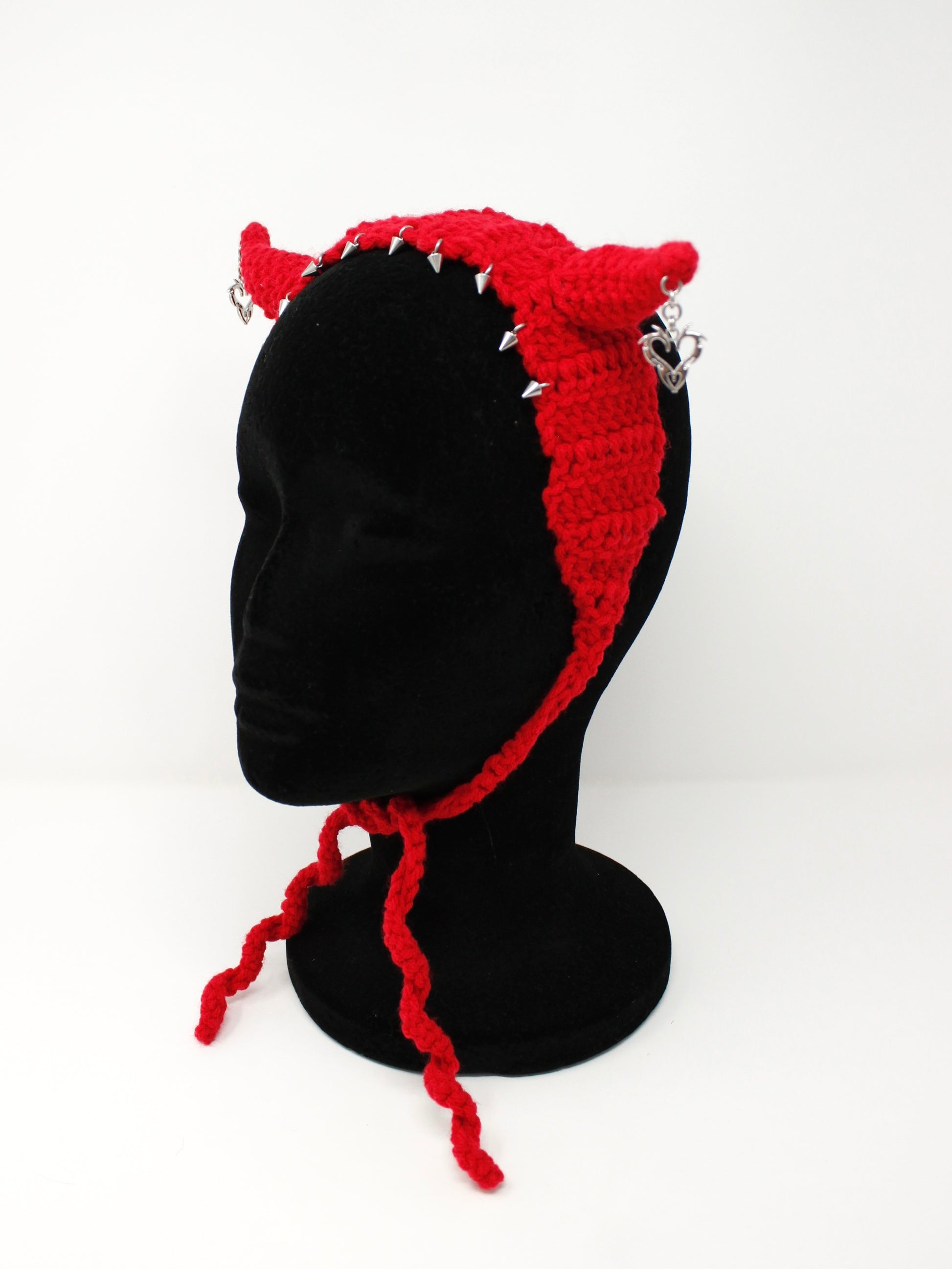 For the devilish lover, the cutest red devil horns made in collaboration with Hailstorm Crochet. Featuring flaming heart charmed horns and baby spikes framing the face