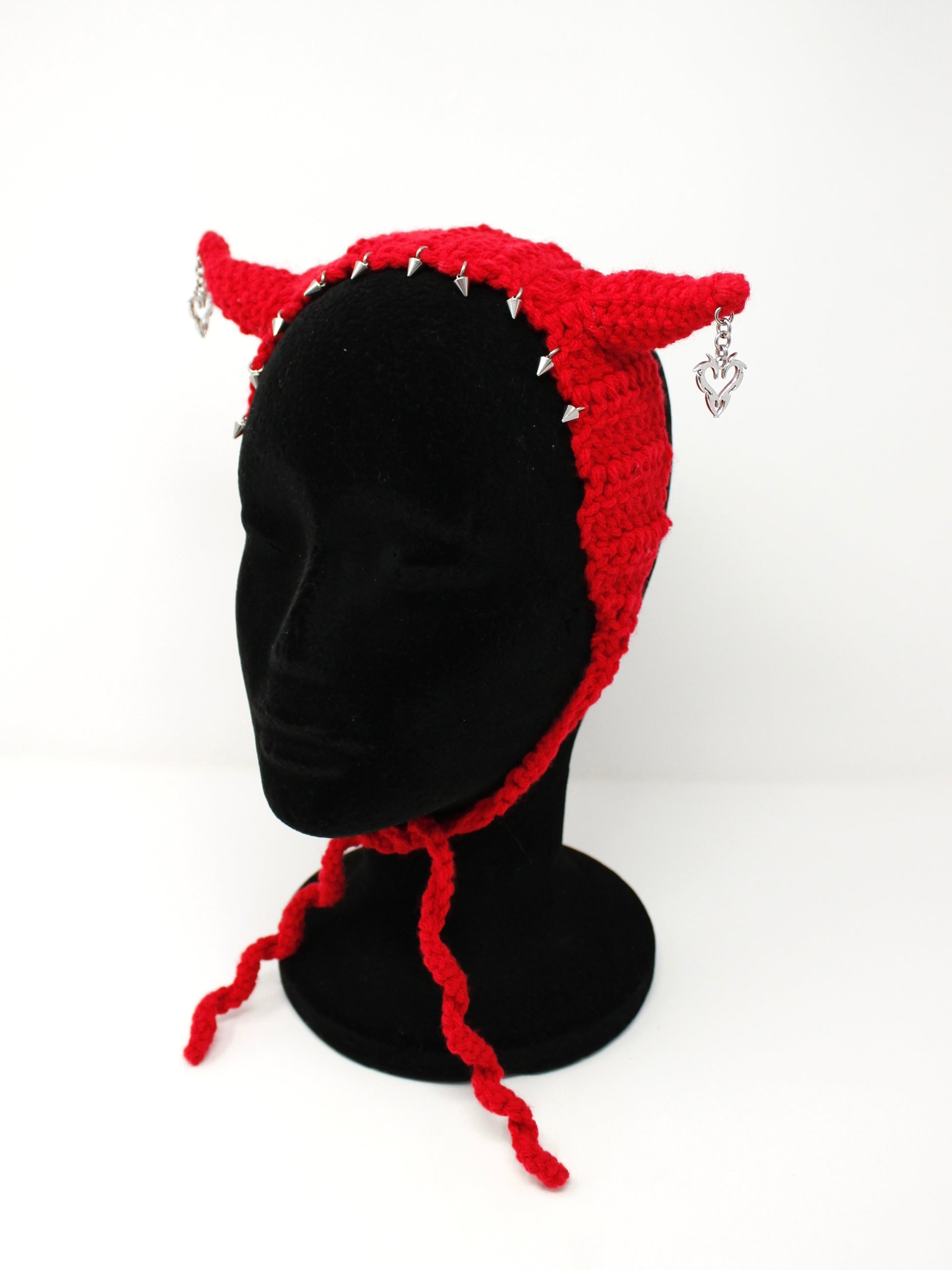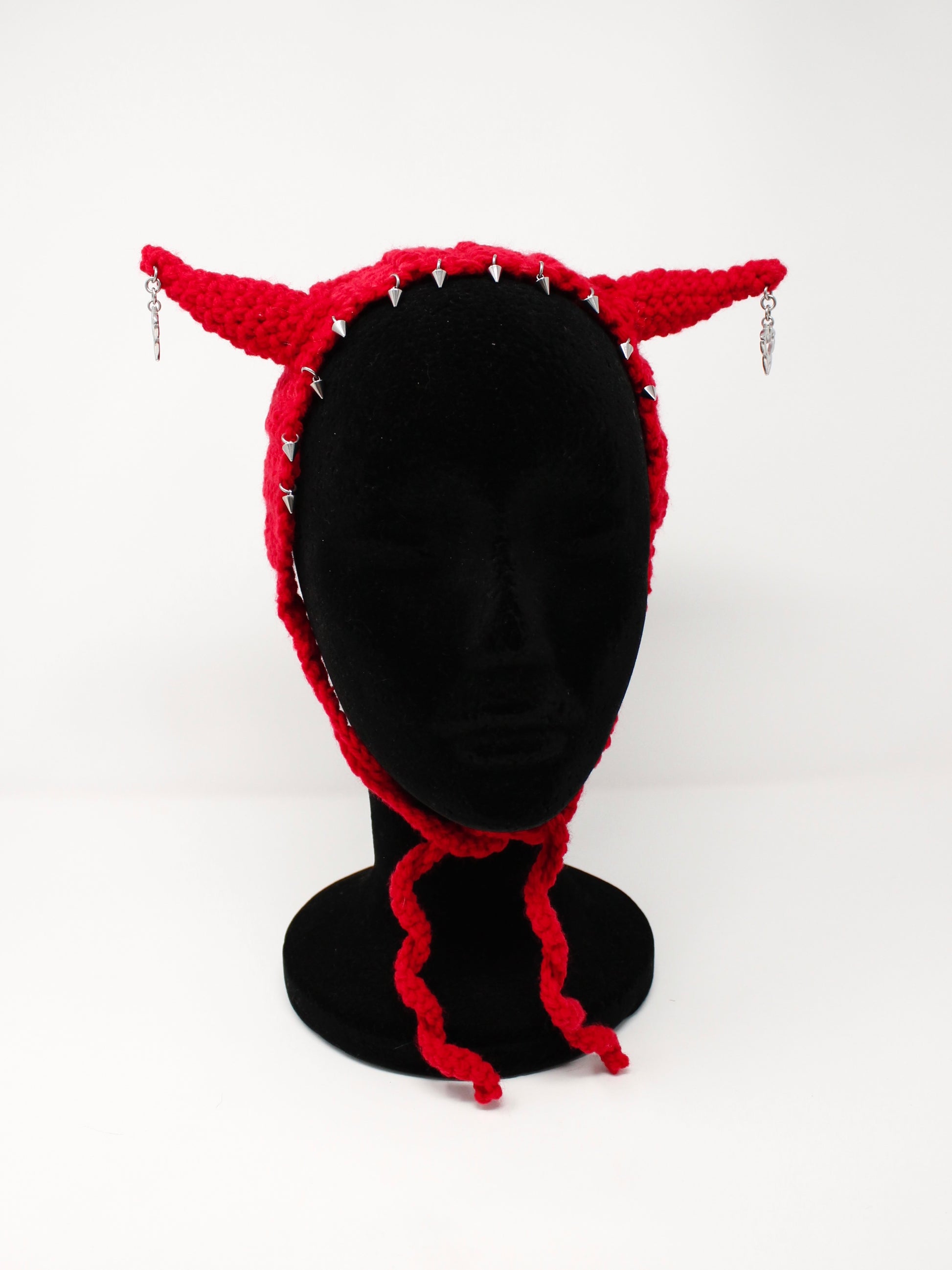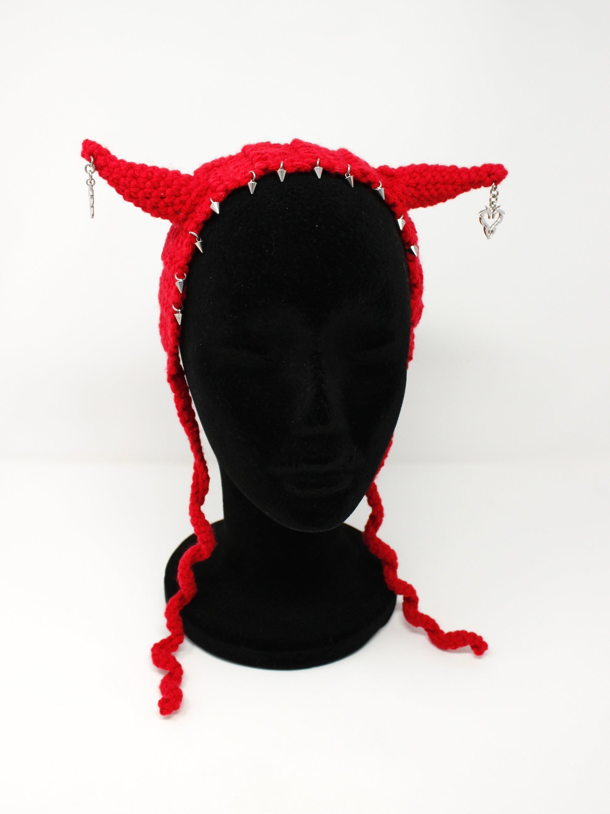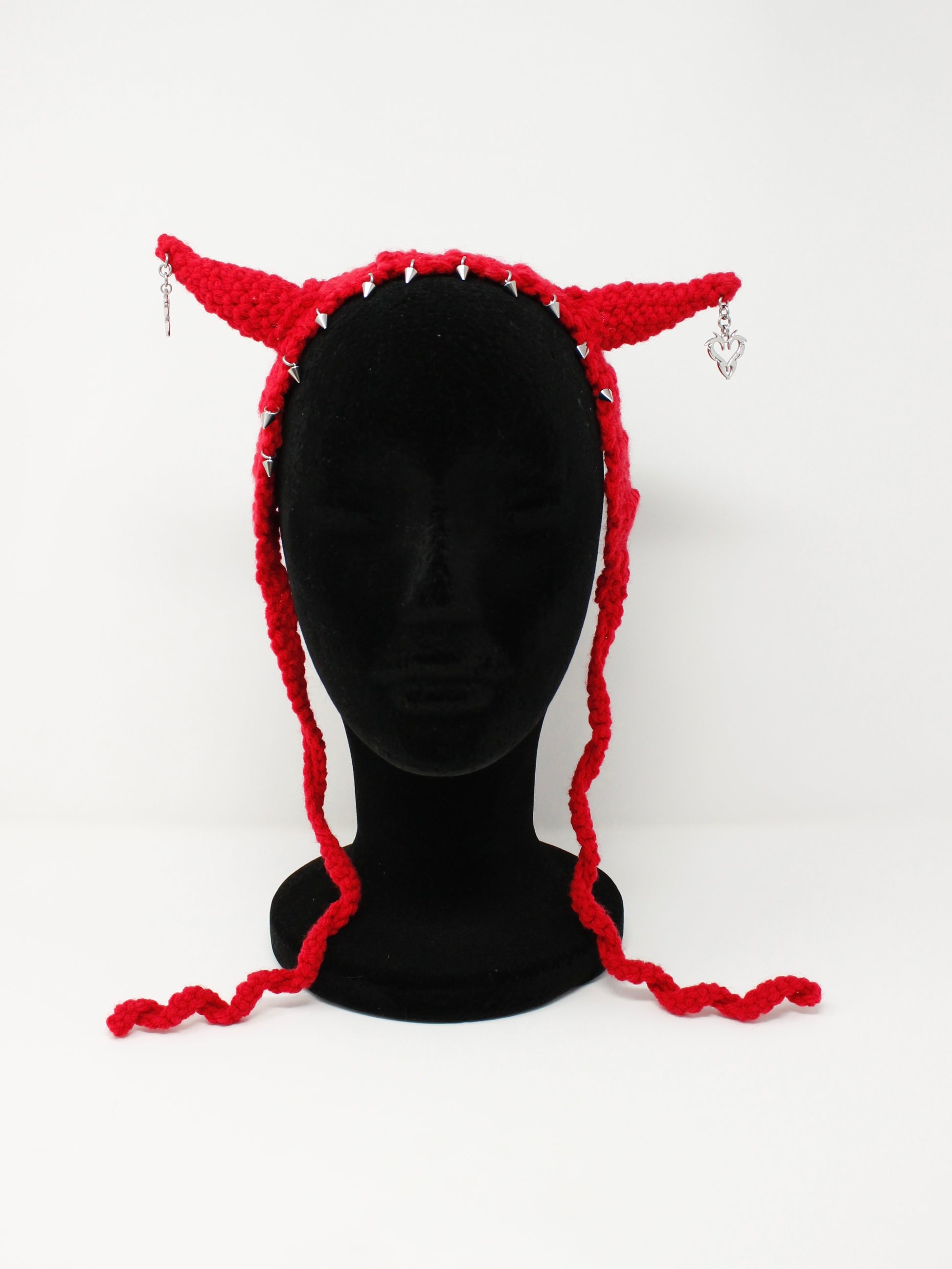 For the devilish lover, the cutest red devil horns made in collaboration with Hailstorm Crochet. Featuring flaming heart charmed horns and baby spikes framing the face