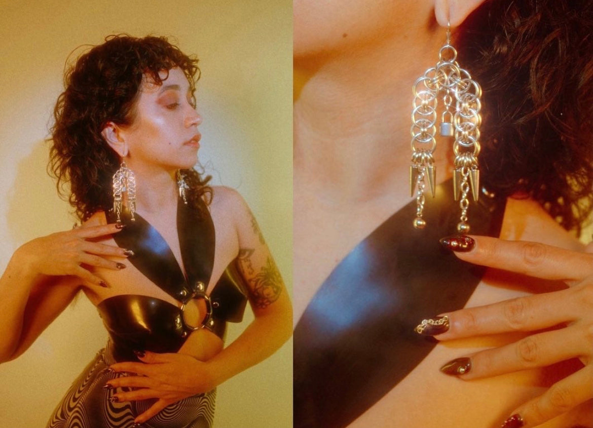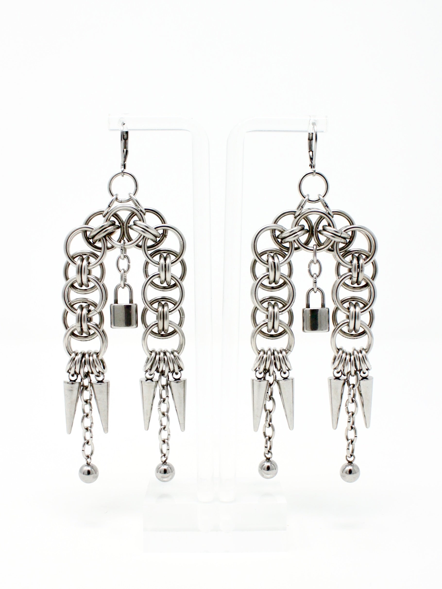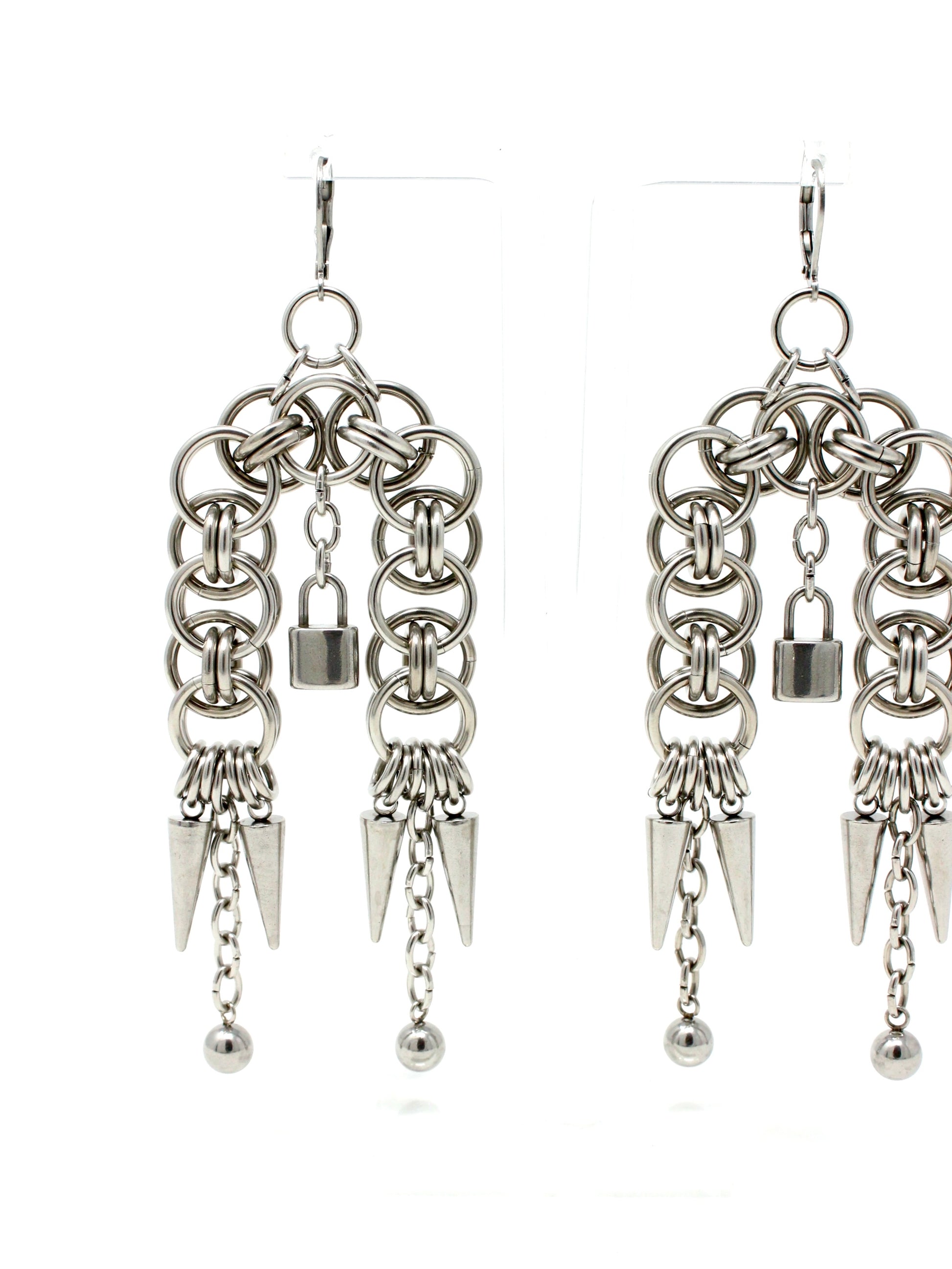 Dreamy archway helm weave earrings with lock, spike, and ball accents