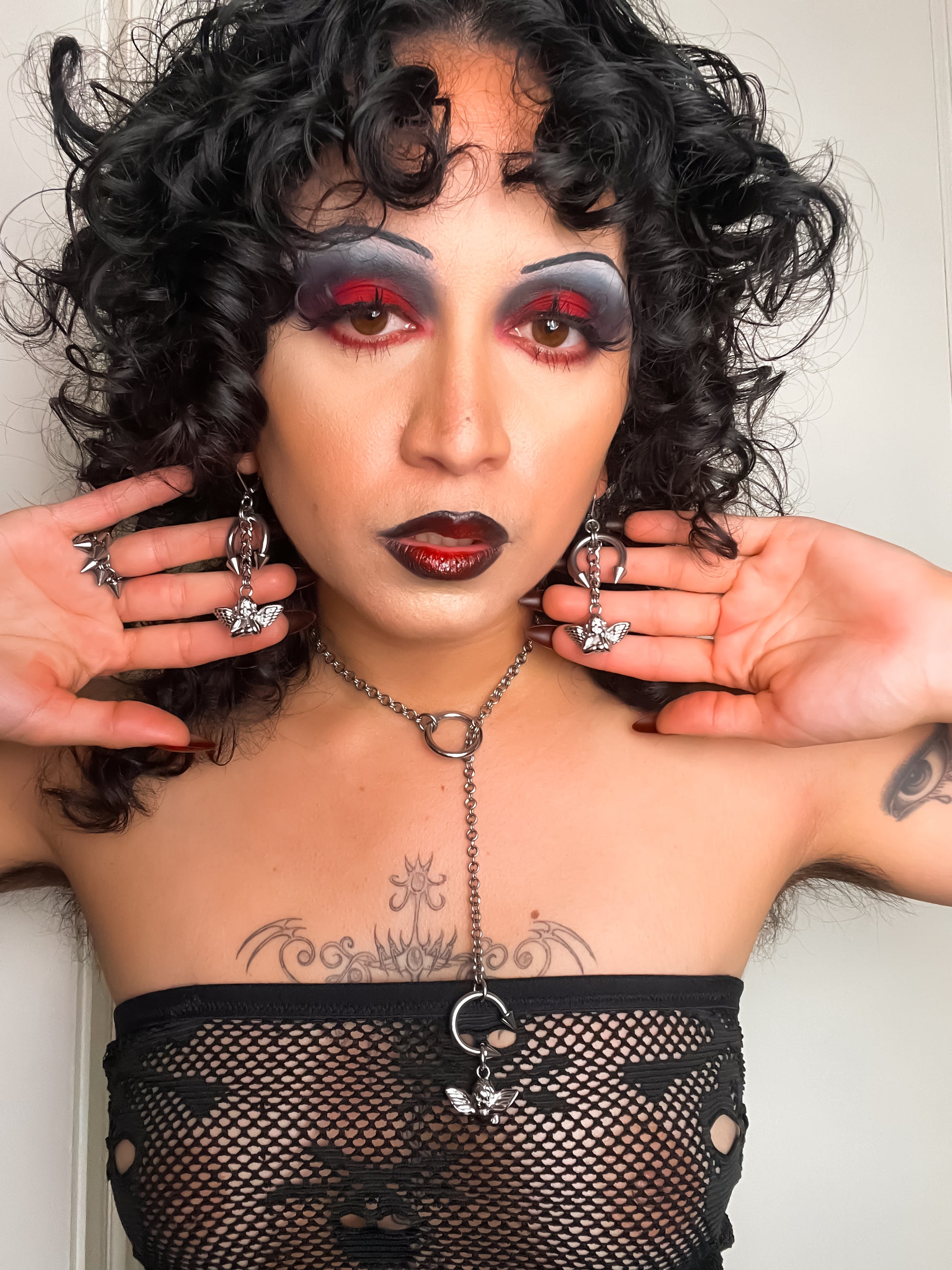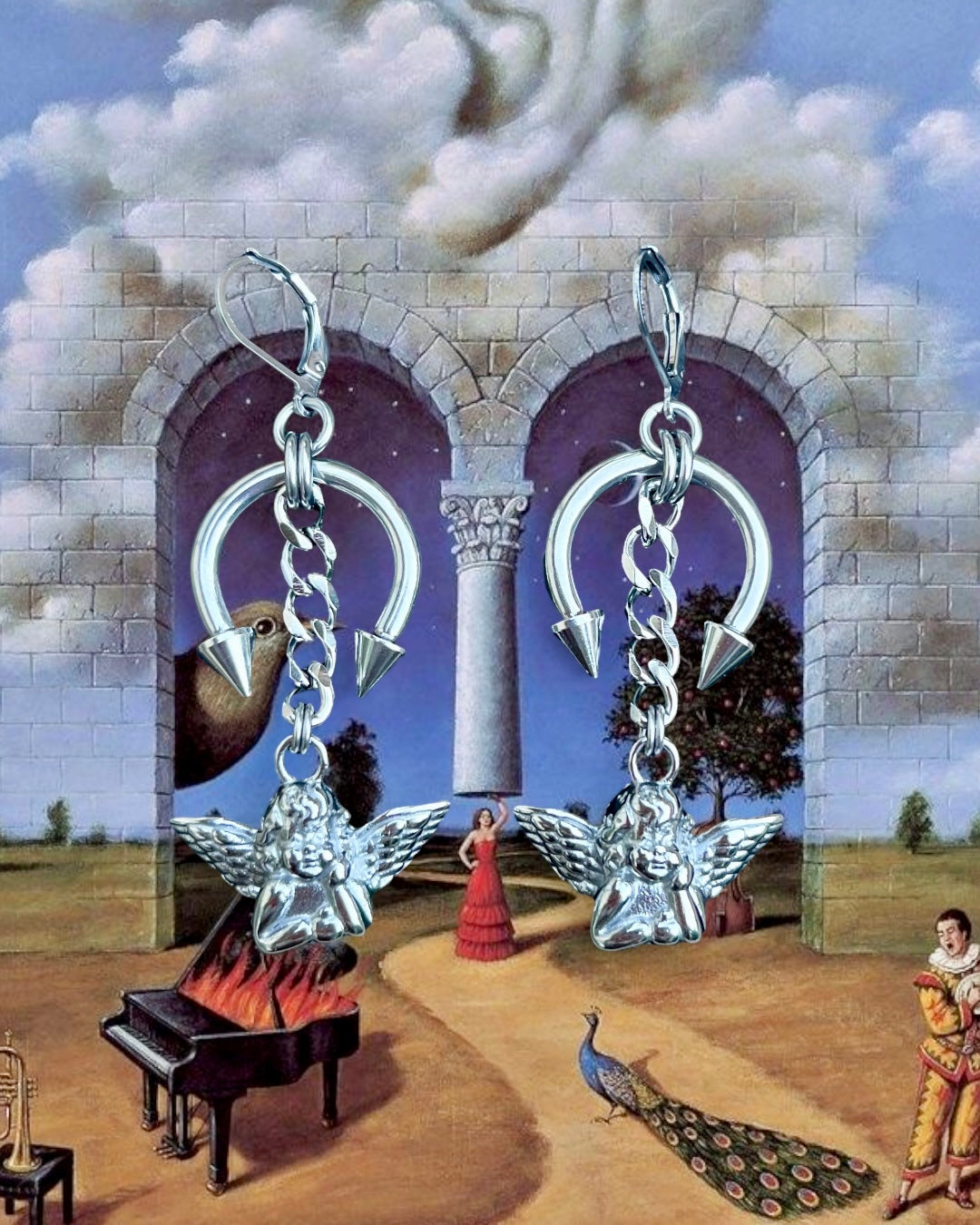 Chunky spiked barbell earrings with cherub pendants suspended from steel curb chain