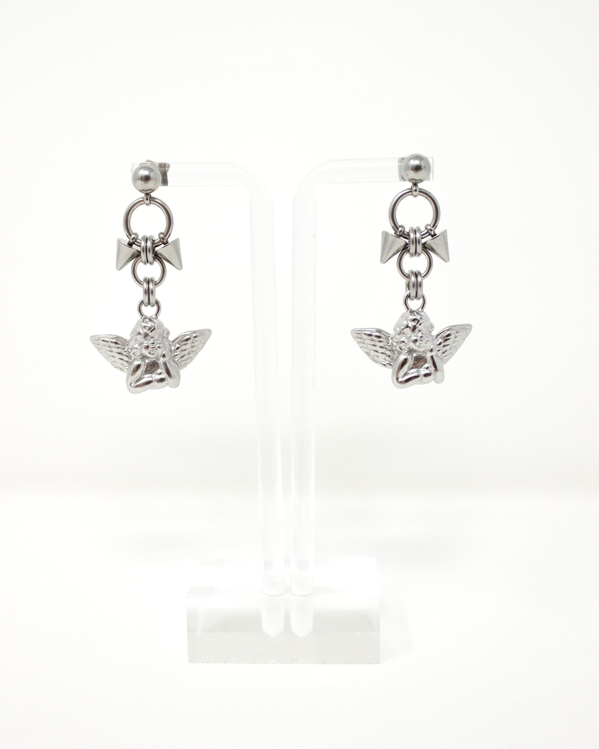 Steel stud earrings with baby spike accents and 3D winged cherub charms
