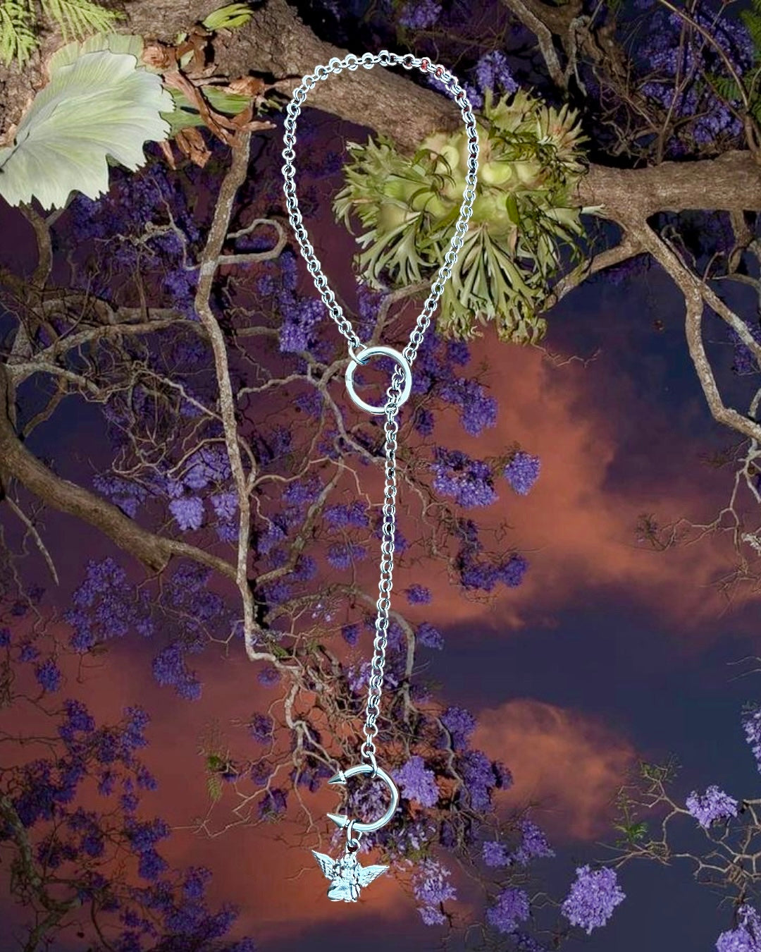 Dainty choke chain with a bold spike barbell and cherub pendant accent. Weave the barbell piece through the mini O-ring and style to your desired tightness/ length