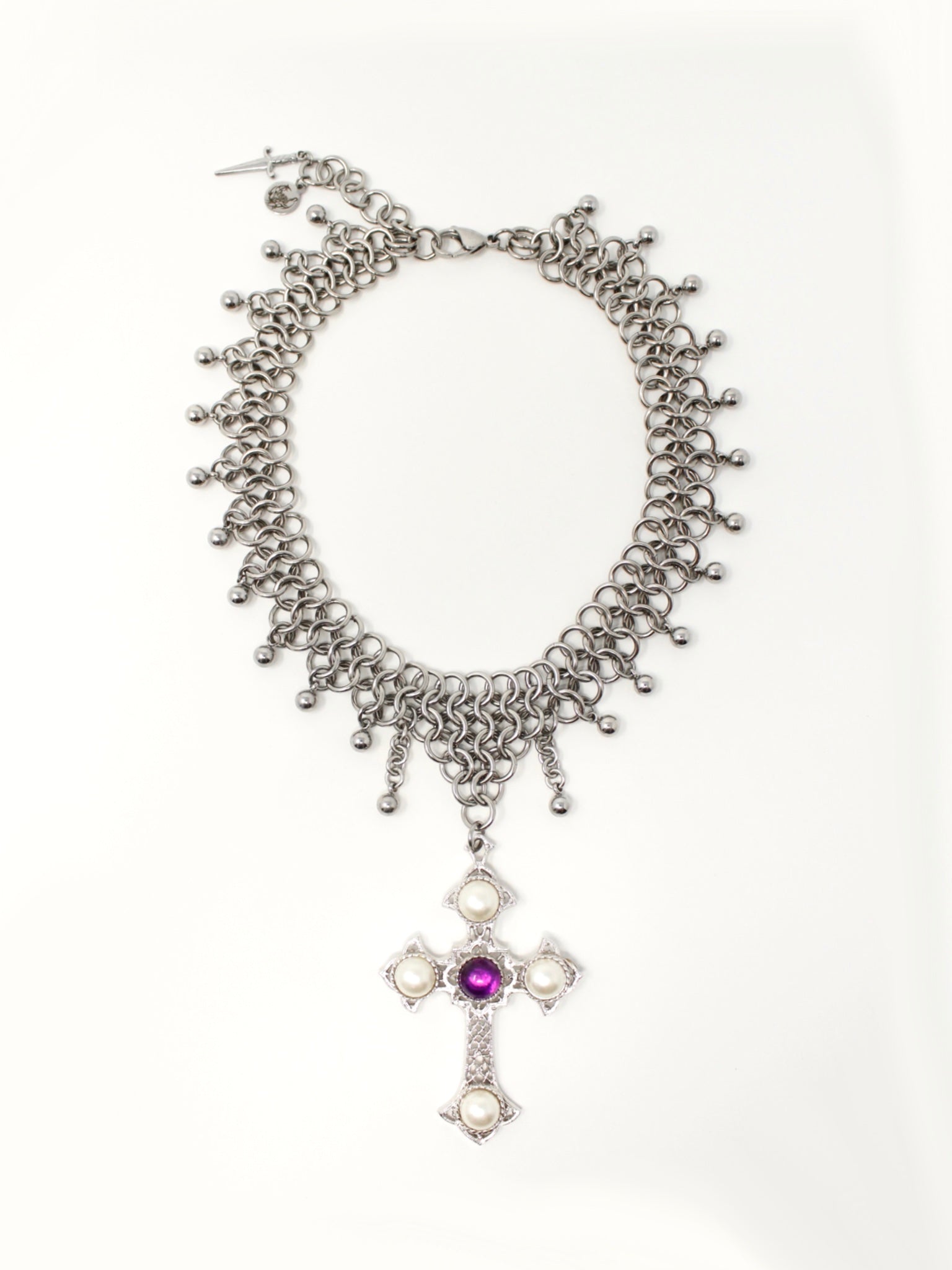 Beautiful european weave choker with a pointed center that leads into a 70s faux pearl + gemstone cross pendant. Features cascading steel drops. Inspired by Dawn Summers of Buffy