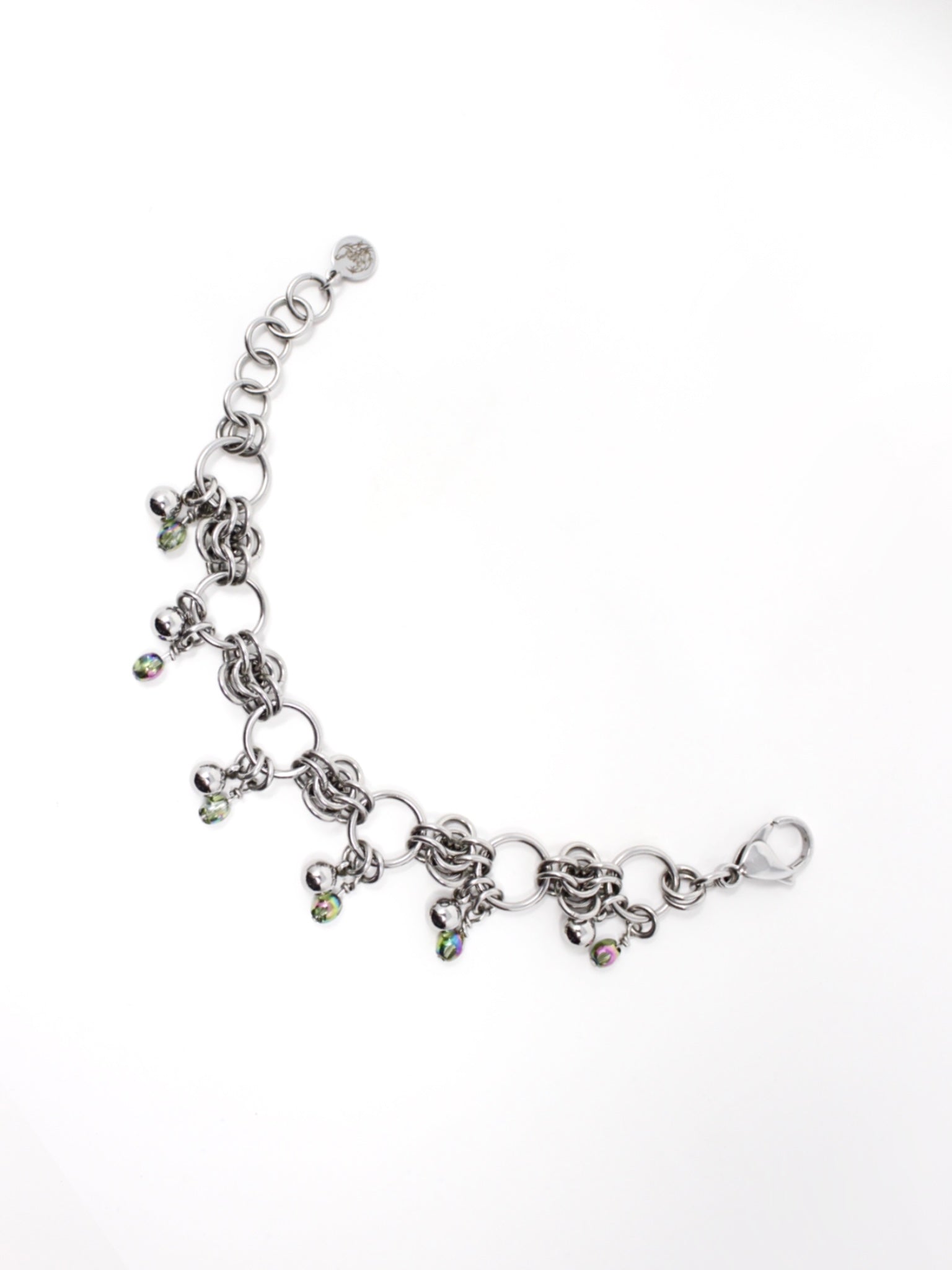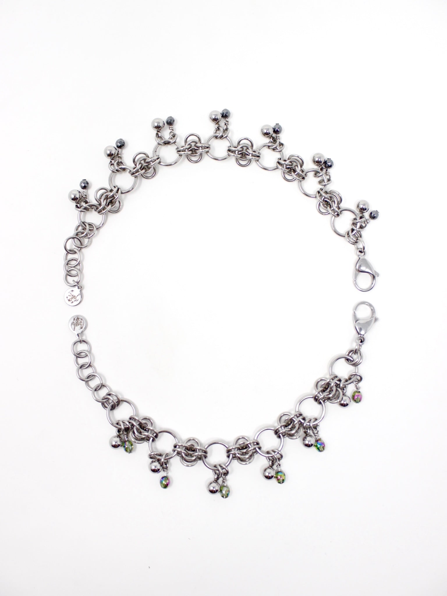 - stainless steel + crystal peridot or faceted hematite glass beads