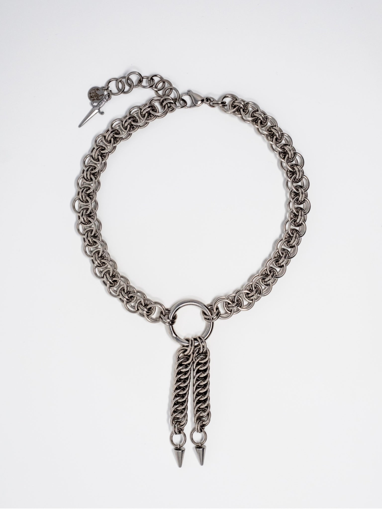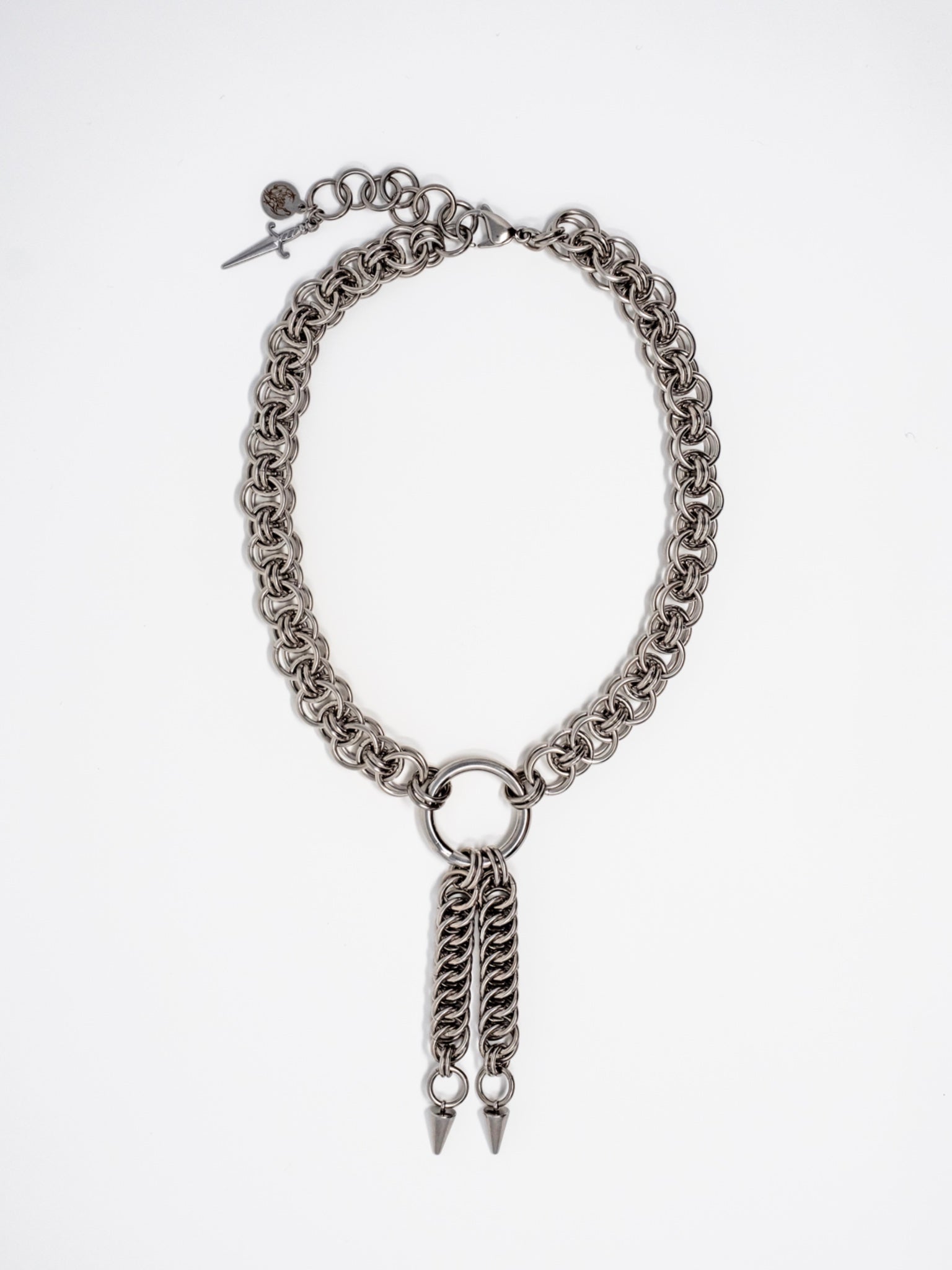 A western inspired chain featuring an O-Ring and two spike adorned persian tips. This versatile piece can be styled in many ways-- our favorites are with a dress, tee, or collared shirt