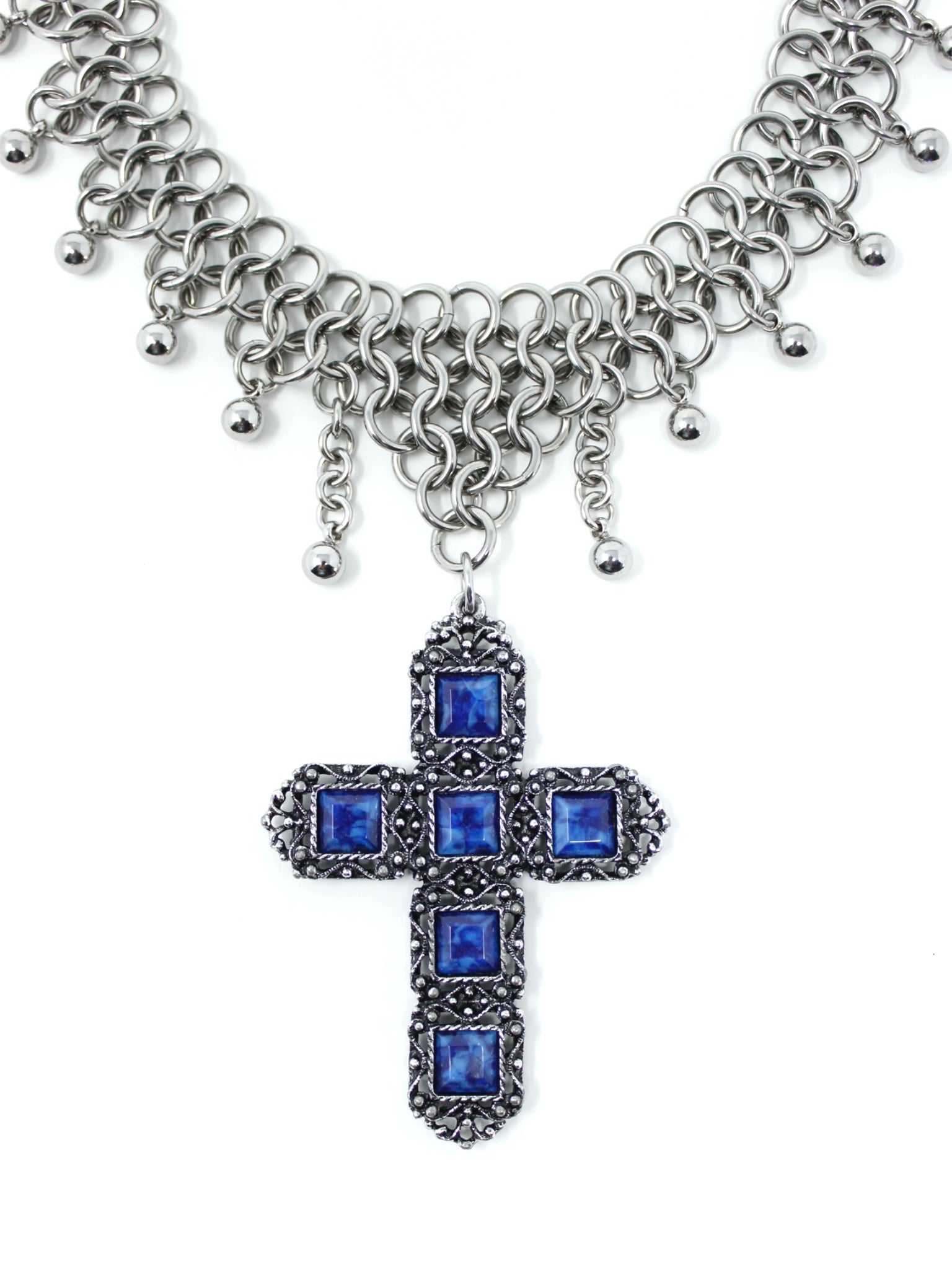 The dark sister design to our Dawn Choker, featuring a european weave with cascading steel drops and a 70s vintage reversible blue gemstone/ silver cross pendant.