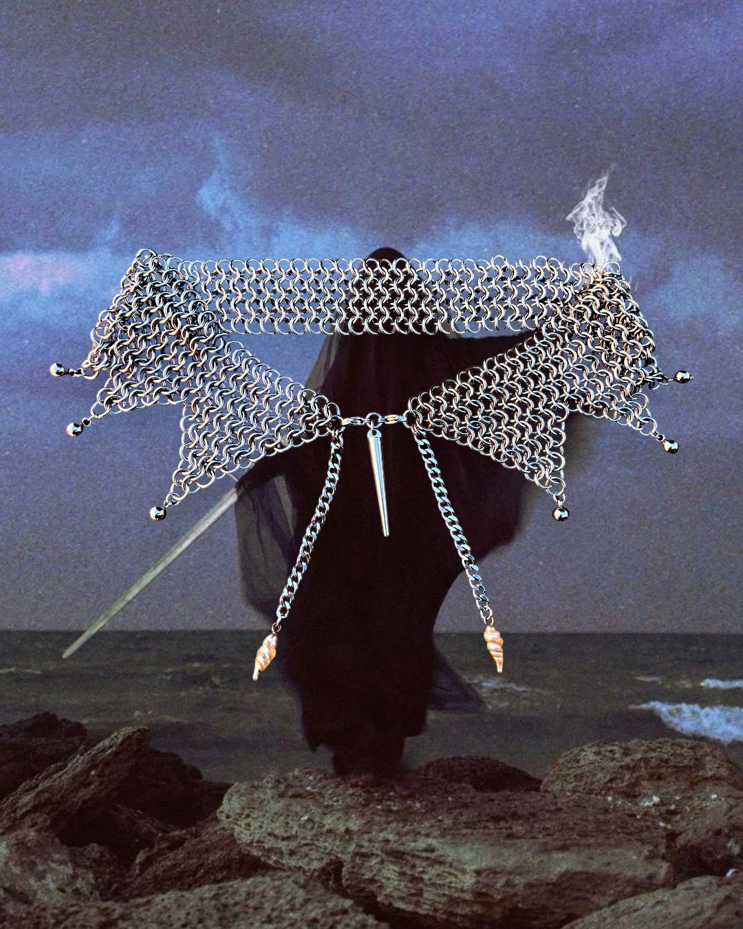European weave chain collar with steel drop adorned points. Features a unique front-clasping centerpiece, dainty curb chain and 1940s pearlized glass beads.