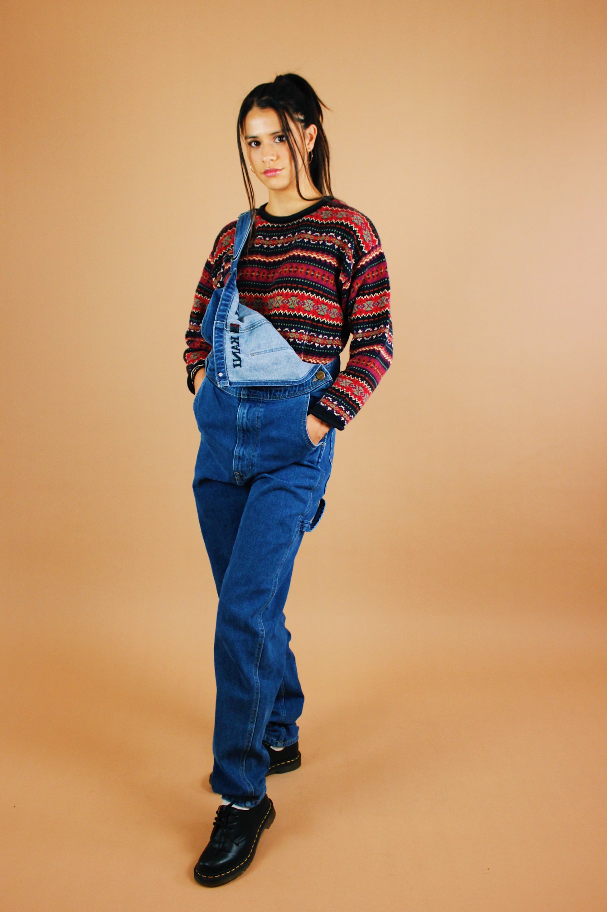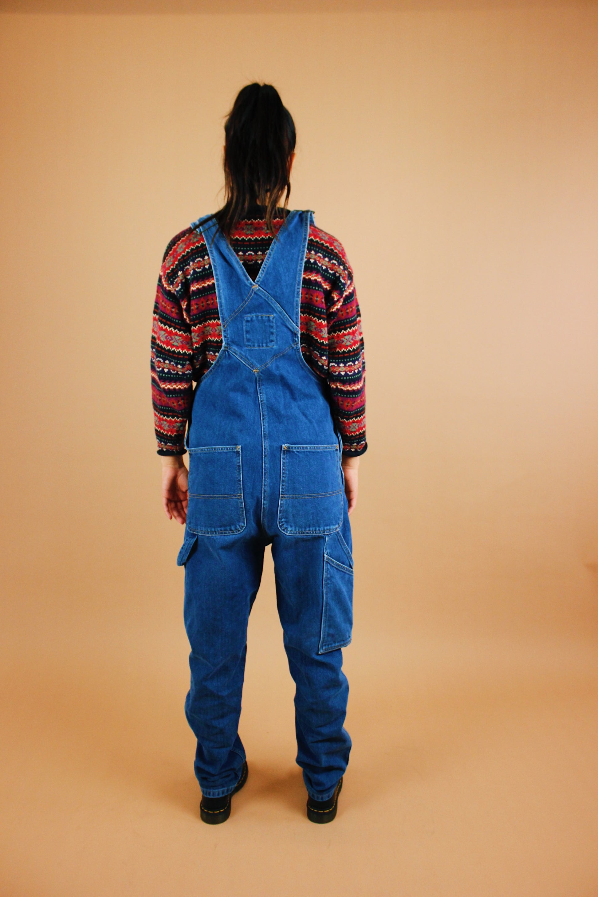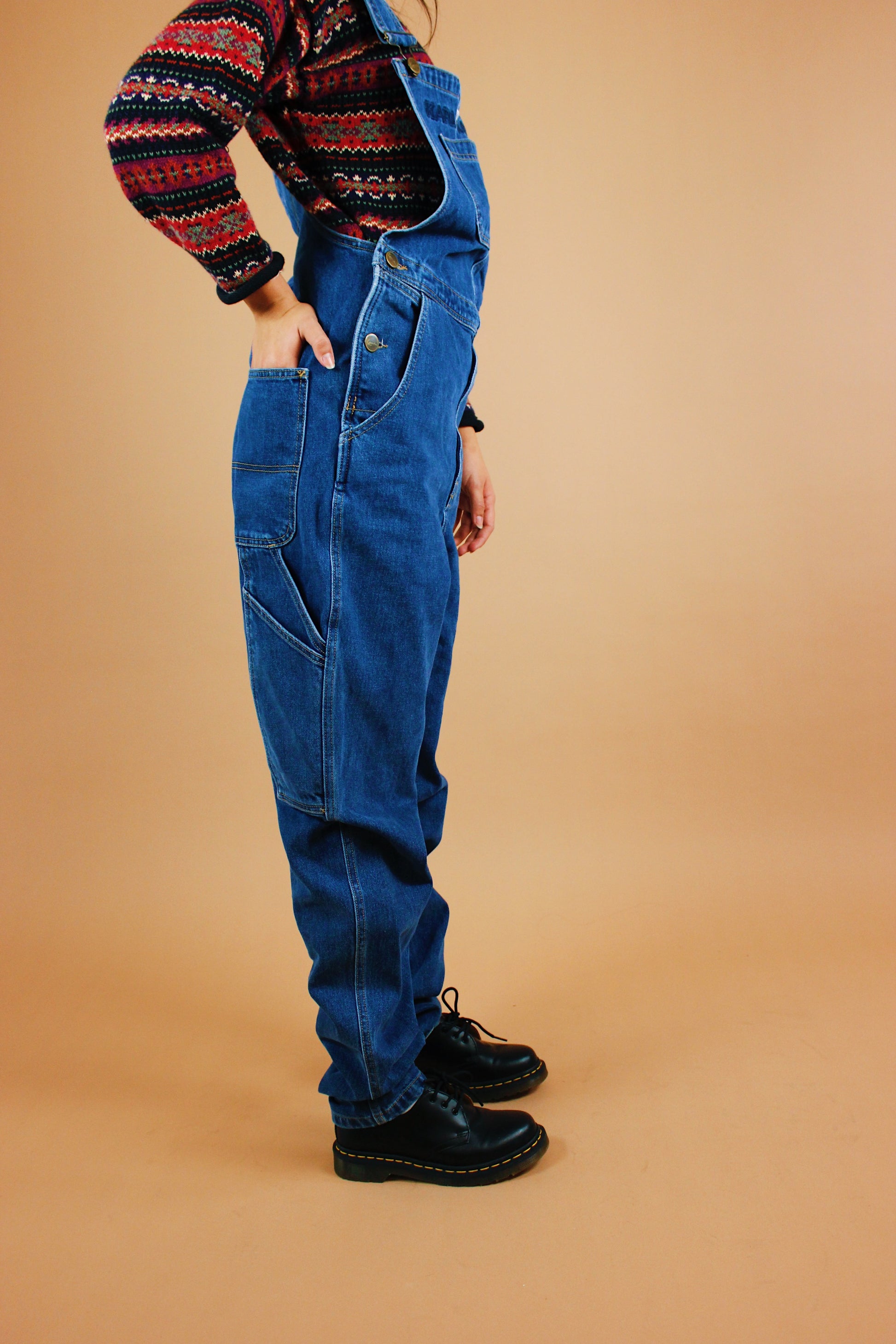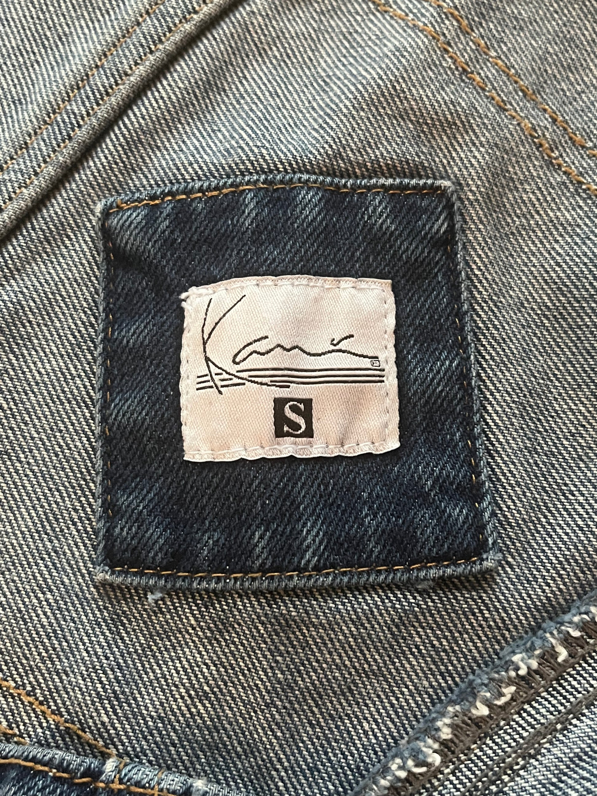 Modern throwback style overalls by the iconic streetwear brand Karl Kani. Dark wash blue denim with an embroidered logo on the bib. Tag size S. Best fits a S-M tall. Seen on Kayla-- fit was long and roomy, straps are shown at max tightness and the bib was pretty loose on her.