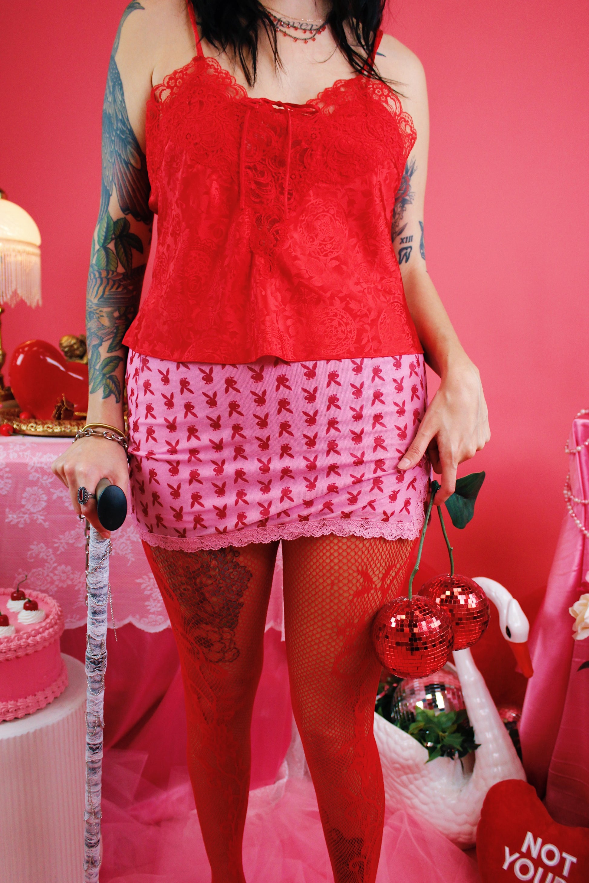 Modern layered mesh mini slip skirt with the iconic playboy bunny print. Love the lace trim and little side slit. Originally from Pacsun. Tag is cut. Best fits a S-M. Seen on Ci.