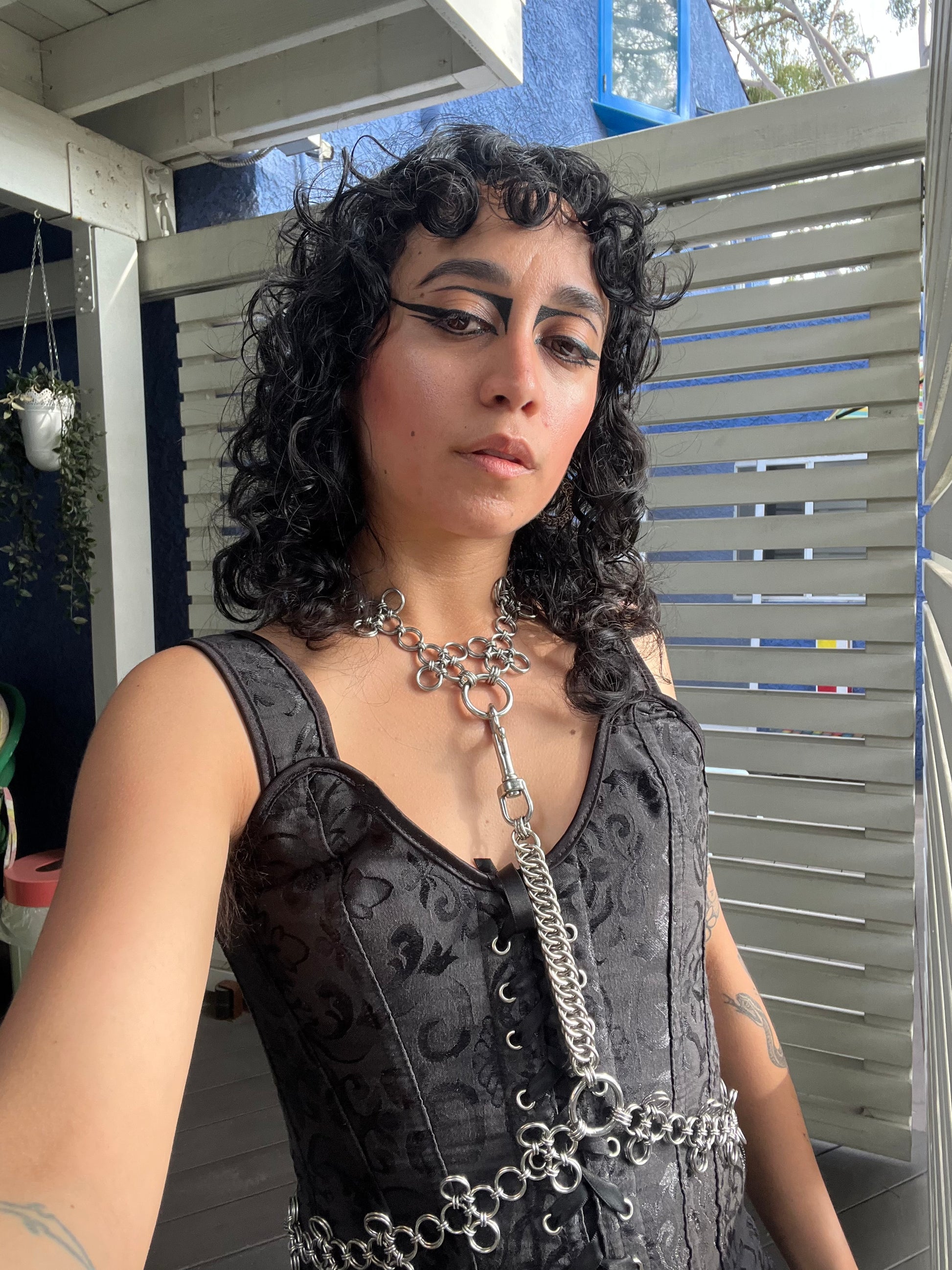 This versatile japanese + persian weave harness attachment is design to be worn in 3 ways-- (1) clipped onto either of our Modulations Chokers, (2) flipped upside down and attached to our Modulations Garter Belt, or (3) styled as a belt!