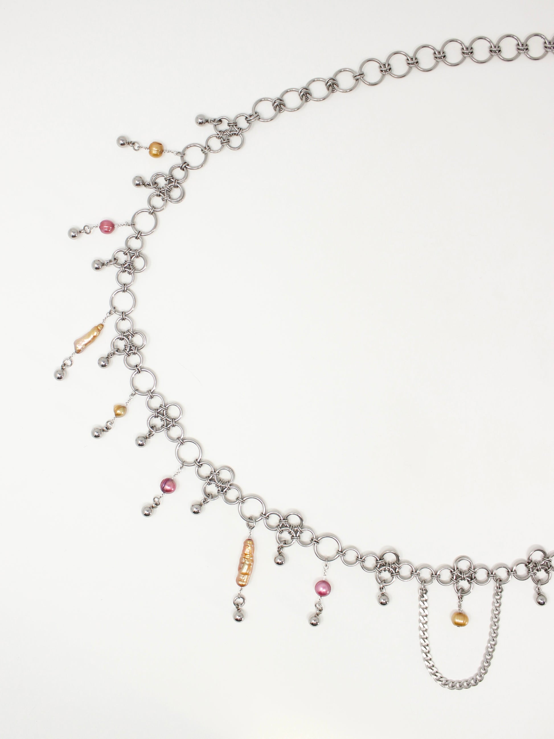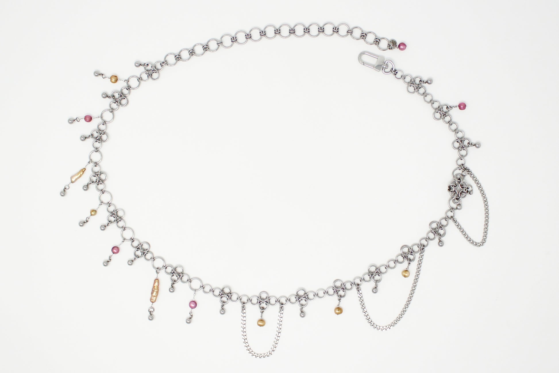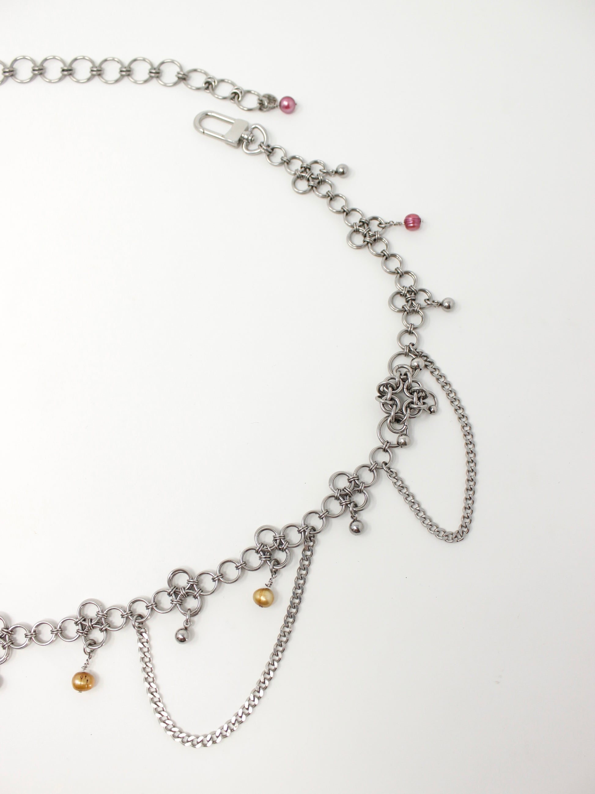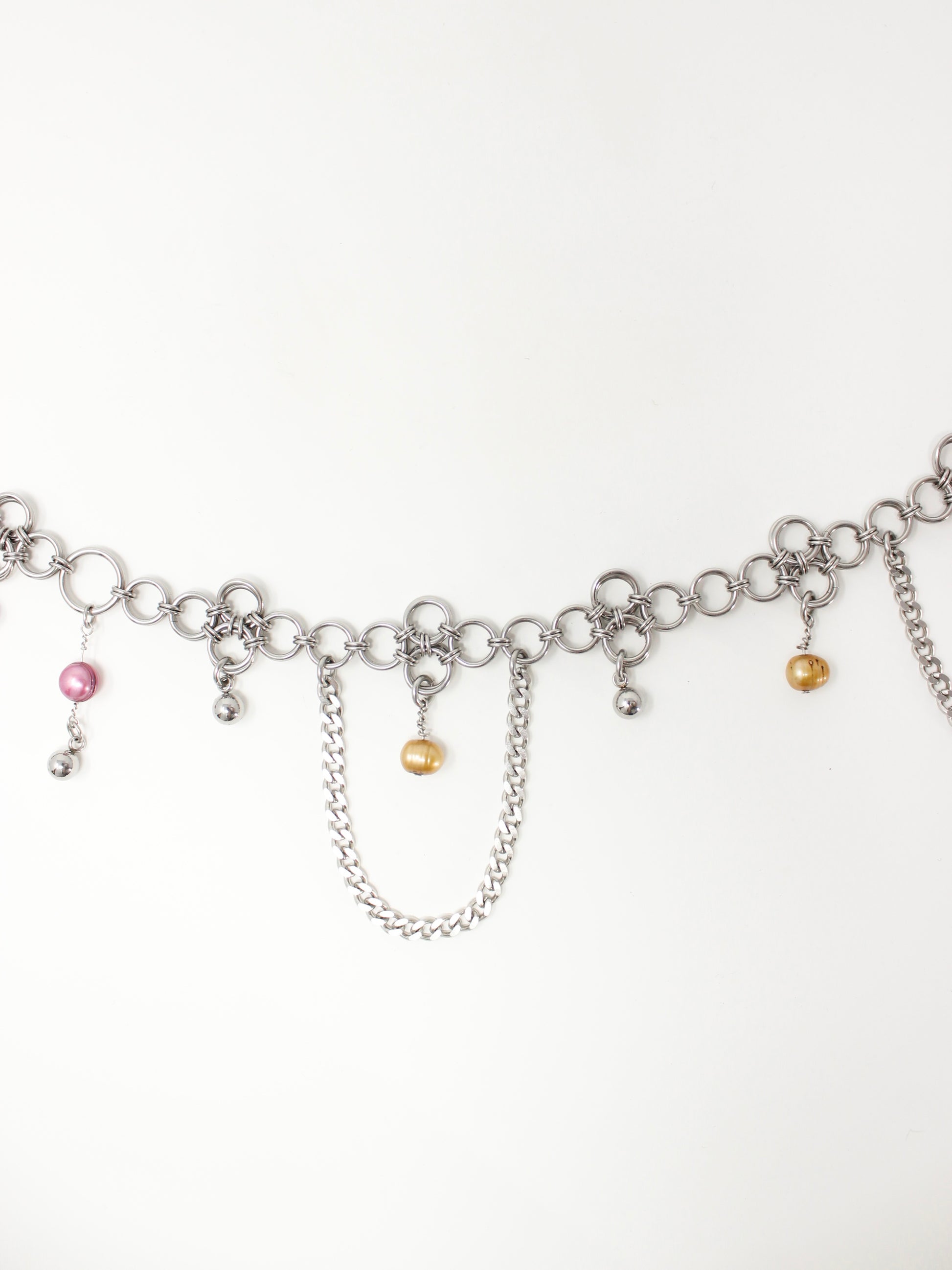 OOAK japanese weave waist chain with sunset tone pearls, steel drops, curb chain, and a celtic star accent.