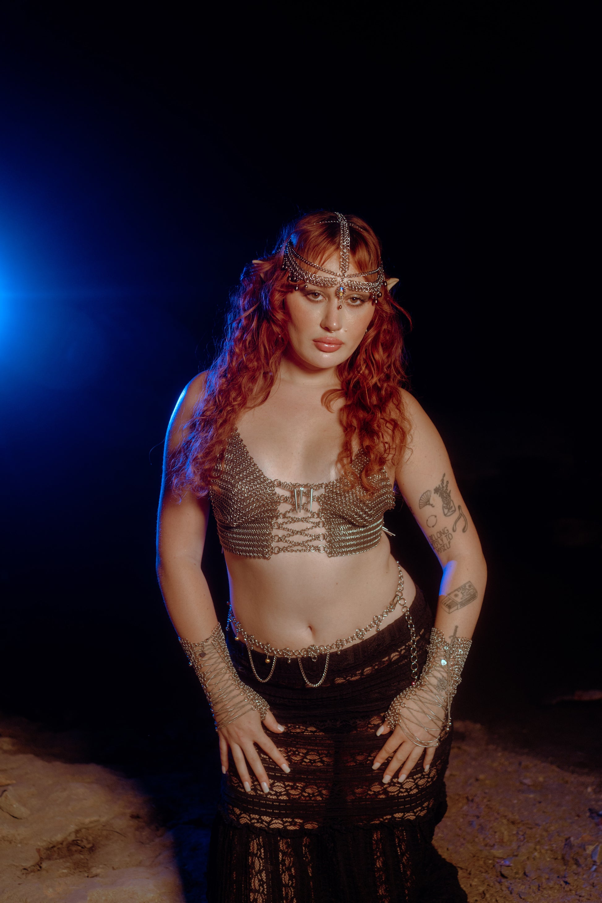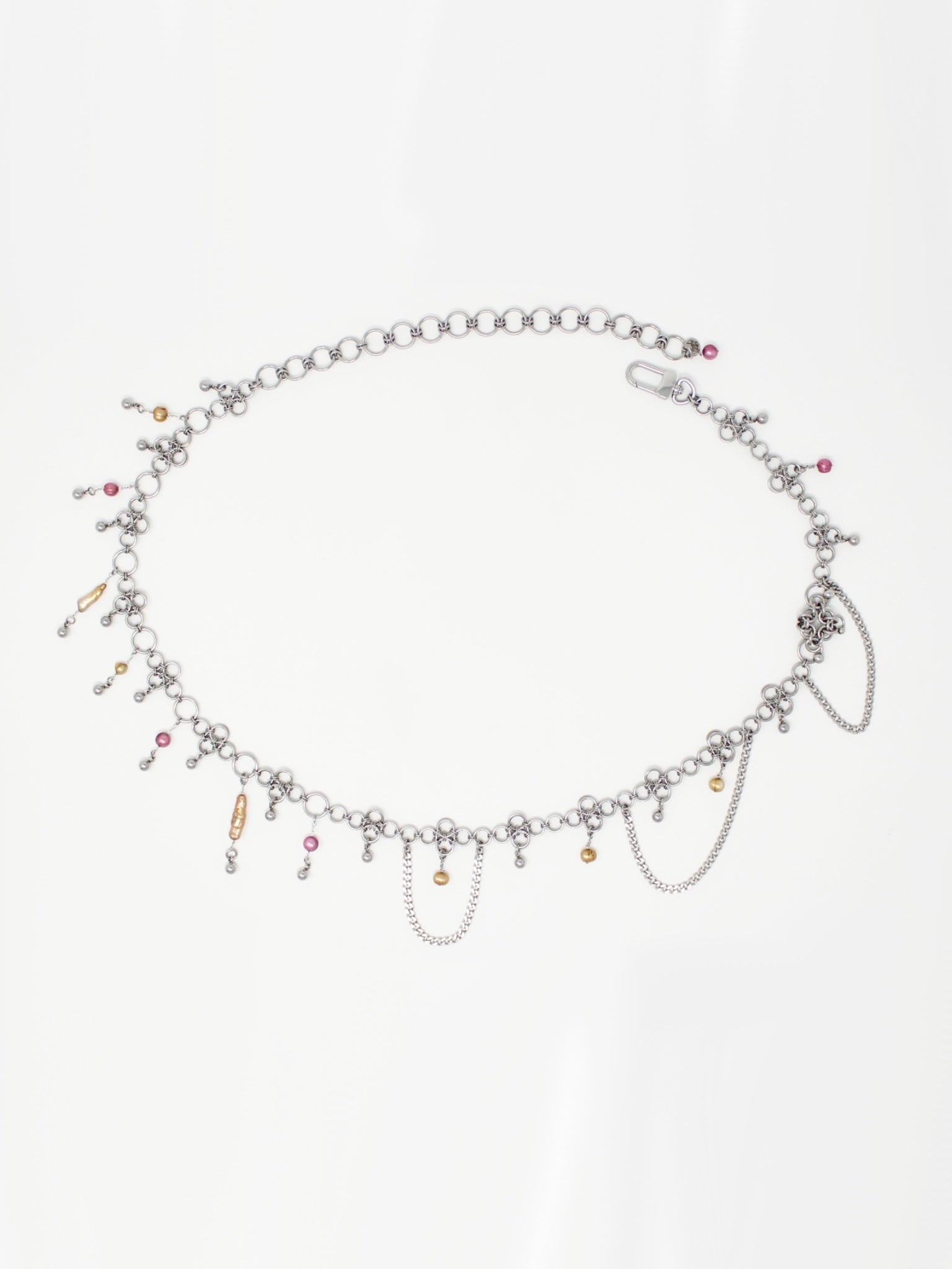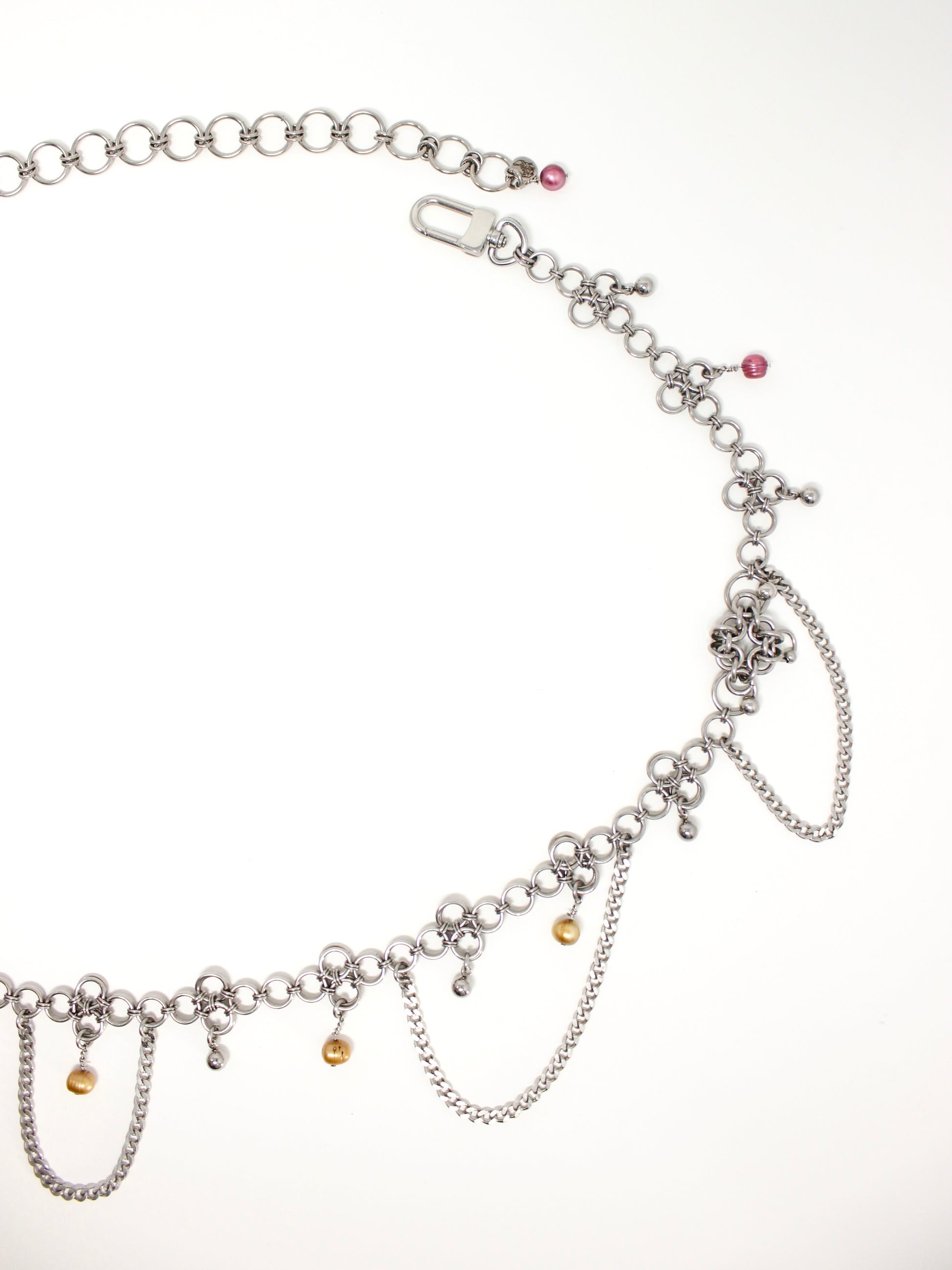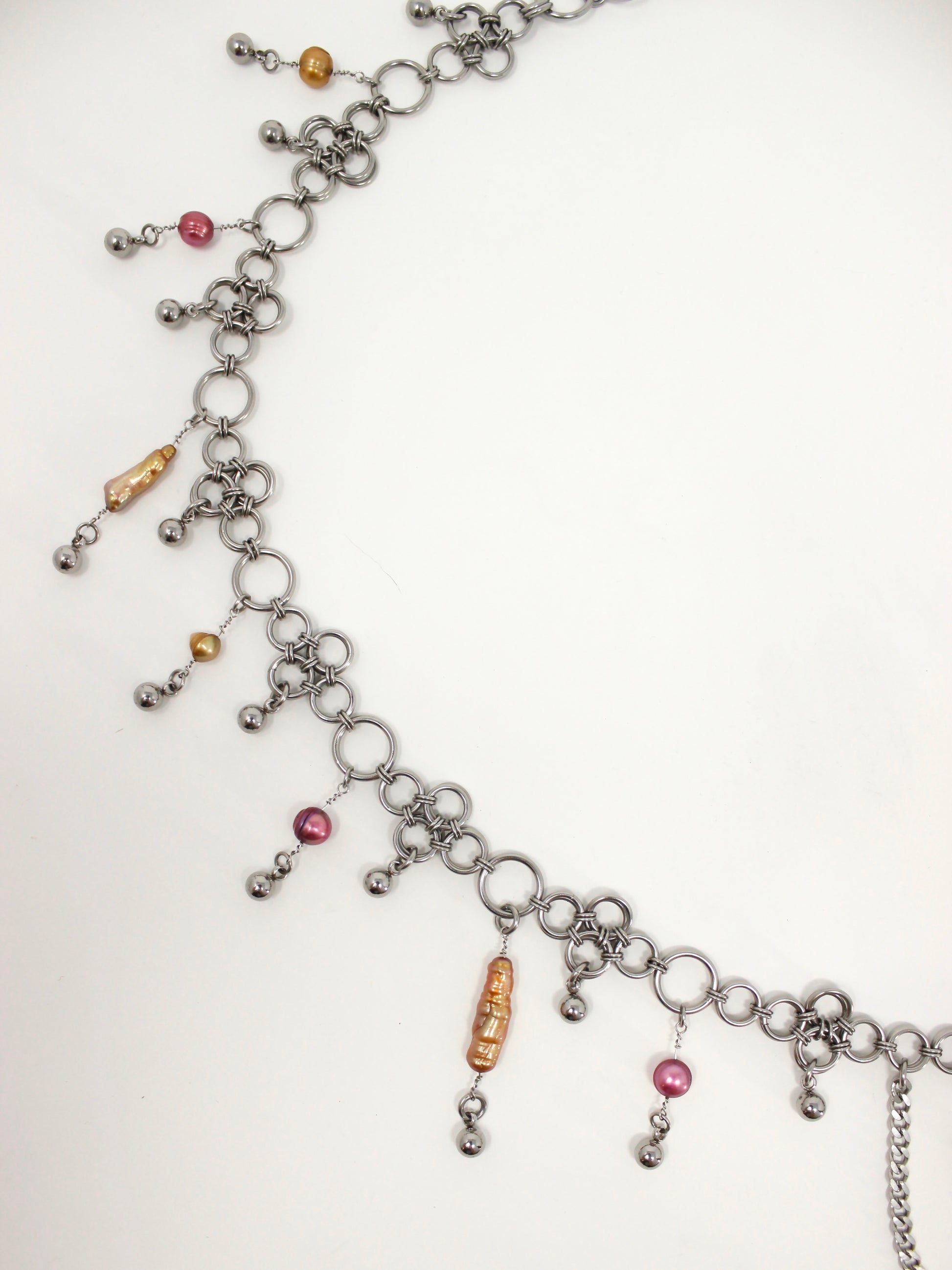 OOAK japanese weave waist chain with sunset tone pearls, steel drops, curb chain, and a celtic star accent.