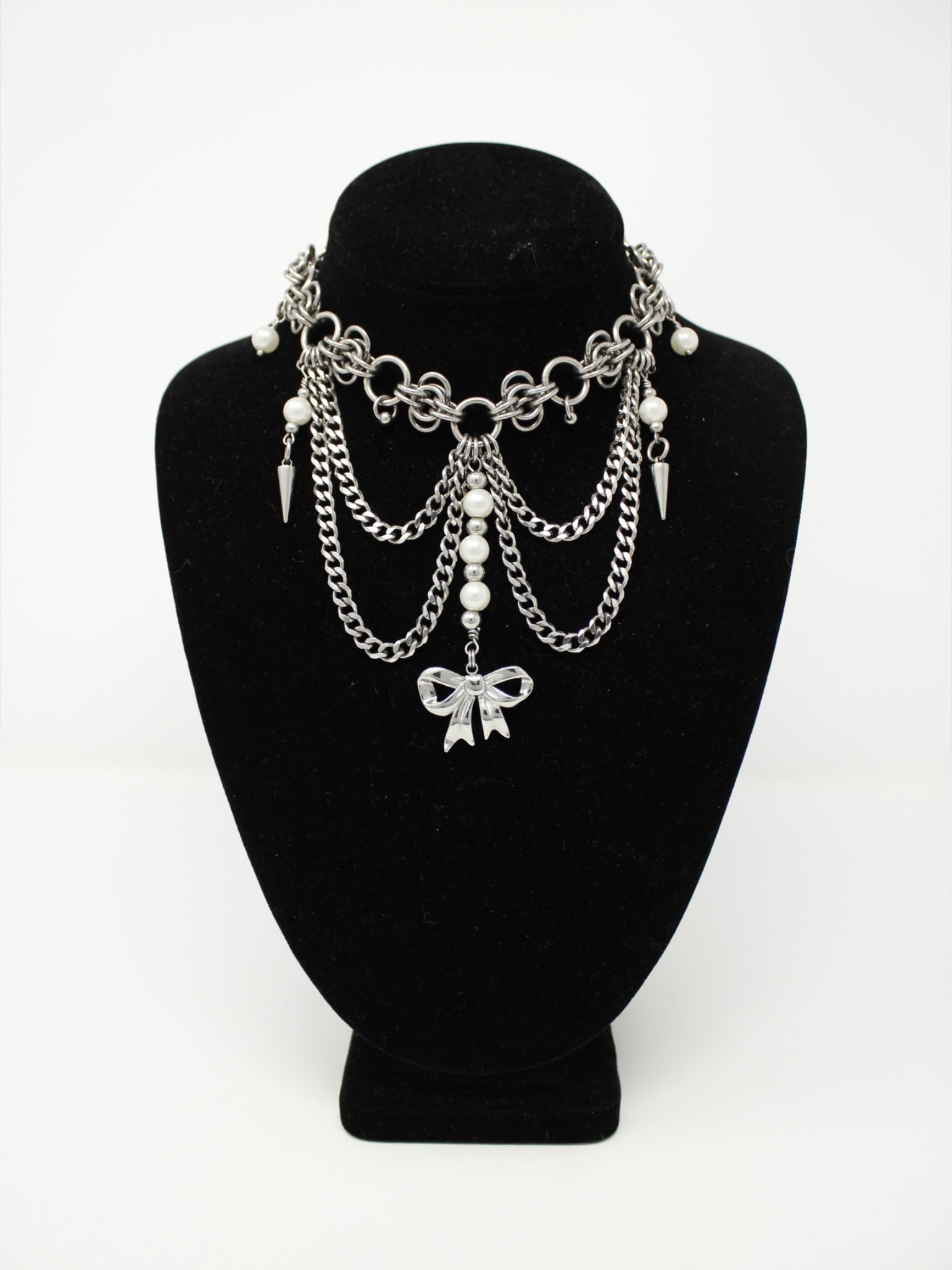 Whimsical neck decor with a touch of light and darkness. Bold rings alternate with a chainmaille weave, accentuated with faux pearl and spike drops, draped chains, captive bead rings, and a steel bow centerpiece.
