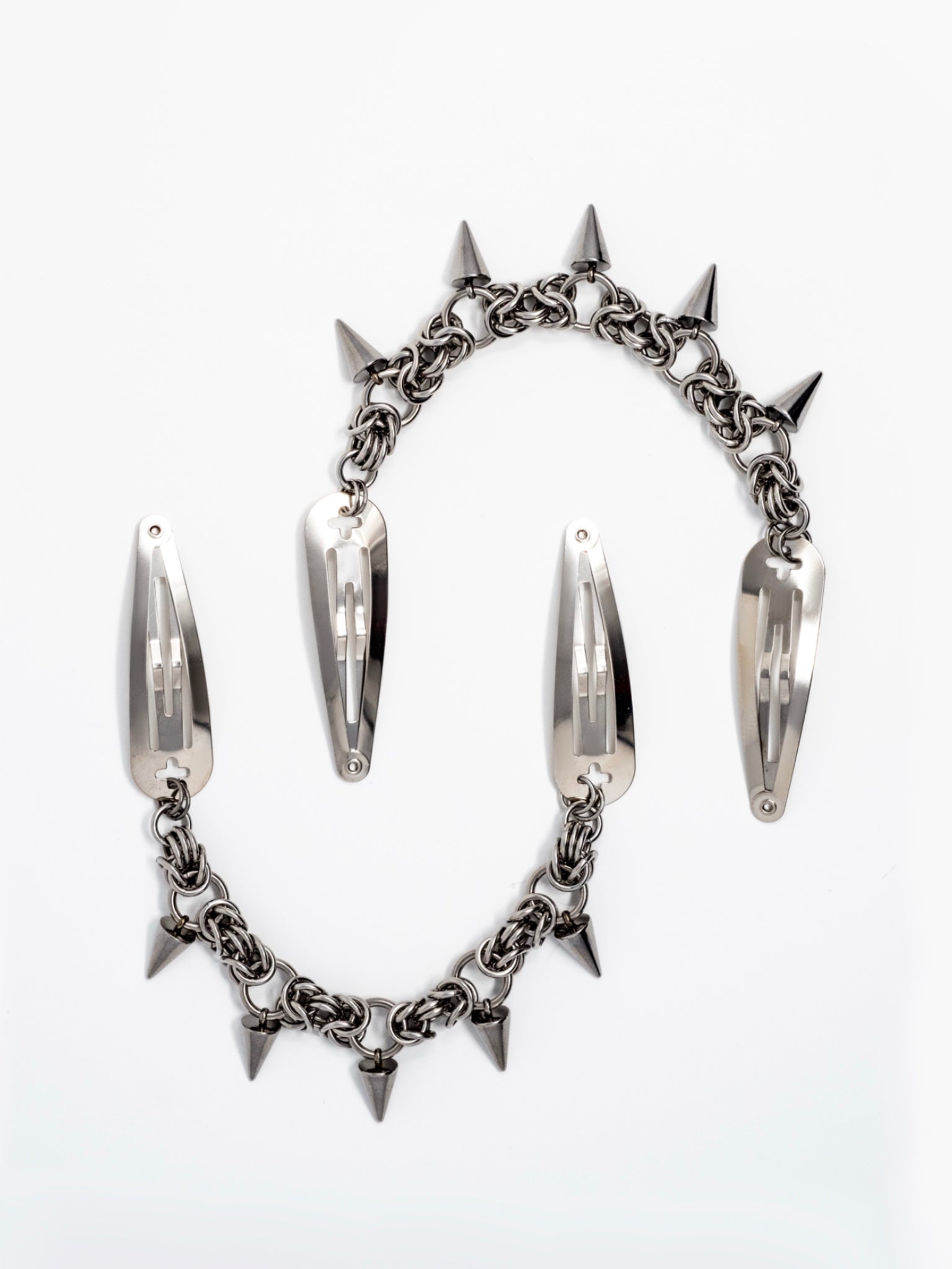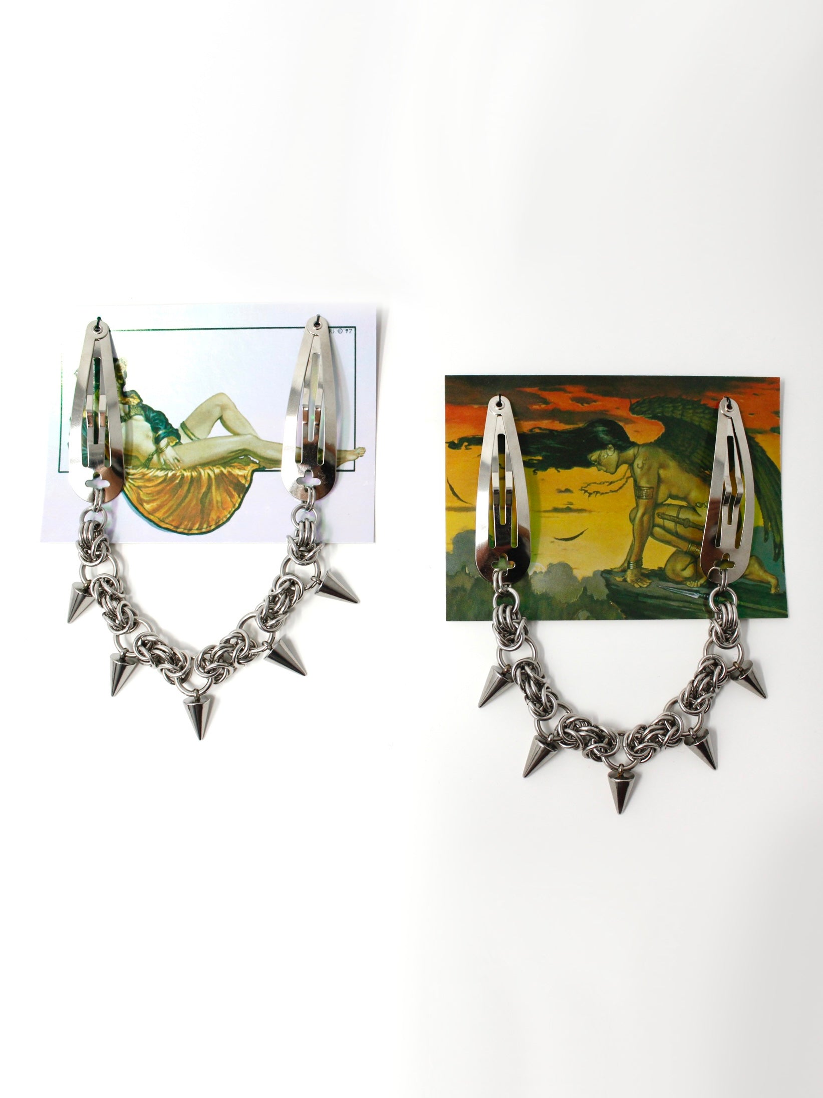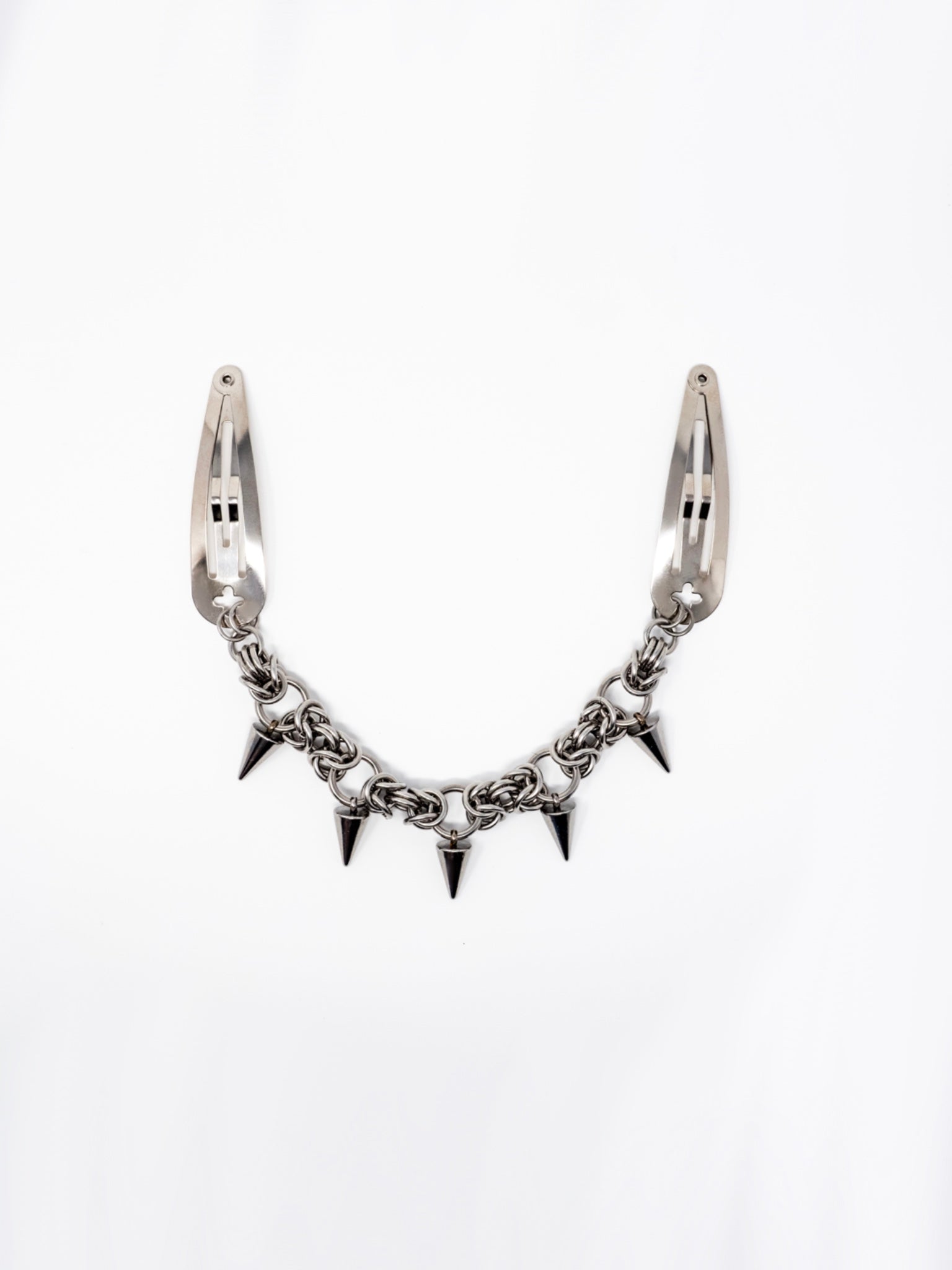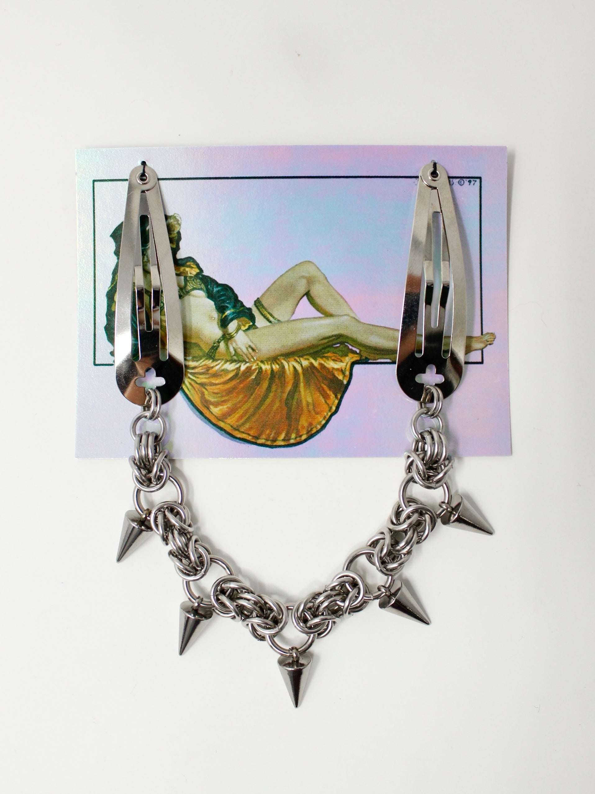 Inspired by the fire element, this jumper hair clip features a byzantine weave chain and short spikes accents