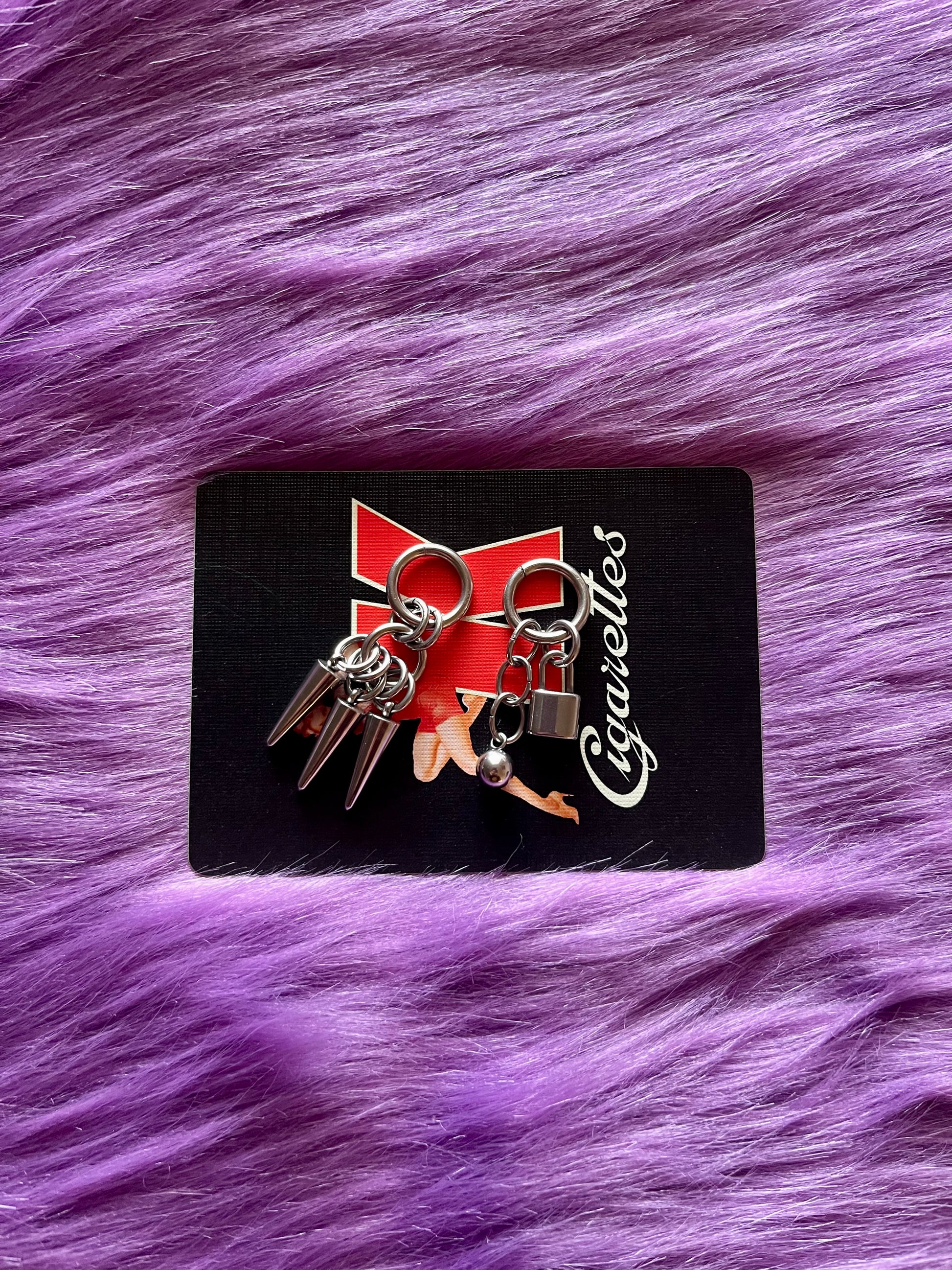 Cutest shoe charms to slide onto your fave stompers! Each pack comes with two charms. One features triple spikes and the other a lock & ball charm. 100% Stainless Steel.